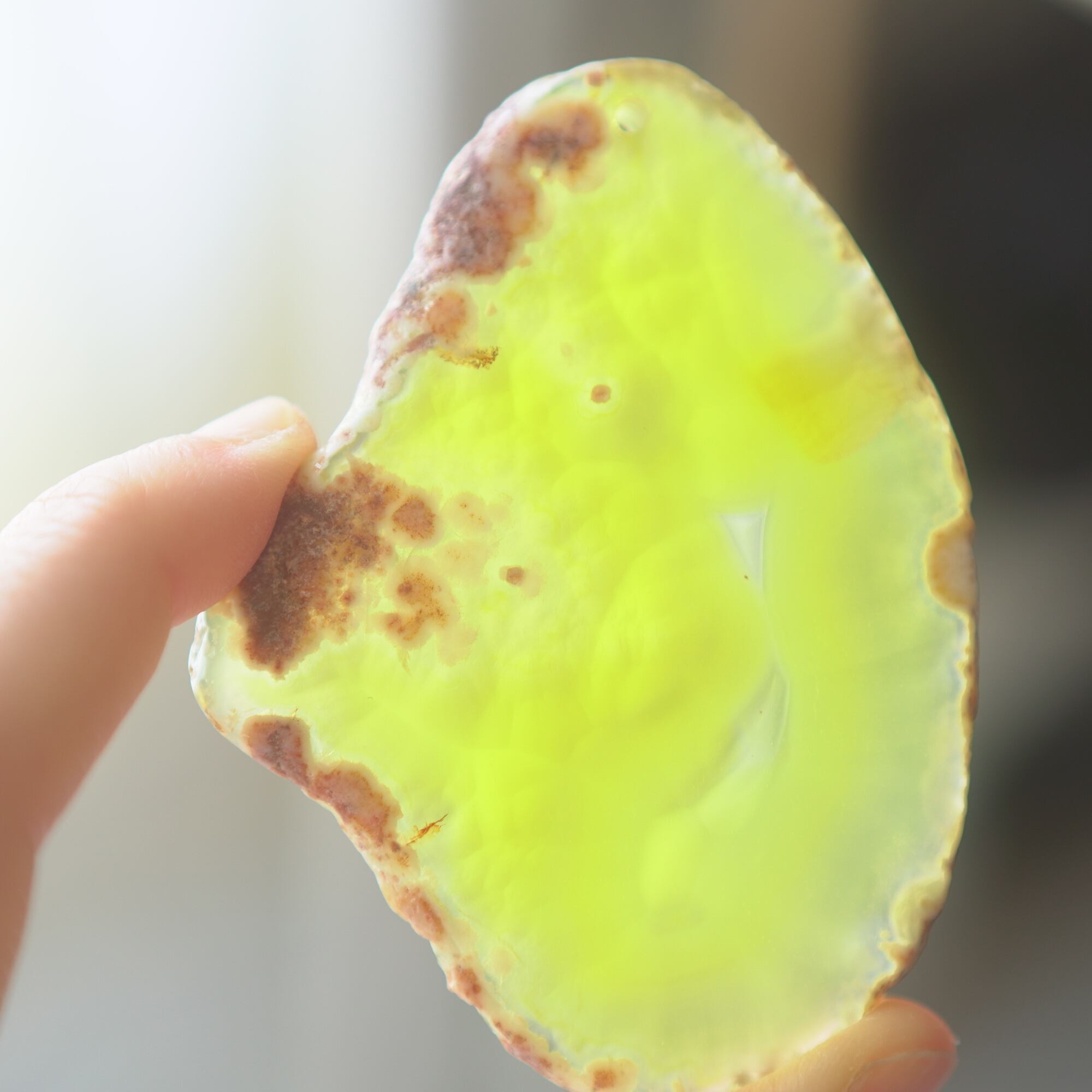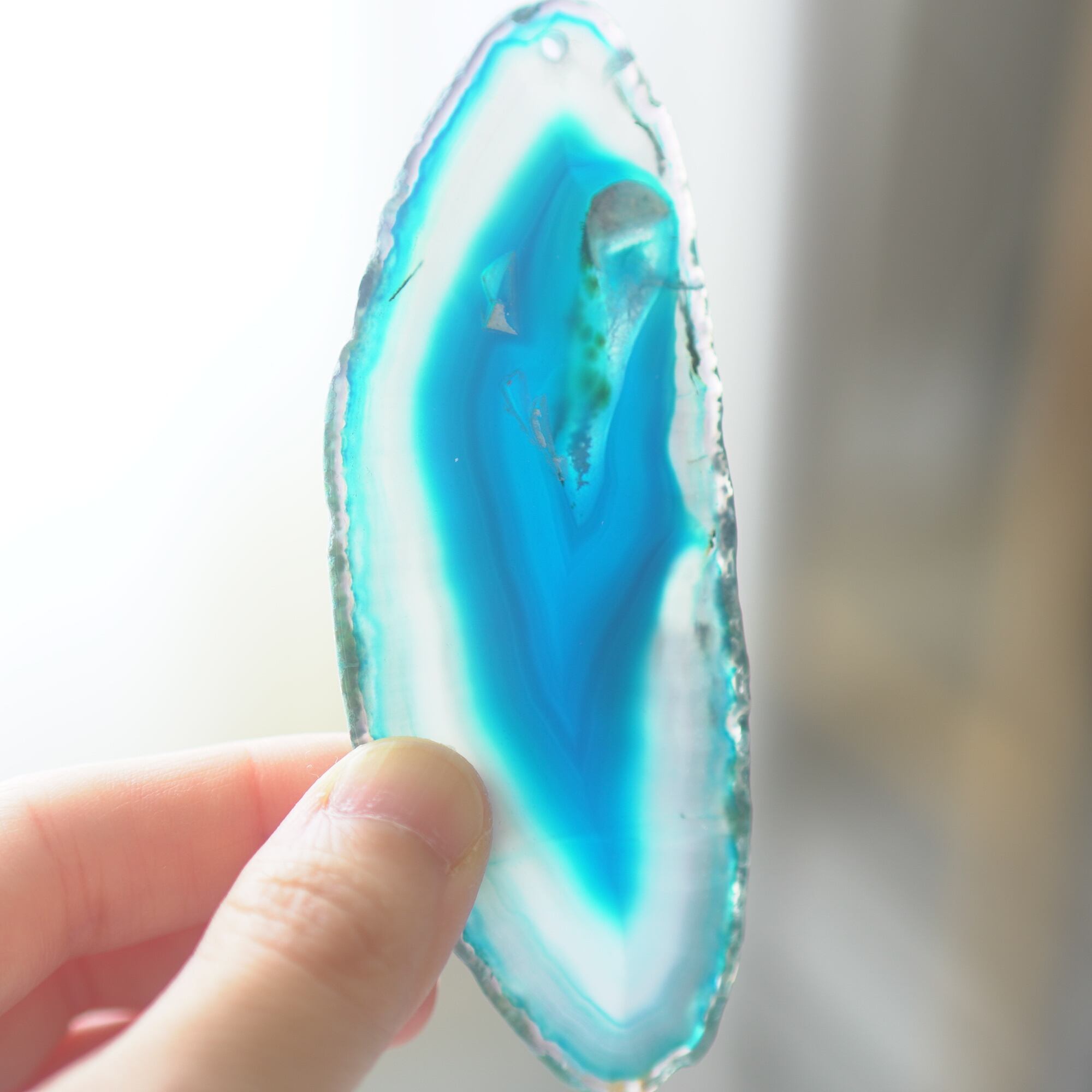 ✧✧✧染色の石なので耐光性(光による経年でのカラー変化の耐性)に優れているわけではなく一日の中で長時間強い日光に当たるような場所に飾られるのはおすすめしないのですが、陽光に透かした時にだけ真価を発揮する美しさがありますので、是非たまに翳したりして光と一緒にお楽しみいただけたらと思っております。特に濃い鮮やかな色など、気になられる場合は、日光のあまり当たらない場所に飾っていただけたらと思います✧✧✧