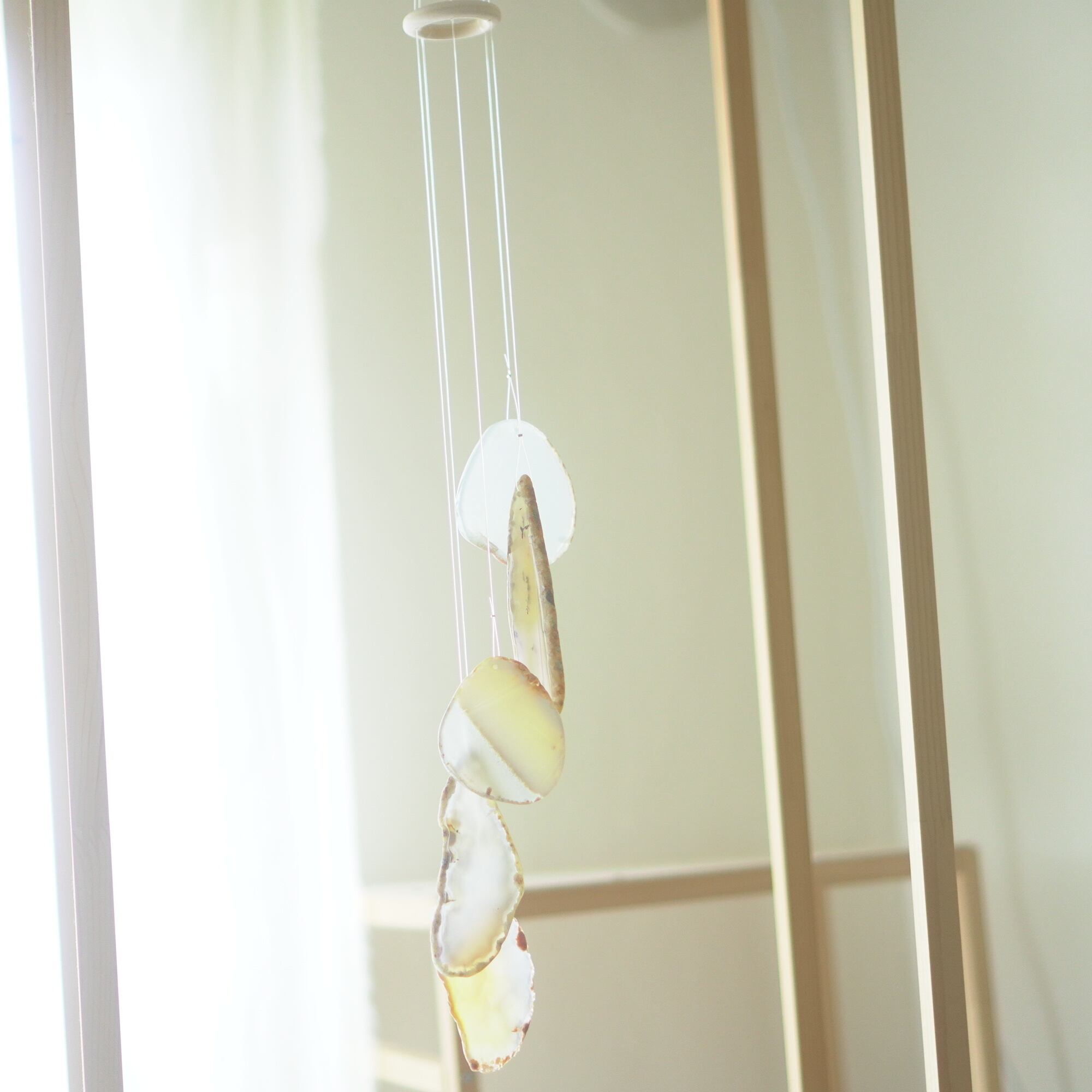 ウィンドチャイムですが、一枚一枚出方の異なるアゲートの個性的な柄は吊るすだけでおしゃれなインテリアにもなりますので、季節問わずおすすめのアイテムです。