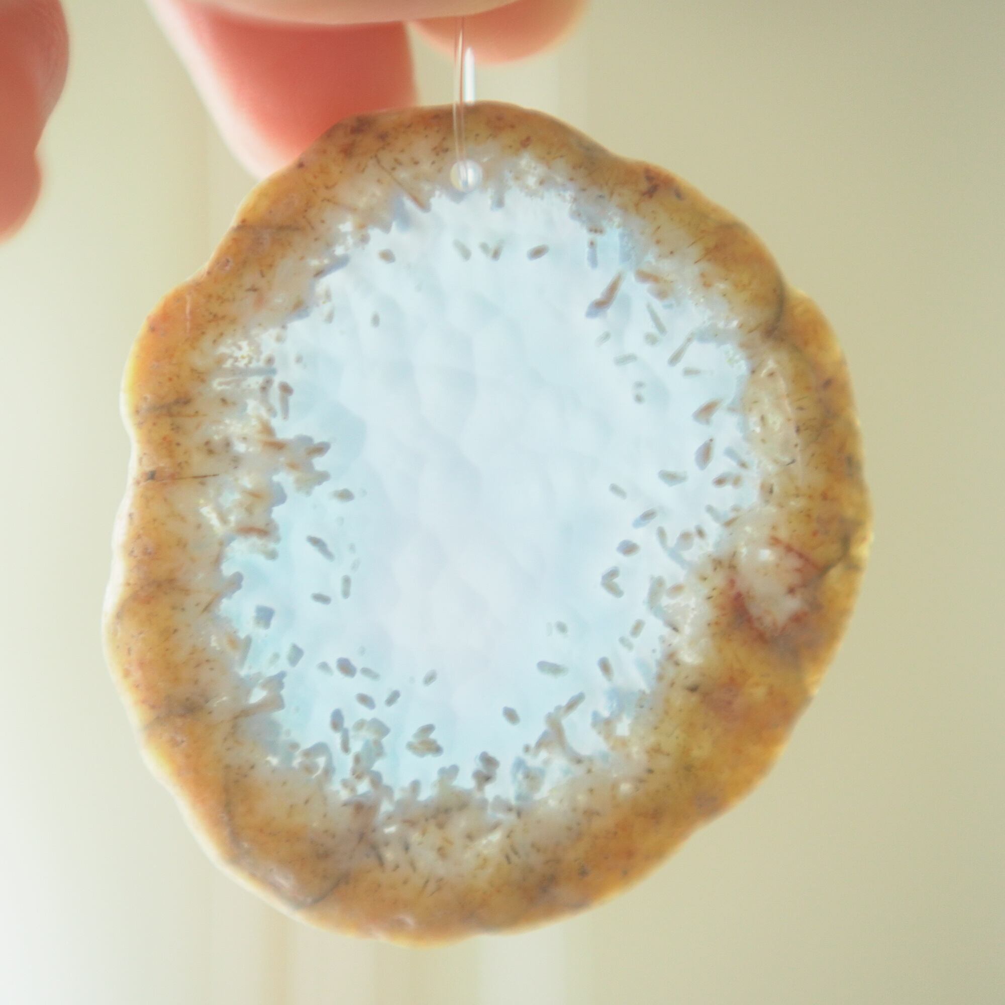 ✧✧✧染色の石なので耐光性(光による経年でのカラー変化の耐性)に優れているわけではなく一日の中で長時間強い日光に当たるような場所に飾られるのはおすすめしないのですが、陽光に透かした時にだけ真価を発揮する美しさがありますので、是非たまに翳したりして光と一緒にお楽しみいただけたらと思っております。特に濃い鮮やかな色など、気になられる場合は、日光のあまり当たらない場所に飾っていただけたらと思います✧✧✧
