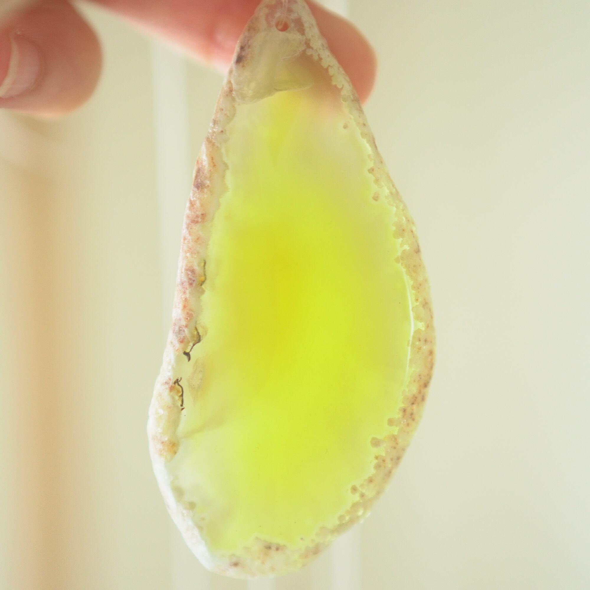 ✧✧✧染色の石なので耐光性(光による経年でのカラー変化の耐性)に優れているわけではなく一日の中で長時間強い日光に当たるような場所に飾られるのはおすすめしないのですが、陽光に透かした時にだけ真価を発揮する美しさがありますので、是非たまに翳したりして光と一緒にお楽しみいただけたらと思っております。特に濃い鮮やかな色など、気になられる場合は、日光のあまり当たらない場所に飾っていただけたらと思います✧✧✧