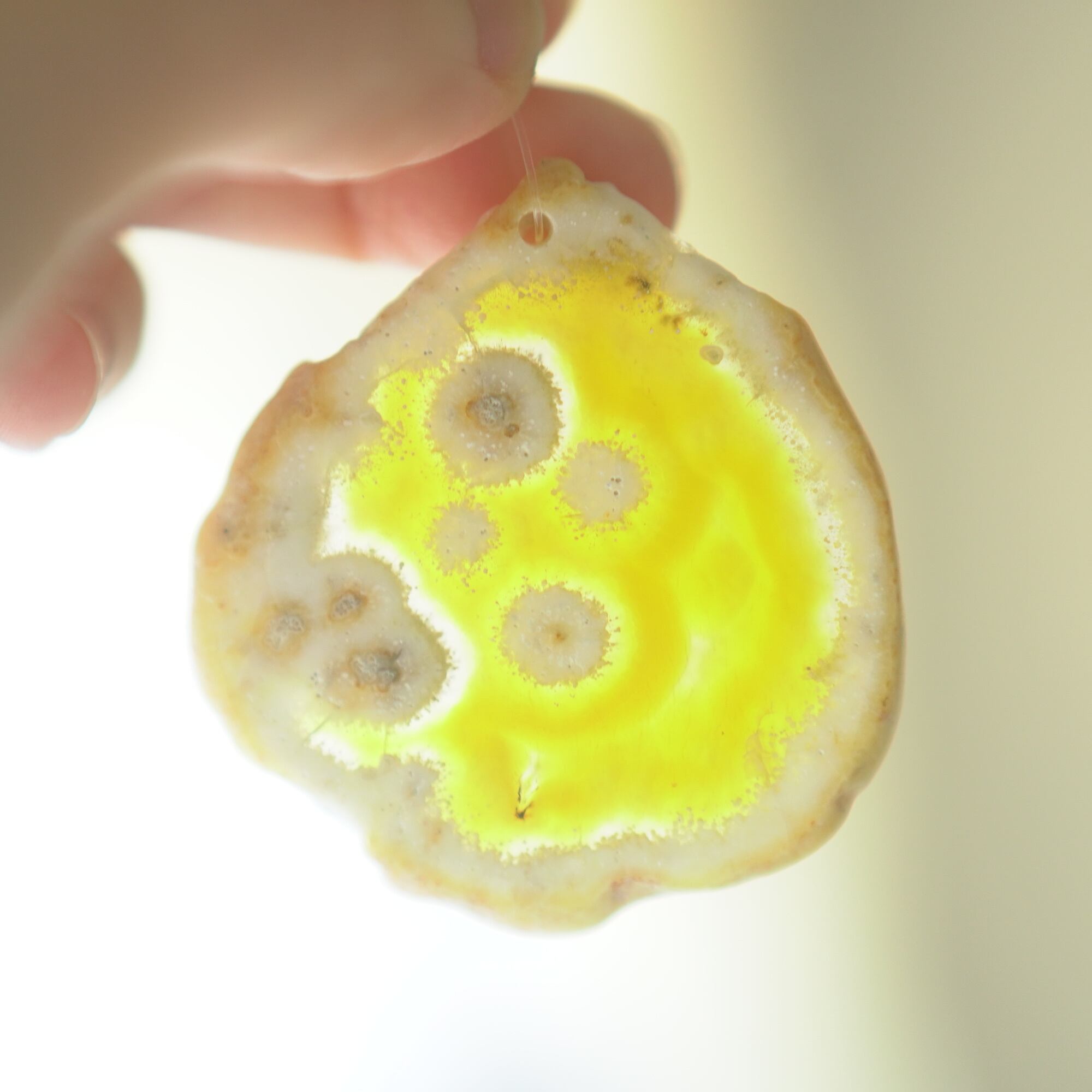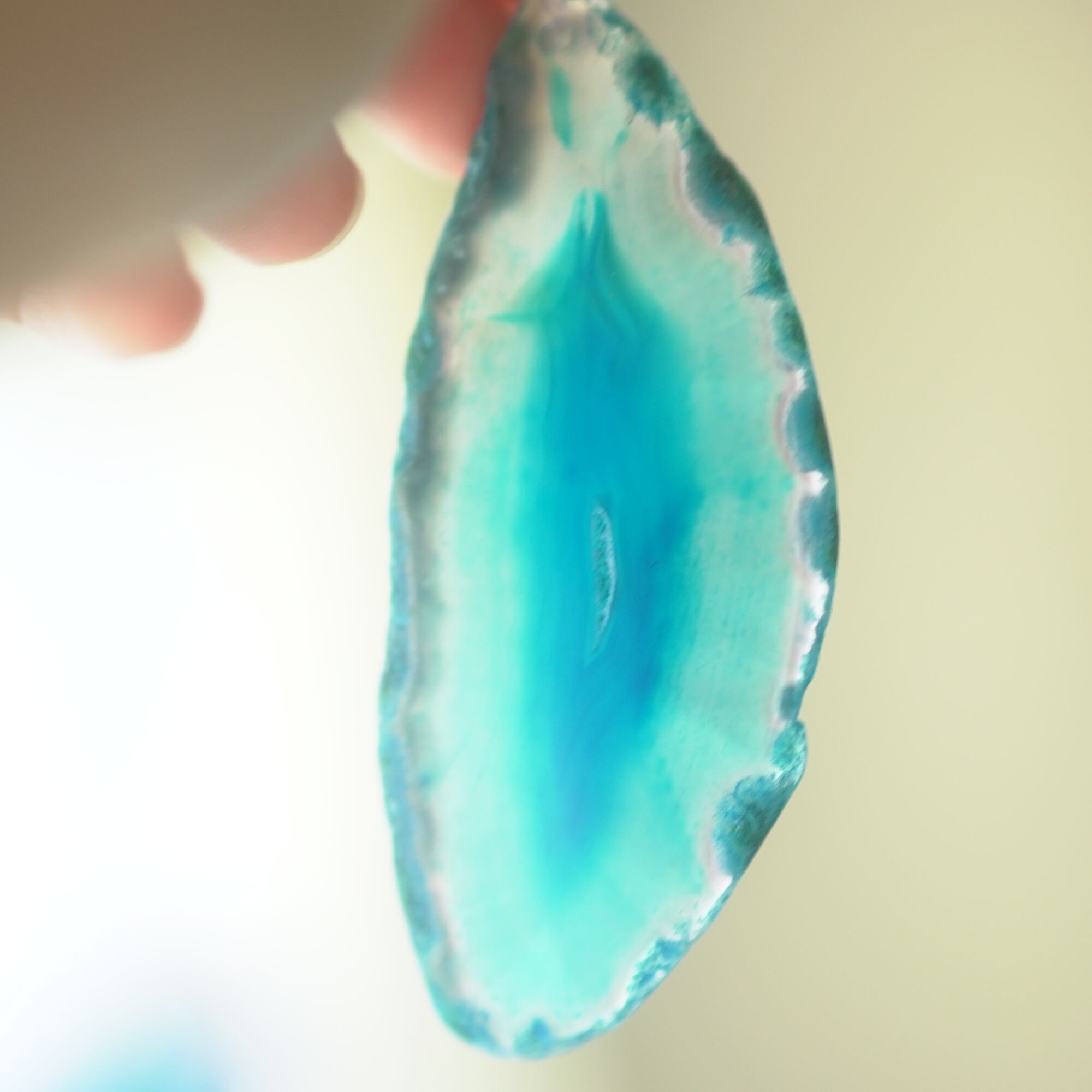 ✧✧✧染色の石なので耐光性(光による経年でのカラー変化の耐性)に優れているわけではなく一日の中で長時間強い日光に当たるような場所に飾られるのはおすすめしないのですが、陽光に透かした時にだけ真価を発揮する美しさがありますので、是非たまに翳したりして光と一緒にお楽しみいただけたらと思っております。特に濃い鮮やかな色など、気になられる場合は、日光のあまり当たらない場所に飾っていただけたらと思います✧✧✧