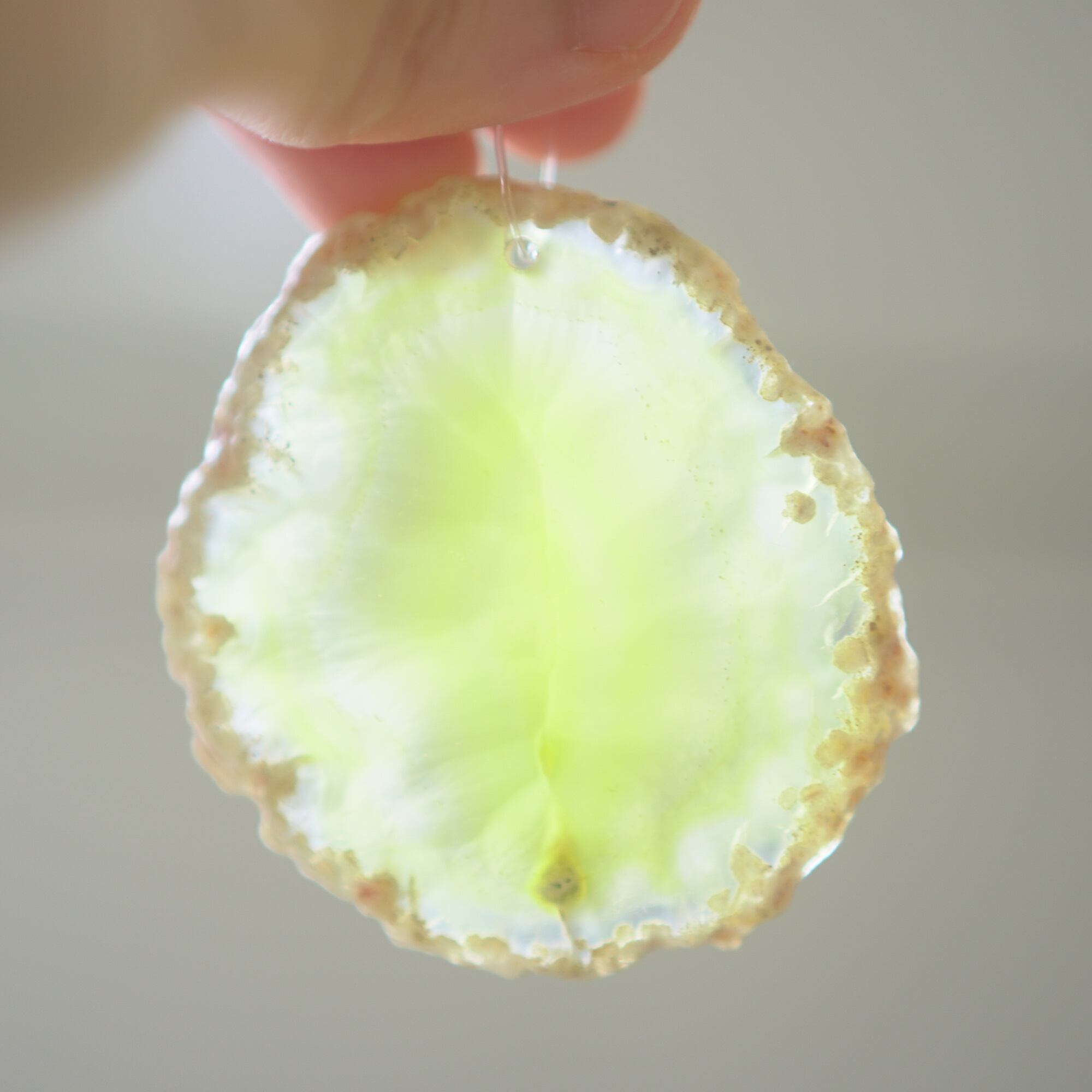 ✧✧✧染色の石なので耐光性(光による経年でのカラー変化の耐性)に優れているわけではなく一日の中で長時間強い日光に当たるような場所に飾られるのはおすすめしないのですが、陽光に透かした時にだけ真価を発揮する美しさがありますので、是非たまに翳したりして光と一緒にお楽しみいただけたらと思っております。特に濃い鮮やかな色など、気になられる場合は、日光のあまり当たらない場所に飾っていただけたらと思います✧✧✧