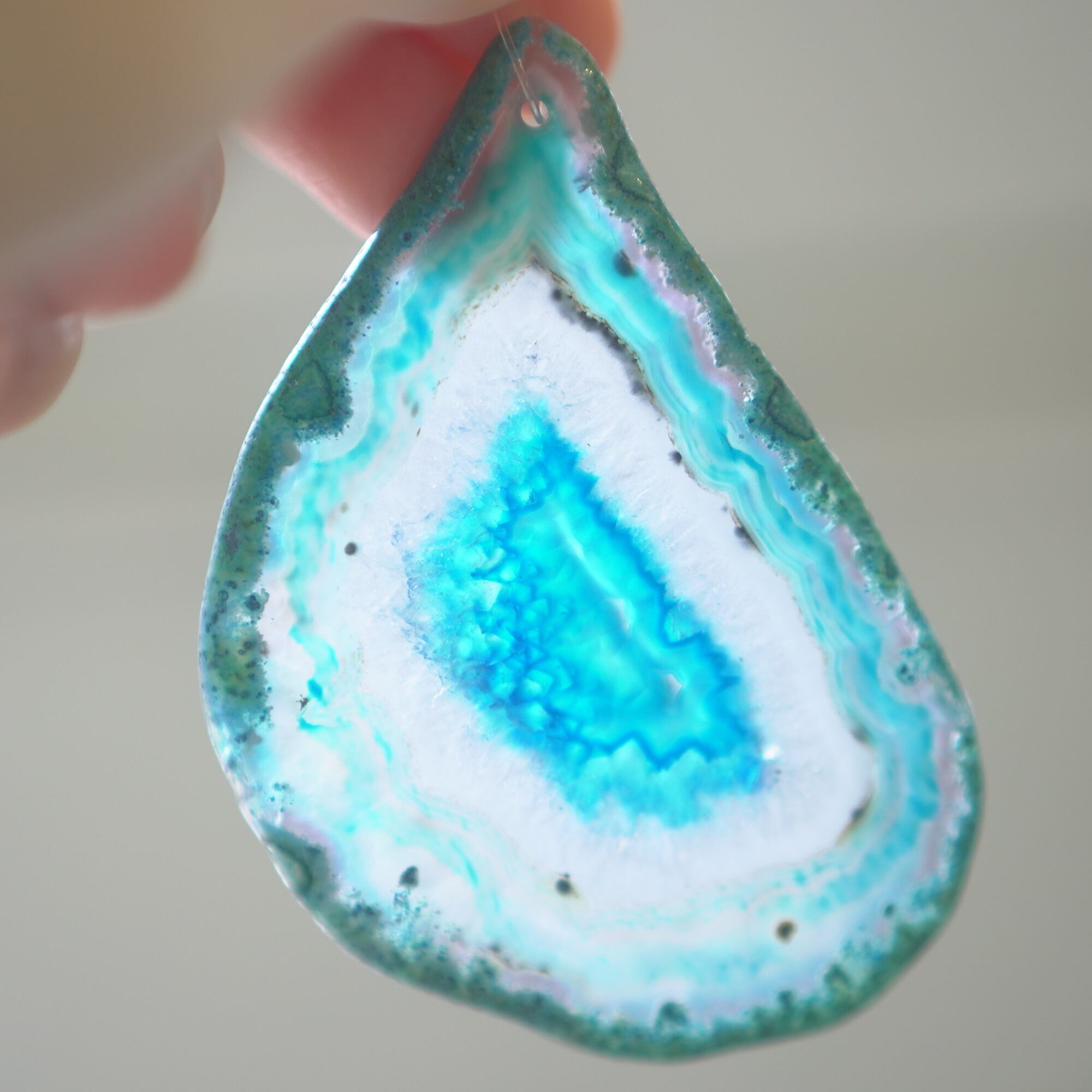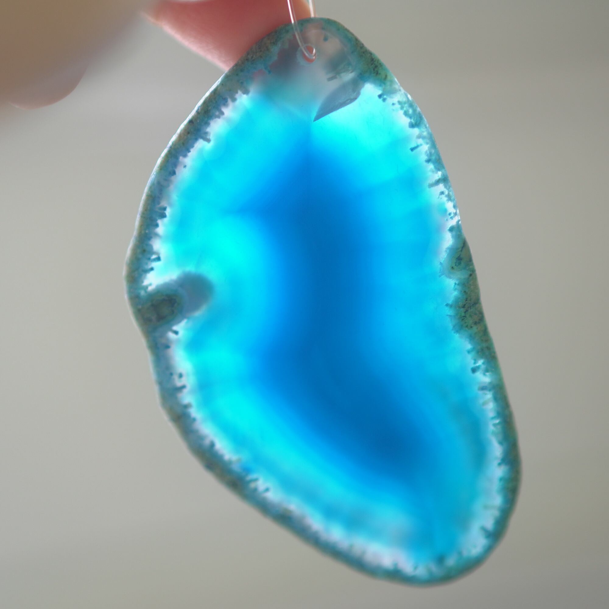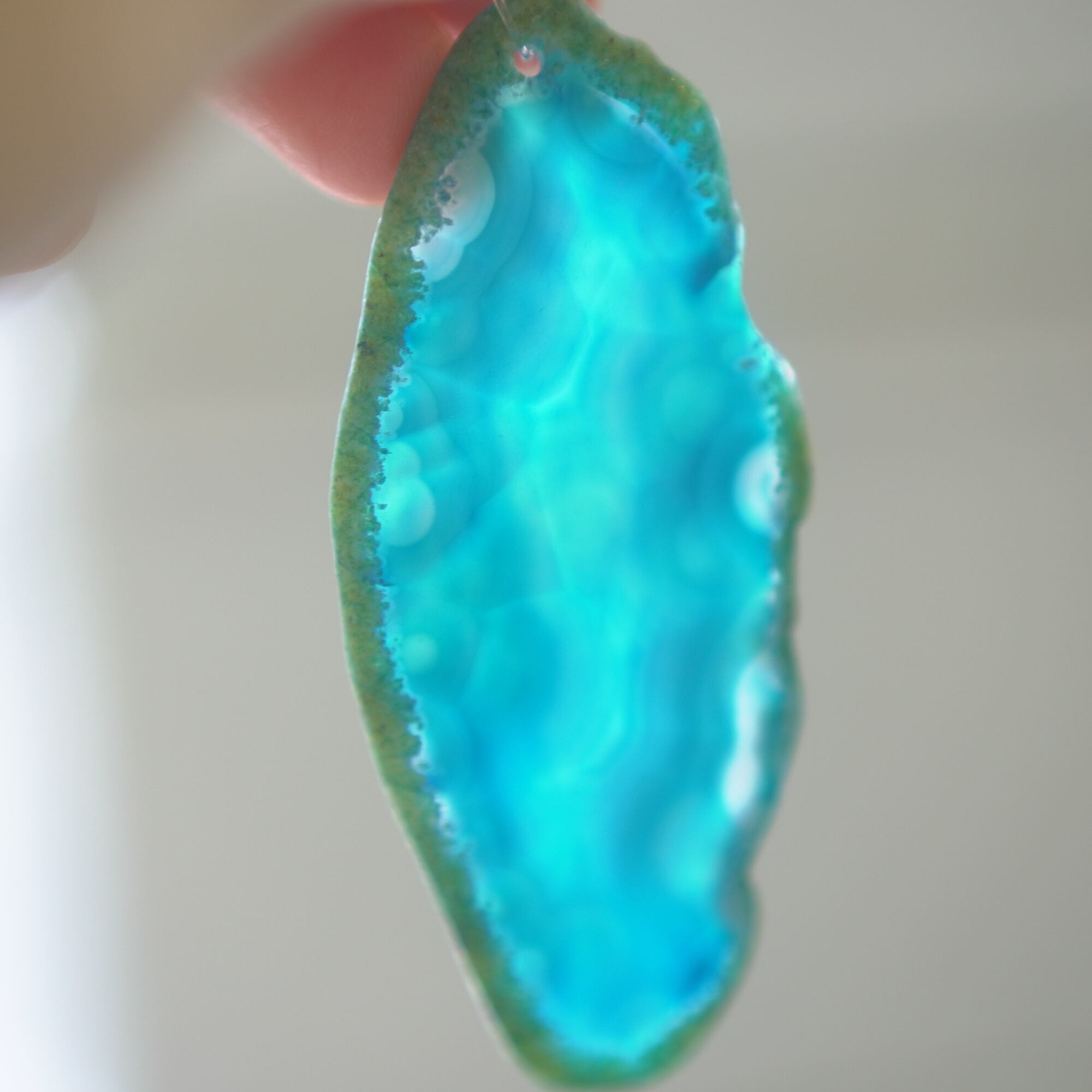 ✧✧✧染色の石なので耐光性(光による経年でのカラー変化の耐性)に優れているわけではなく一日の中で長時間強い日光に当たるような場所に飾られるのはおすすめしないのですが、陽光に透かした時にだけ真価を発揮する美しさがありますので、是非たまに翳したりして光と一緒にお楽しみいただけたらと思っております。特に濃い鮮やかな色など、気になられる場合は、日光のあまり当たらない場所に飾っていただけたらと思います✧✧✧