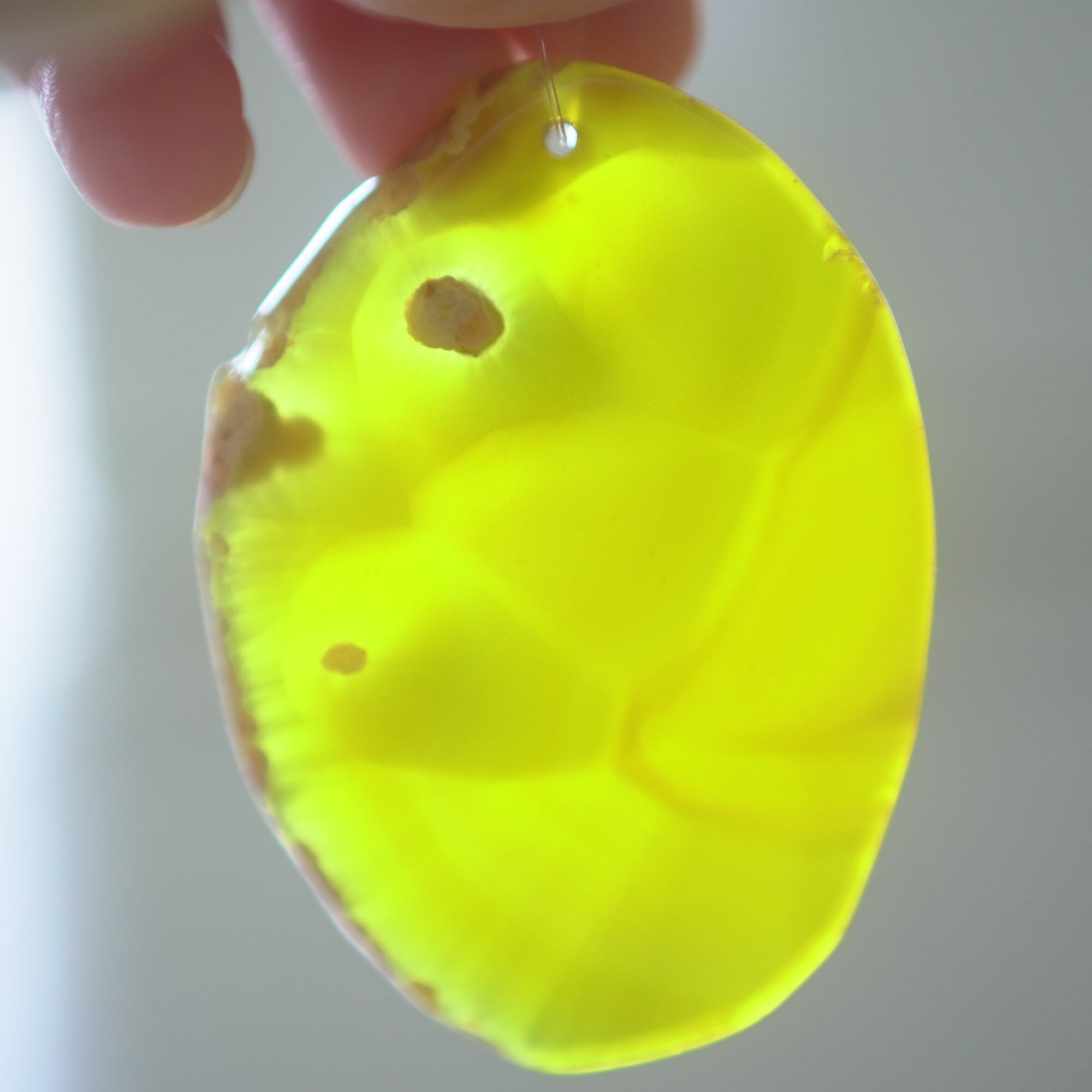 ✧✧✧染色の石なので耐光性(光による経年でのカラー変化の耐性)に優れているわけではなく一日の中で長時間強い日光に当たるような場所に飾られるのはおすすめしないのですが、陽光に透かした時にだけ真価を発揮する美しさがありますので、是非たまに翳したりして光と一緒にお楽しみいただけたらと思っております。特に濃い鮮やかな色など、気になられる場合は、日光のあまり当たらない場所に飾っていただけたらと思います✧✧✧