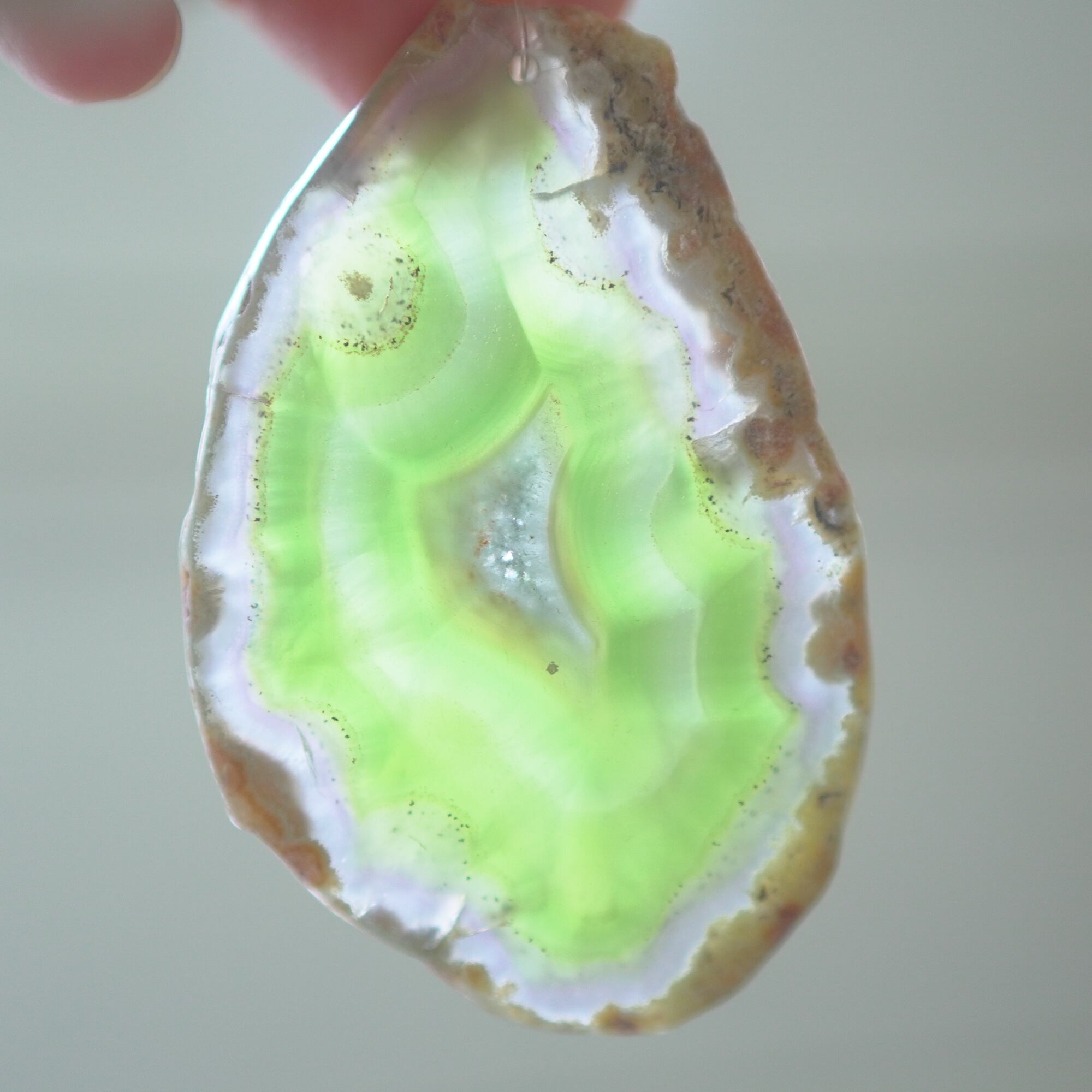 ✧✧✧染色の石なので耐光性(光による経年でのカラー変化の耐性)に優れているわけではなく一日の中で長時間強い日光に当たるような場所に飾られるのはおすすめしないのですが、陽光に透かした時にだけ真価を発揮する美しさがありますので、是非たまに翳したりして光と一緒にお楽しみいただけたらと思っております。特に濃い鮮やかな色など、気になられる場合は、日光のあまり当たらない場所に飾っていただけたらと思います✧✧✧