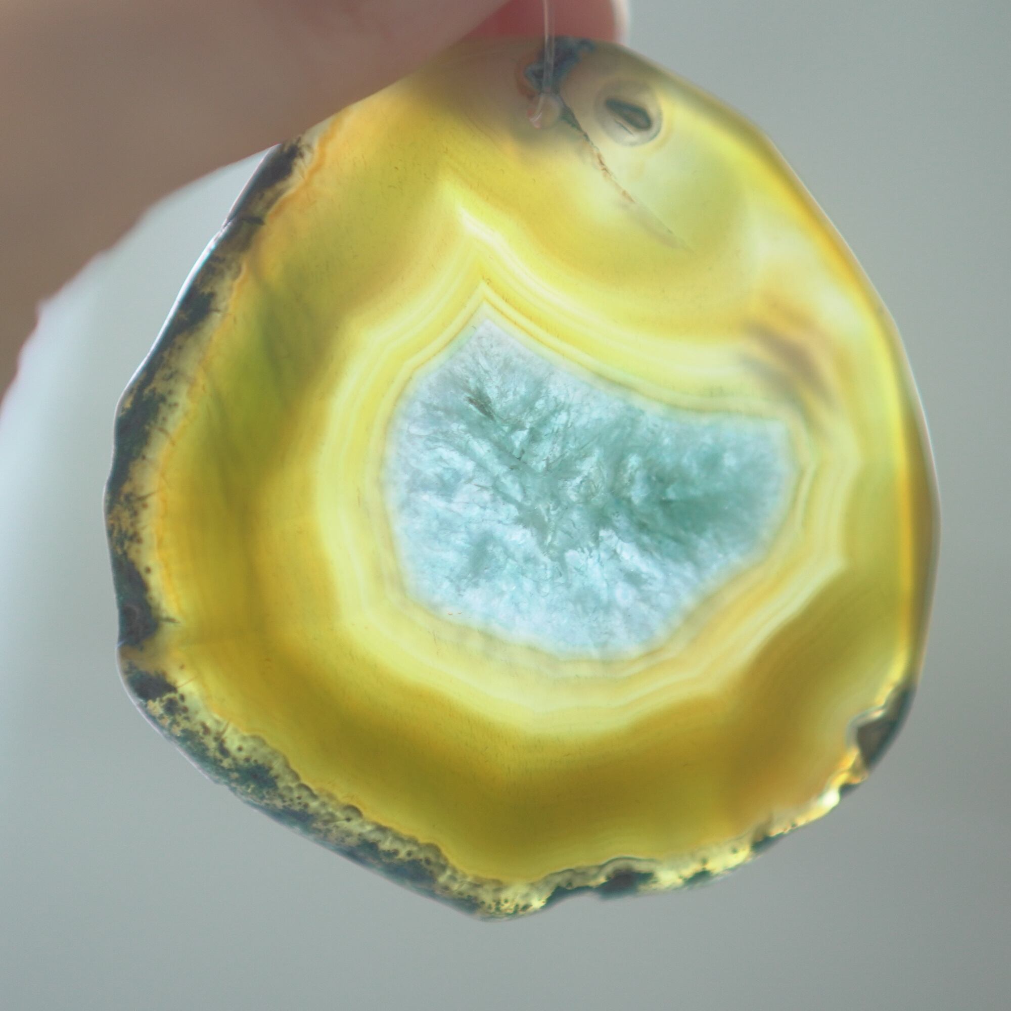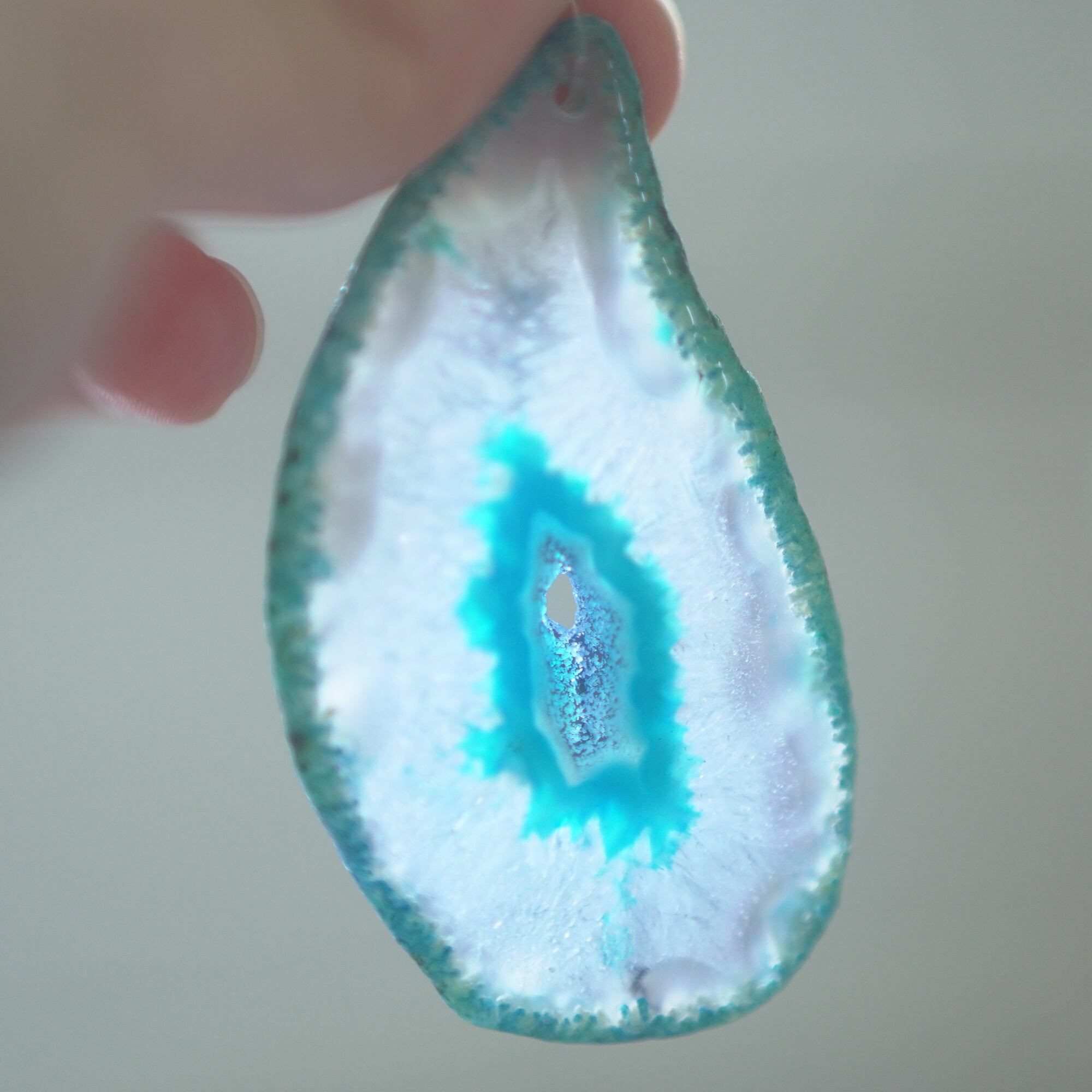 ✧✧✧染色の石なので耐光性(光による経年でのカラー変化の耐性)に優れているわけではなく一日の中で長時間強い日光に当たるような場所に飾られるのはおすすめしないのですが、陽光に透かした時にだけ真価を発揮する美しさがありますので、是非たまに翳したりして光と一緒にお楽しみいただけたらと思っております。特に濃い鮮やかな色など、気になられる場合は、日光のあまり当たらない場所に飾っていただけたらと思います✧✧✧