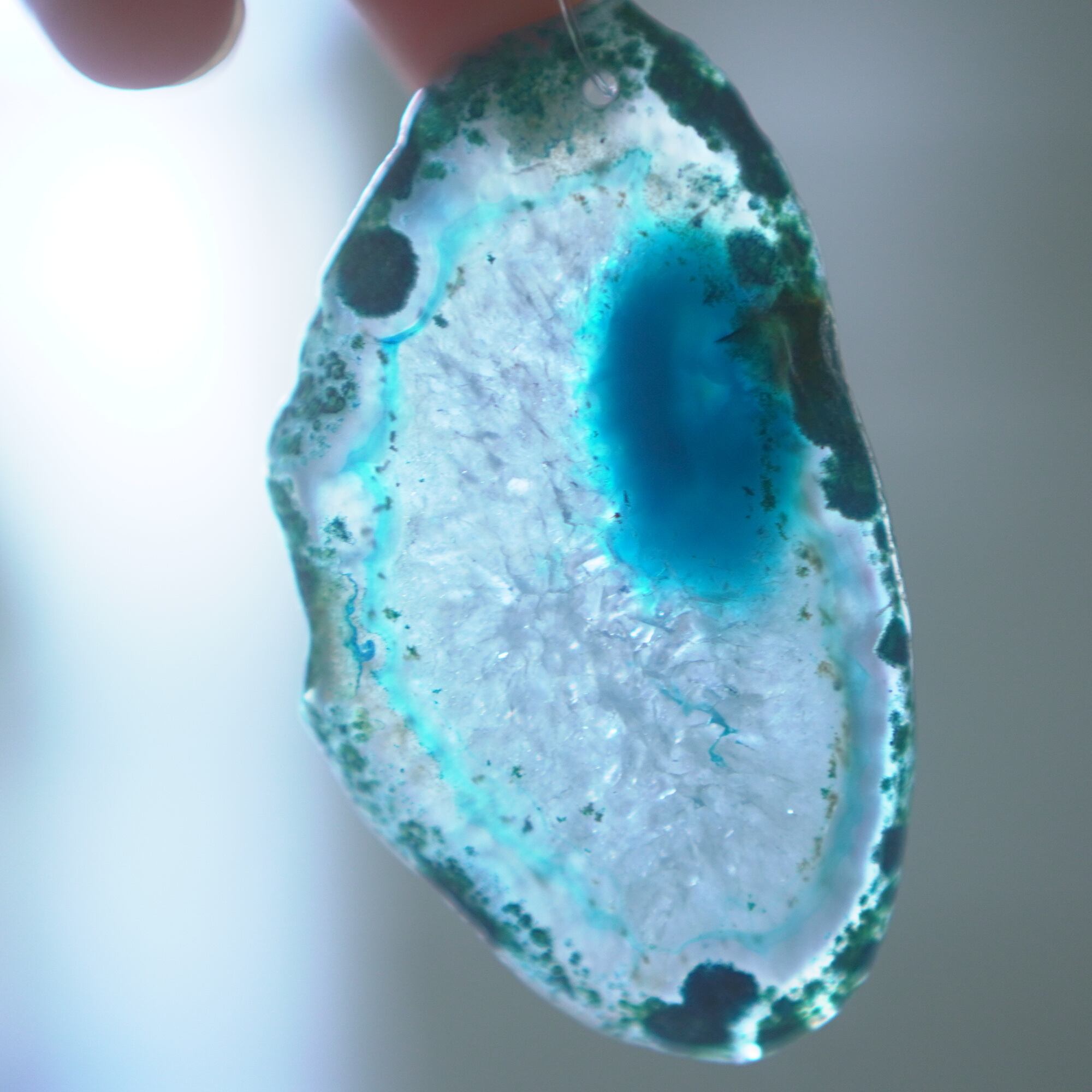 ✧✧✧染色の石なので耐光性(光による経年でのカラー変化の耐性)に優れているわけではなく一日の中で長時間強い日光に当たるような場所に飾られるのはおすすめしないのですが、陽光に透かした時にだけ真価を発揮する美しさがありますので、是非たまに翳したりして光と一緒にお楽しみいただけたらと思っております。特に濃い鮮やかな色など、気になられる場合は、日光のあまり当たらない場所に飾っていただけたらと思います✧✧✧