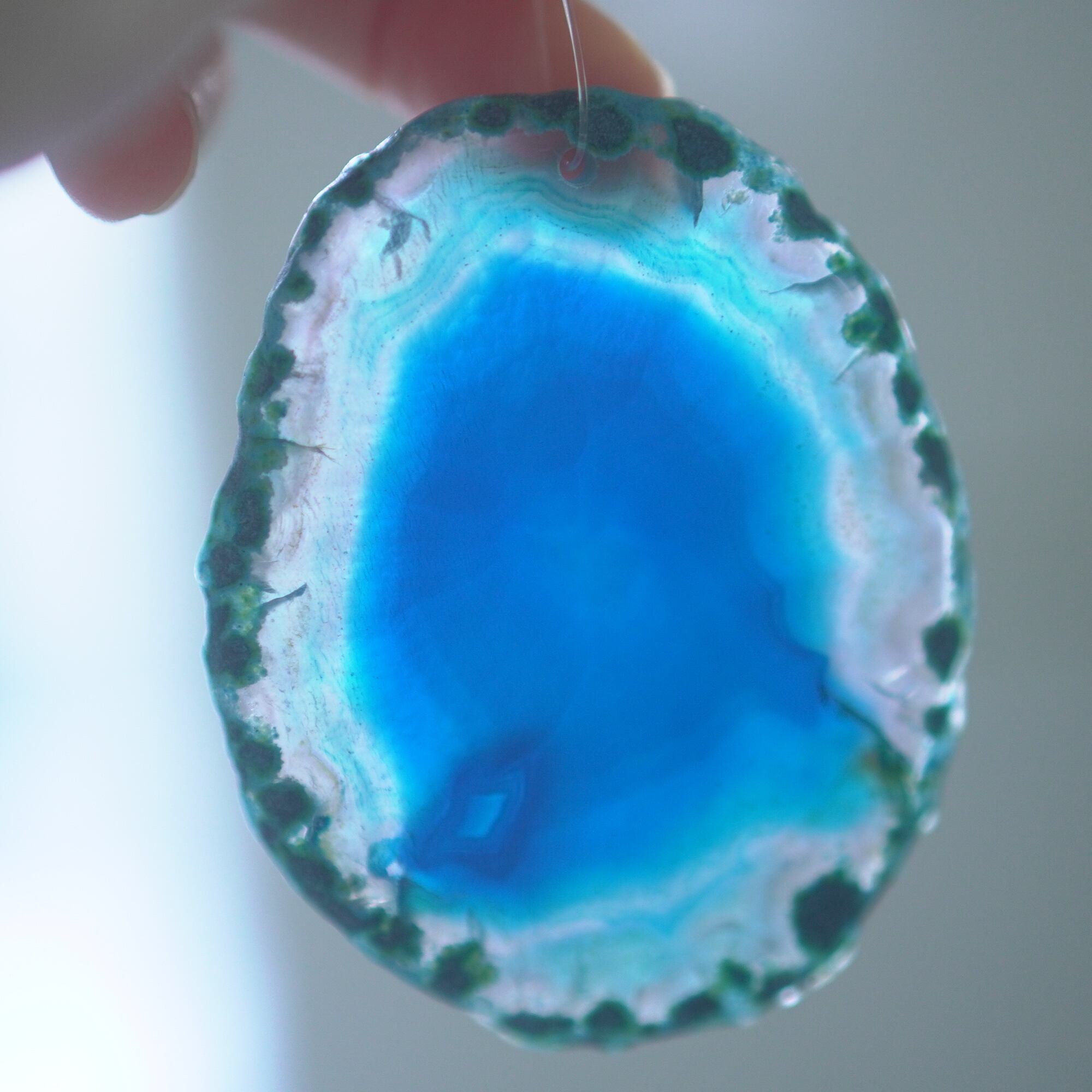 ✧✧✧染色の石なので耐光性(光による経年でのカラー変化の耐性)に優れているわけではなく一日の中で長時間強い日光に当たるような場所に飾られるのはおすすめしないのですが、陽光に透かした時にだけ真価を発揮する美しさがありますので、是非たまに翳したりして光と一緒にお楽しみいただけたらと思っております。特に濃い鮮やかな色など、気になられる場合は、日光のあまり当たらない場所に飾っていただけたらと思います✧✧✧