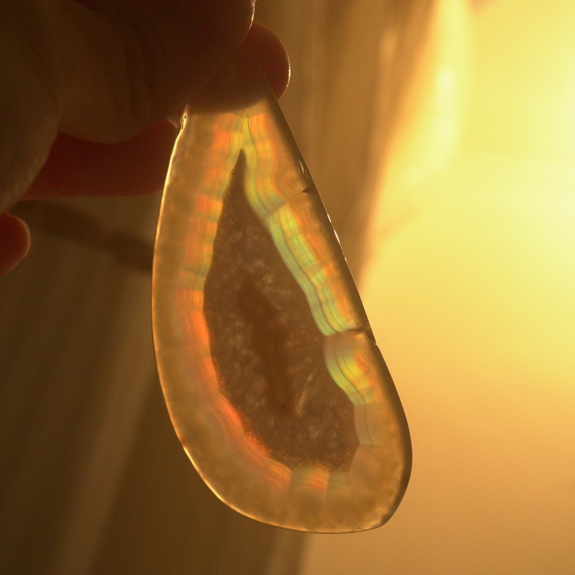 ✧✧✧染色の石なので耐光性(光による経年でのカラー変化の耐性)に優れているわけではなく一日の中で長時間強い日光に当たるような場所に飾られるのはおすすめしないのですが、陽光に透かした時にだけ真価を発揮する美しさがありますので、是非たまに翳したりして光と一緒にお楽しみいただけたらと思っております。特に濃い鮮やかな色など、気になられる場合は、日光のあまり当たらない場所に飾っていただけたらと思います✧✧✧