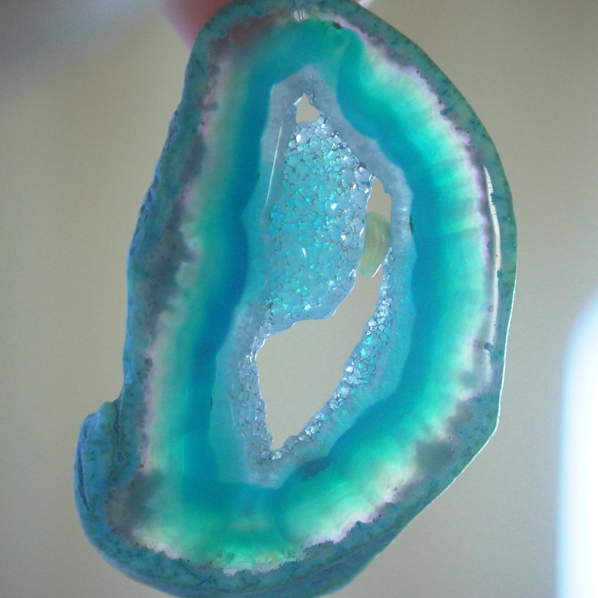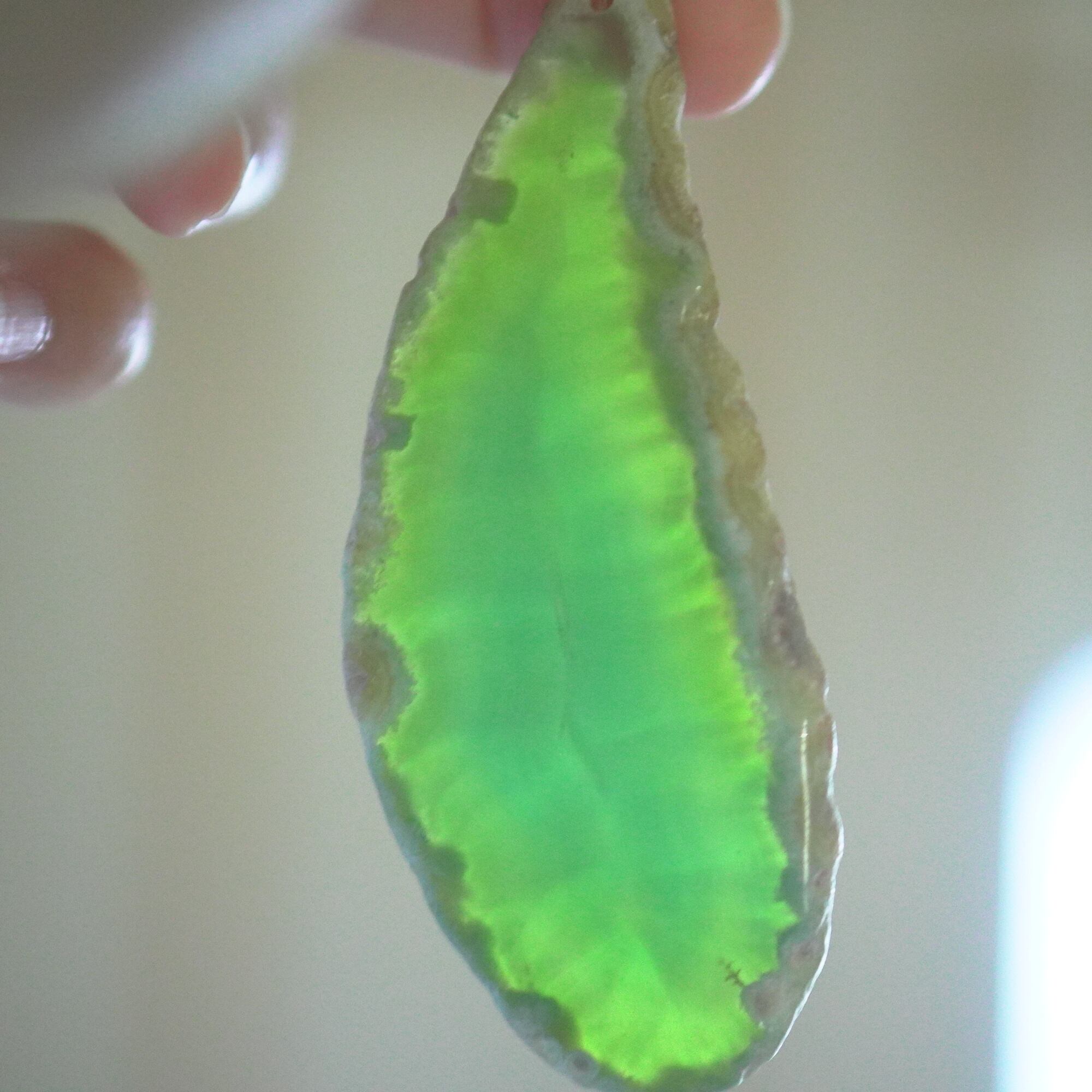 ✧✧✧染色の石なので耐光性(光による経年でのカラー変化の耐性)に優れているわけではなく一日の中で長時間強い日光に当たるような場所に飾られるのはおすすめしないのですが、陽光に透かした時にだけ真価を発揮する美しさがありますので、是非たまに翳したりして光と一緒にお楽しみいただけたらと思っております。特に濃い鮮やかな色など、気になられる場合は、日光のあまり当たらない場所に飾っていただけたらと思います✧✧✧