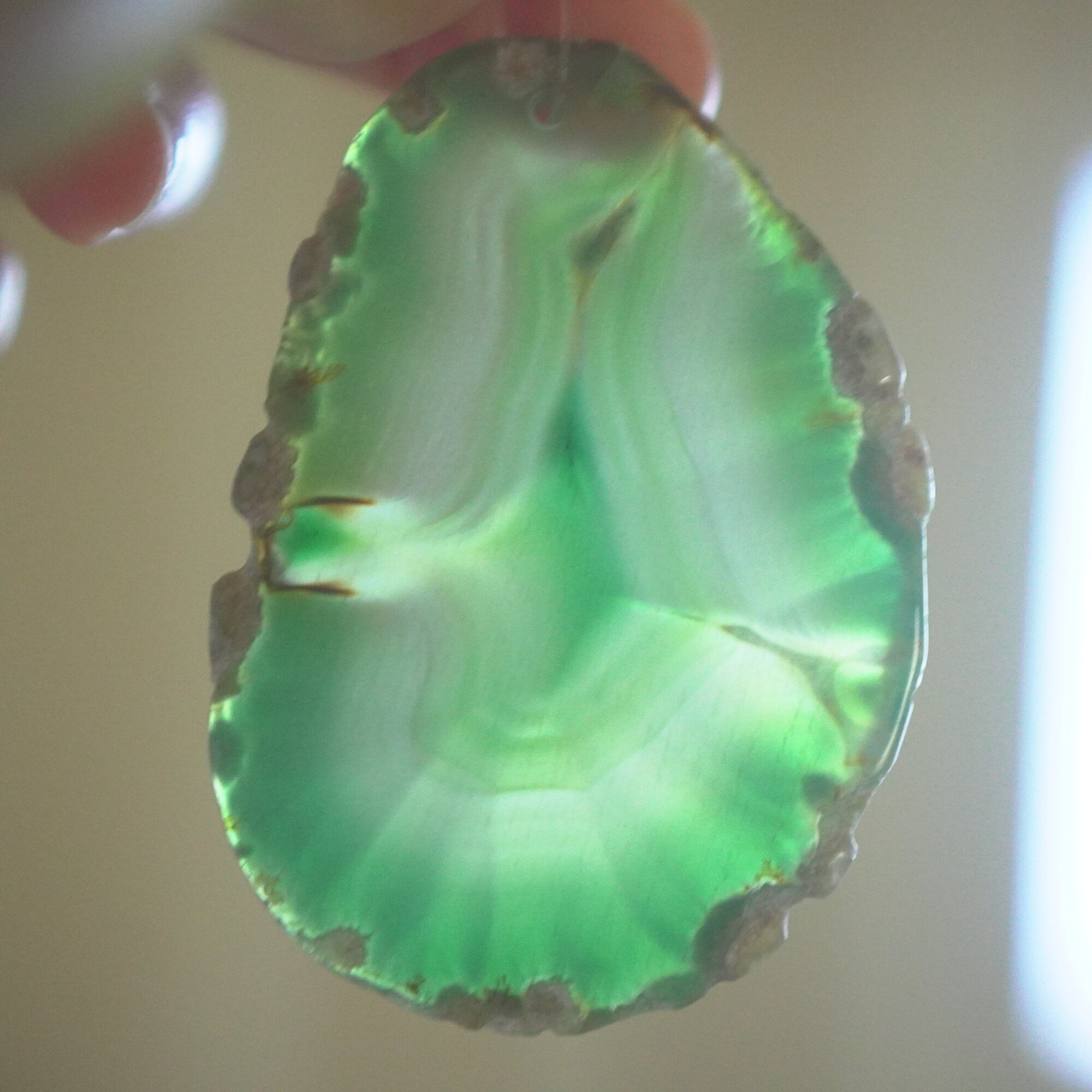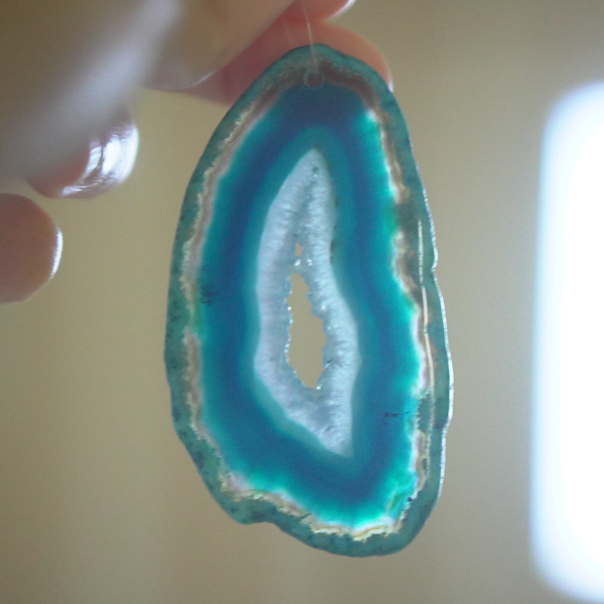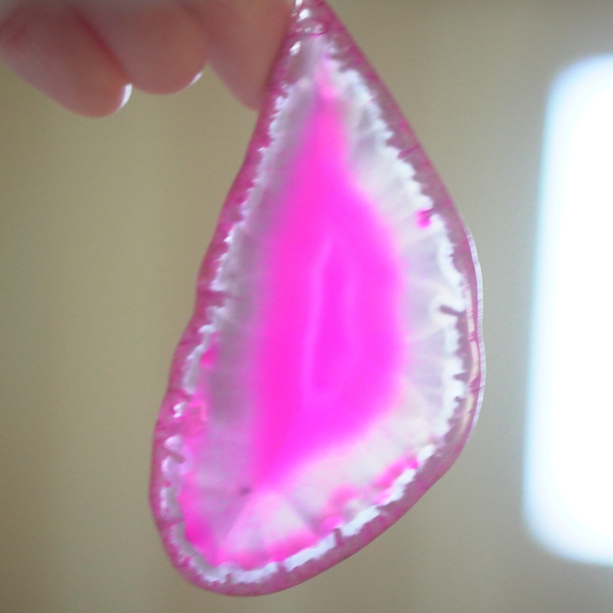✧✧✧染色の石なので耐光性(光による経年でのカラー変化の耐性)に優れているわけではなく一日の中で長時間強い日光に当たるような場所に飾られるのはおすすめしないのですが、陽光に透かした時にだけ真価を発揮する美しさがありますので、是非たまに翳したりして光と一緒にお楽しみいただけたらと思っております。特に濃い鮮やかな色など、気になられる場合は、日光のあまり当たらない場所に飾っていただけたらと思います✧✧✧