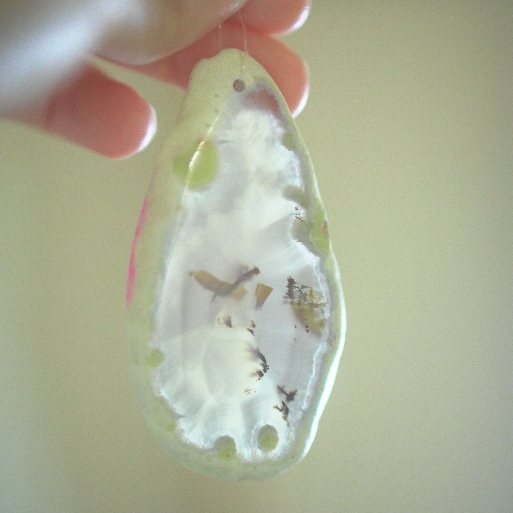 ✧✧✧瑪瑙の濃い色は染色によるもので、水に濡れたり布で擦ると多少色落ちします。飾るものなので大丈夫かと思いますが白いお洋服などには触れないようにされてください。汚れが気になる時は若干の色落ち前提で水を軽く含ませた布やティッシュでやさしく拭いていただくことは大丈夫です。また、画像のような細かなヒビ・カケはスライスメノウの加工上かなり多くあるので、チャイムとしての機能や全体の外観を著しく損なうものを除き、見た目の完璧さ<音色の響き重視で選んで使用しております、よろしくお願い致します✧✧✧