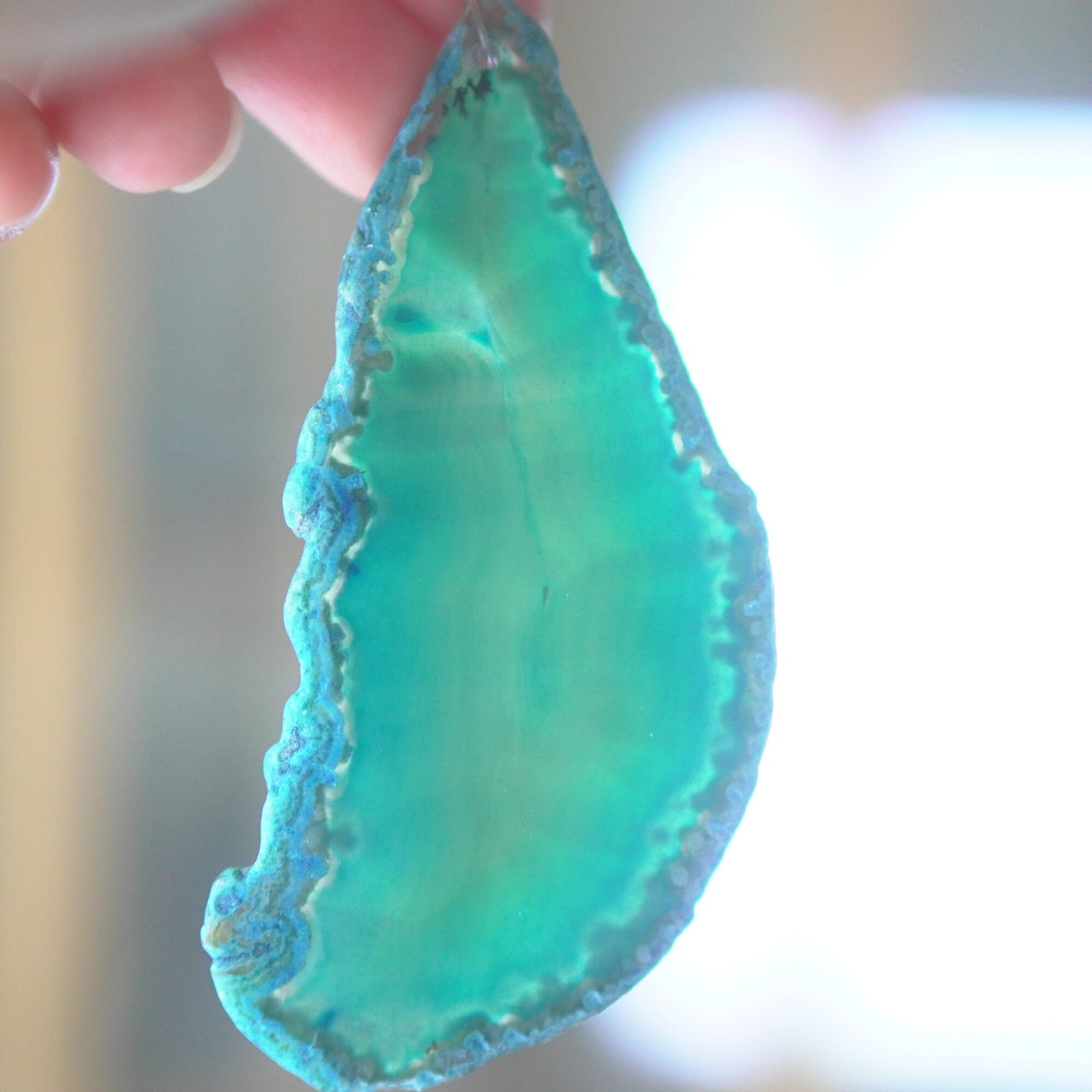 ✧染色の石なので耐光性(光による経年でのカラー変化の耐性)に優れているわけではなくベランダなど一日の中で長時間強い日光に当たるような場所に飾られるのはおすすめしないのですが、陽光に透かした時にだけ真価を発揮する美しさがありますので、是非、時折翳したりして光と一緒にお楽しみいただけたらと思います。特に濃い鮮やかな色など、色変化が気になられる場合は、日光のあまり当たらない場所に飾ってくださいね✧