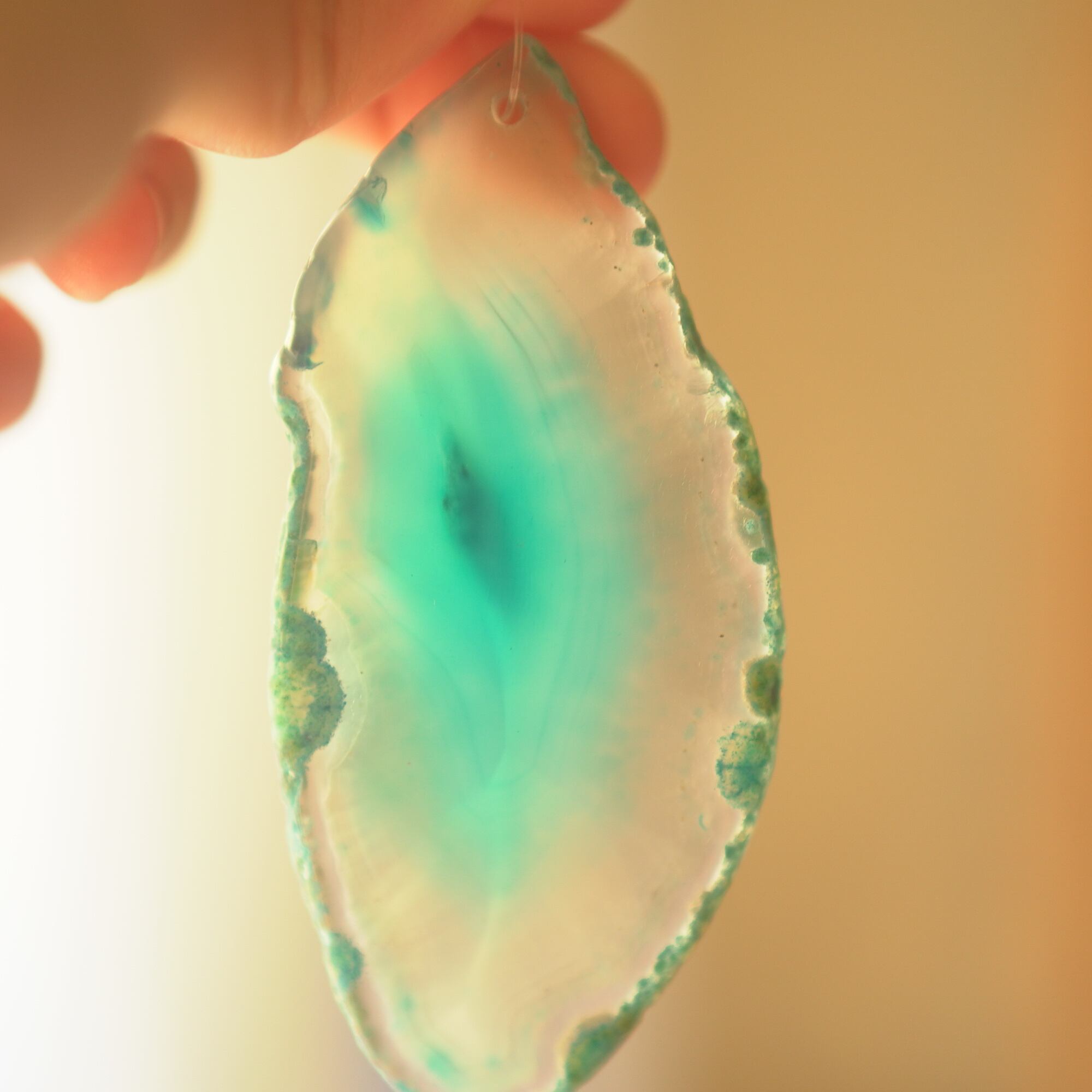 ✧染色の石なので耐光性(光による経年でのカラー変化の耐性)に優れているわけではなくベランダなど一日の中で長時間強い日光に当たるような場所に飾られるのはおすすめしないのですが、陽光に透かした時にだけ真価を発揮する美しさがありますので、是非、時折翳したりして光と一緒にお楽しみいただけたらと思います。特に濃い鮮やかな色など、色変化が気になられる場合は、日光のあまり当たらない場所に飾ってくださいね✧