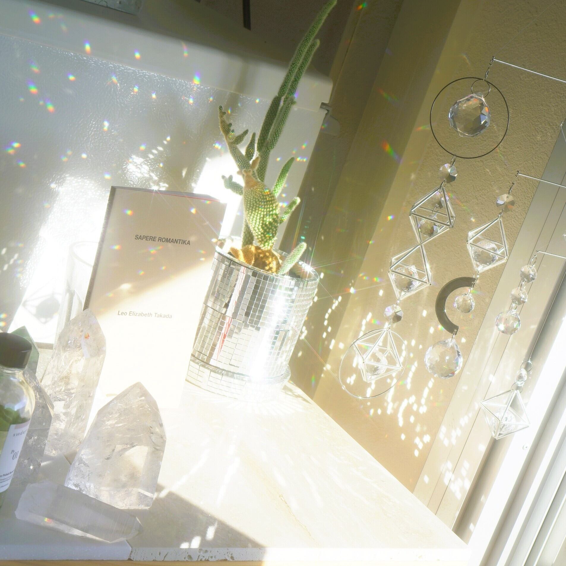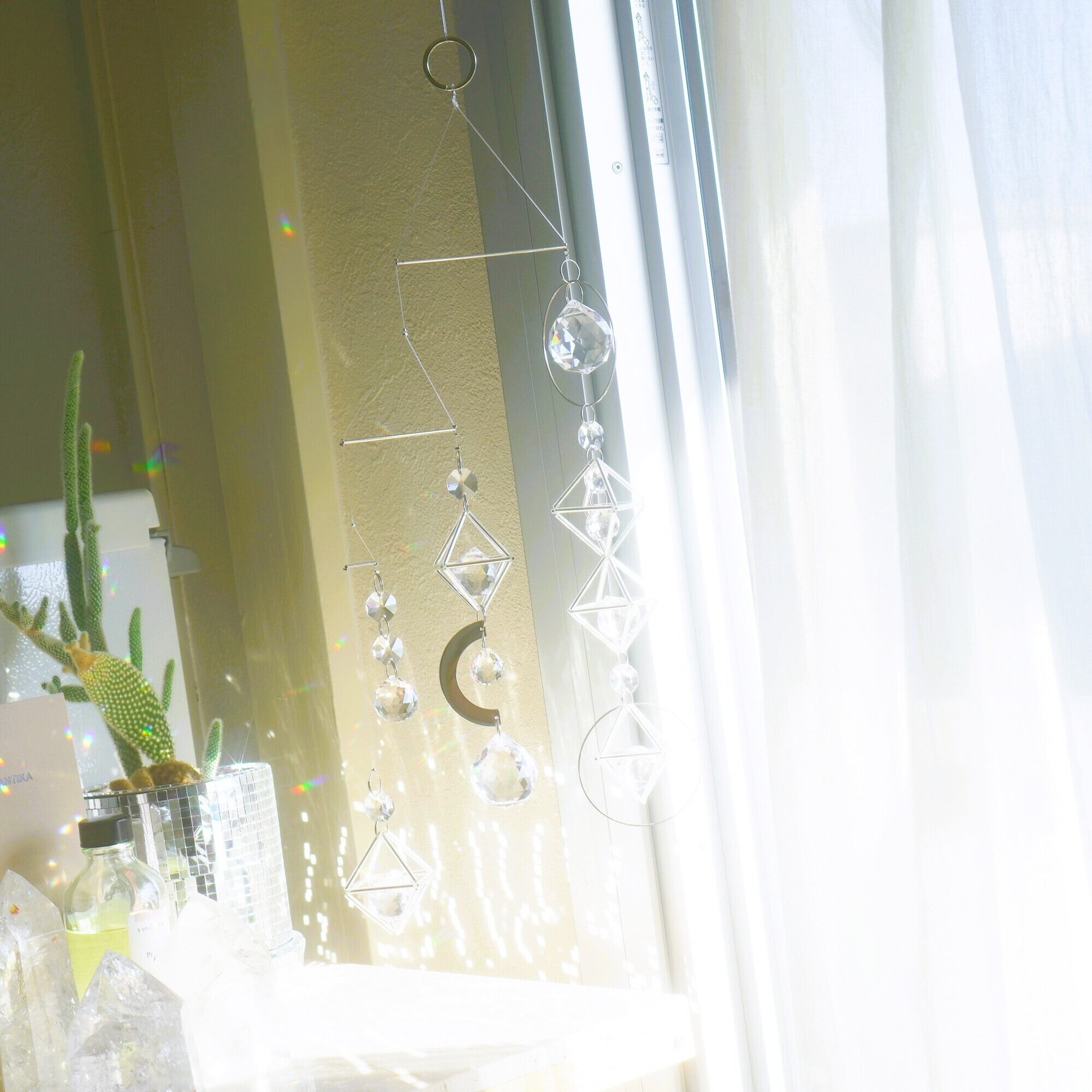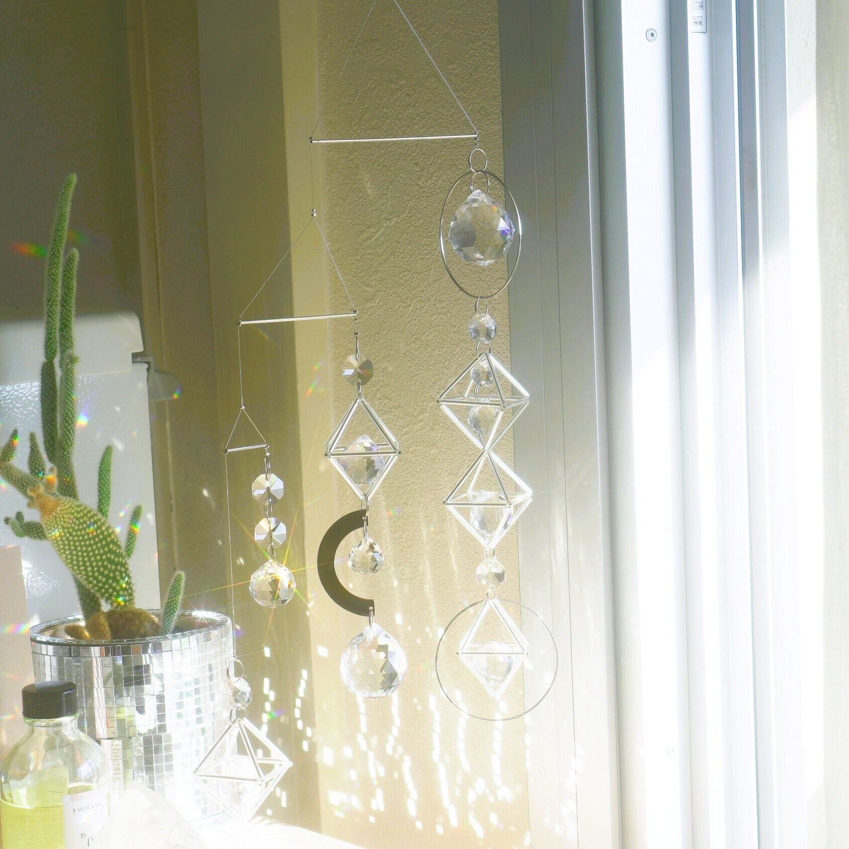 多面体ガラス以外にも光輝く素材が魅力で、光を反射するメタルパーツや、ヒンメリのような正八面体には、内側にシルバー箔が施されたガラスのパイプビーズを使用。直射日光を浴びた際はたくさんの虹色の光がお部屋に広がりながら、オブジェ自身もキラキラと光を放ちます。
