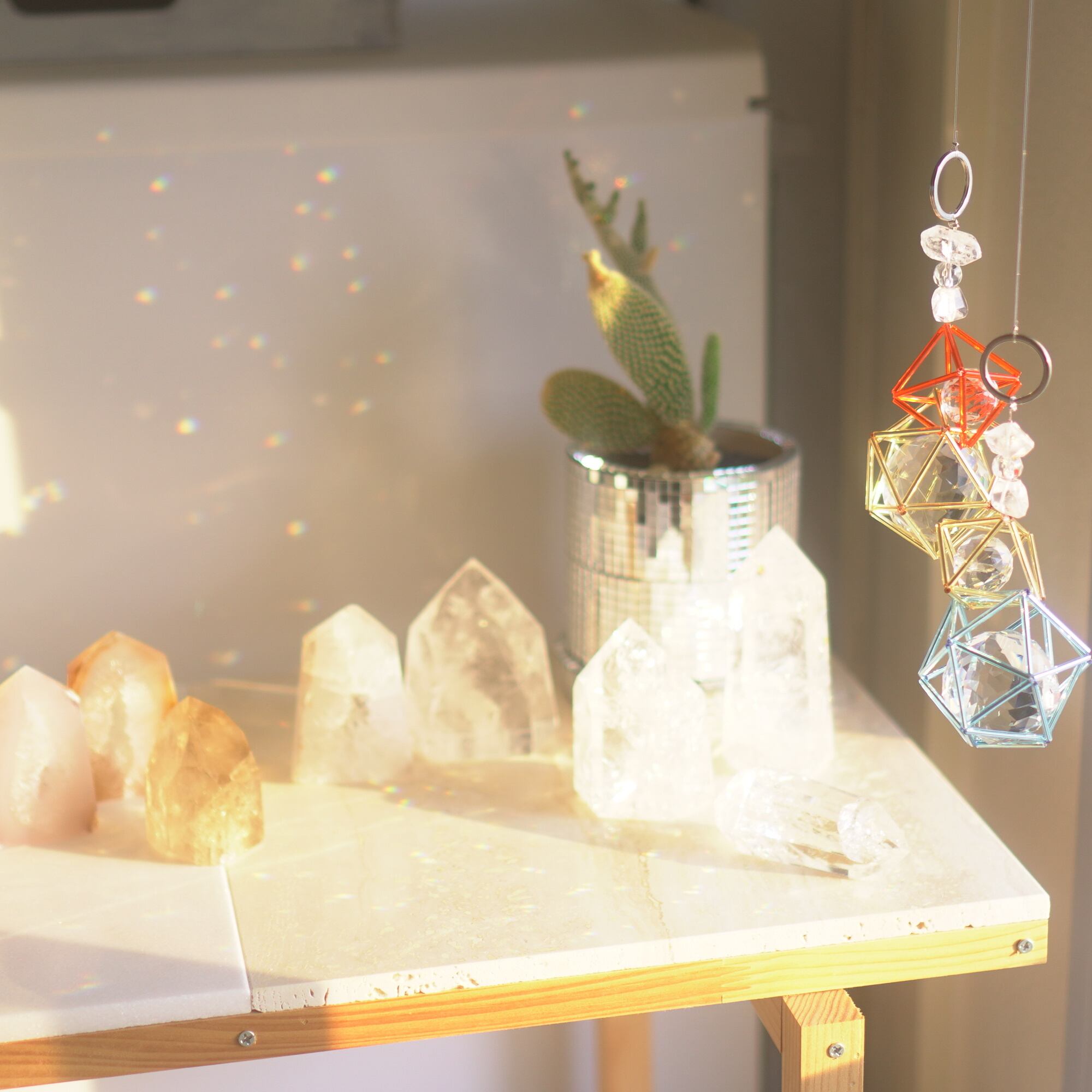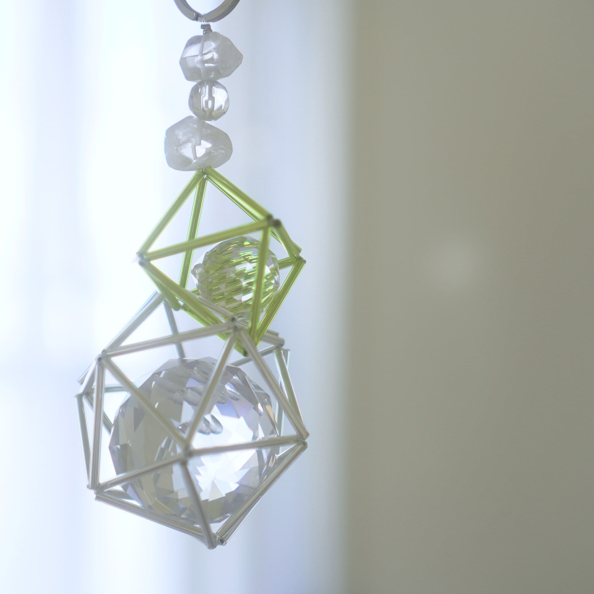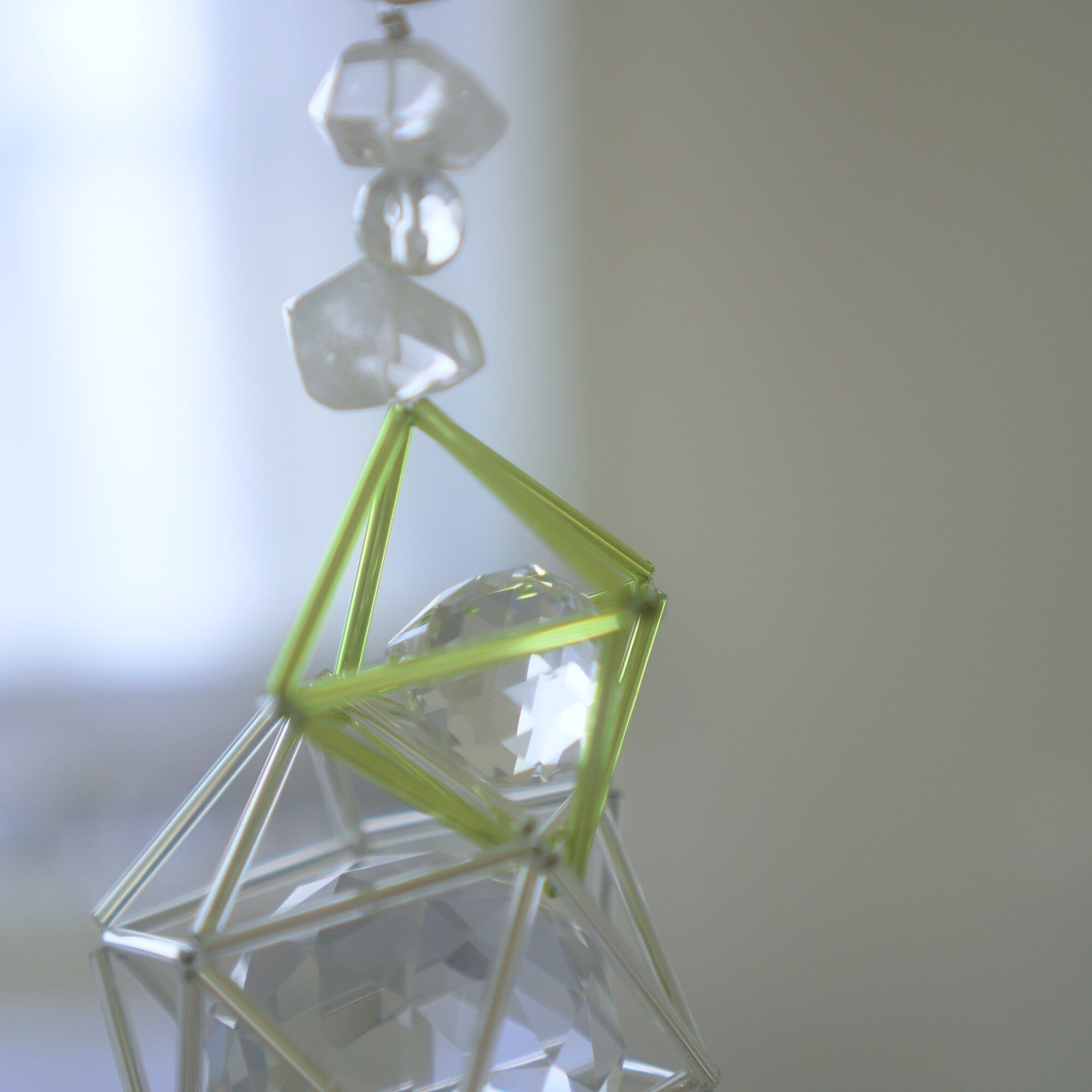 カラフルなガラスのパイプで作ったイコサヘドロンとオクタへドロン(正二十面体と正八面体)をドッキングさせ、鉱石が二粒くっついたようなデザインのサンキャッチャーです。