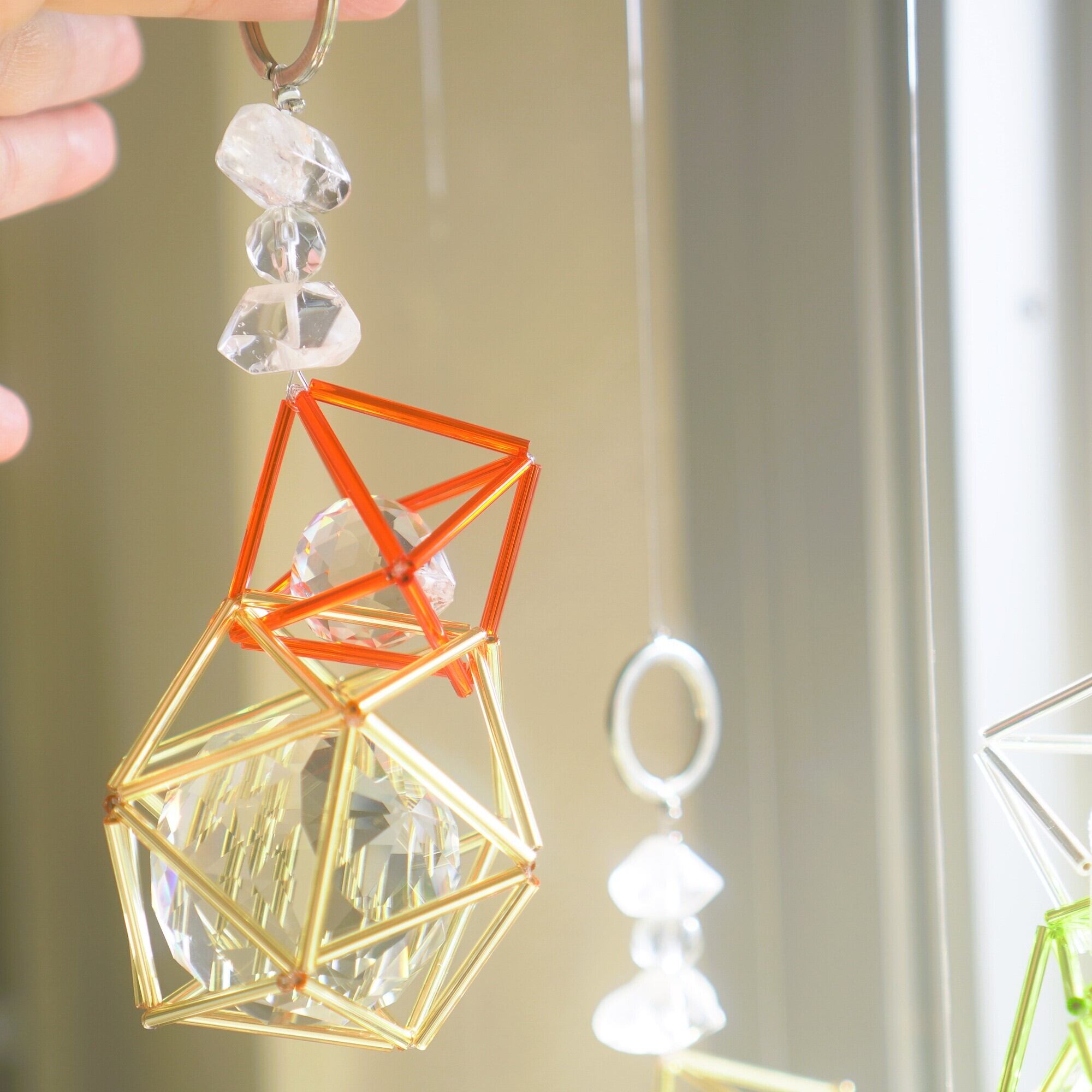 カラフルなガラスのパイプで作ったイコサヘドロンとオクタへドロン(正二十面体と正八面体)をドッキングさせ、鉱石が二粒くっついたようなデザインのサンキャッチャーです。