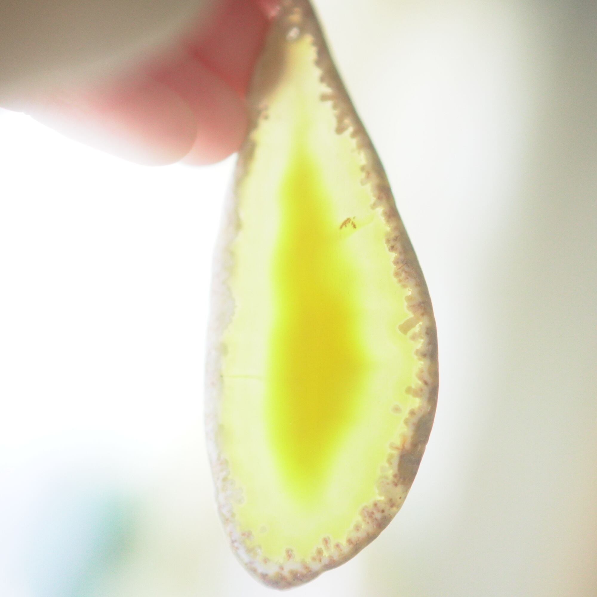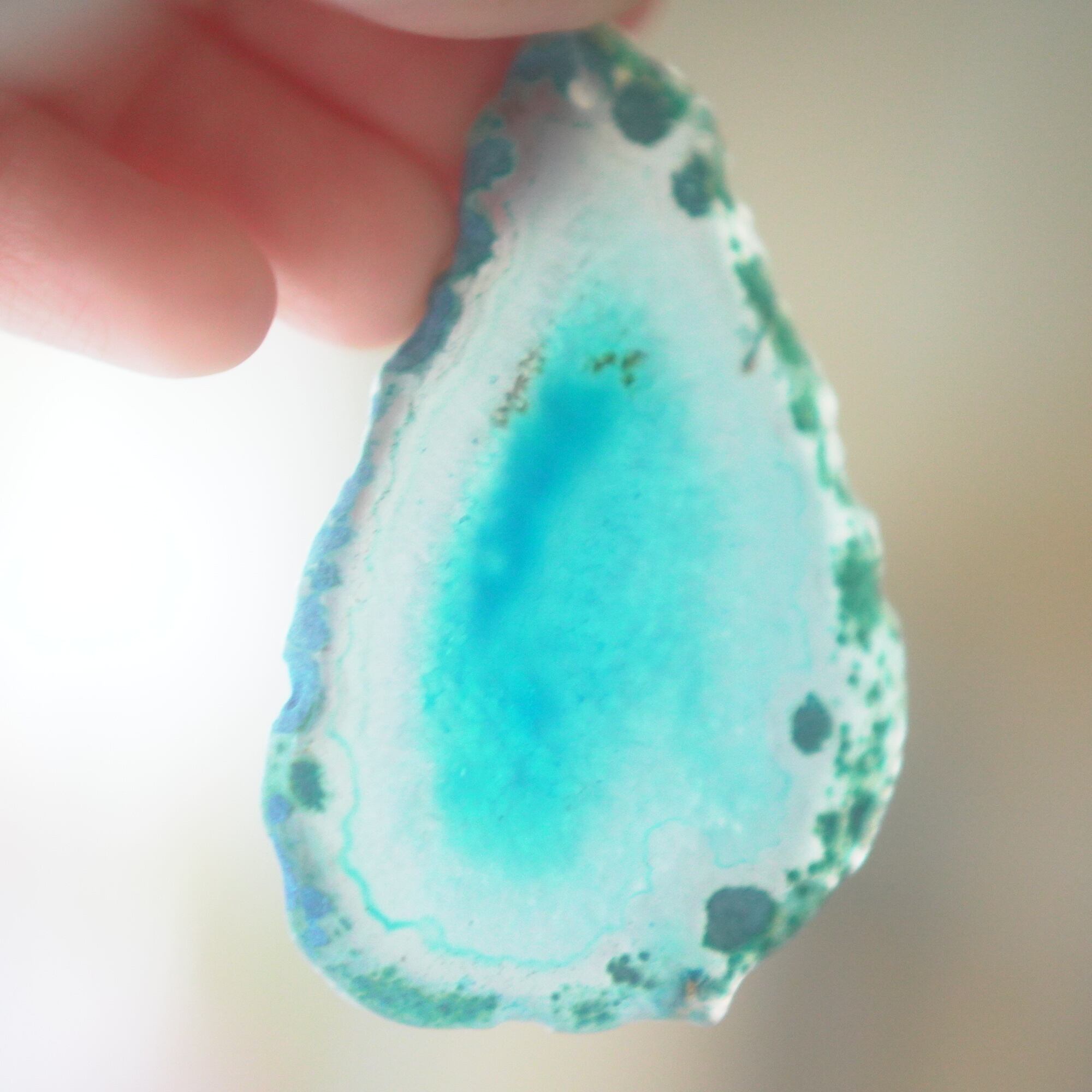 ✧染色の石なので耐光性(光による経年でのカラー変化の耐性)に優れているわけではなくベランダなど一日の中で長時間強い日光に当たるような場所に飾られるのはおすすめしないのですが、陽光に透かした時にだけ真価を発揮する美しさがありますので、是非、時折翳したりして光と一緒にお楽しみいただけたらと思います。特に濃い鮮やかな色など、色変化が気になられる場合は、日光のあまり当たらない場所に飾ってくださいね✧