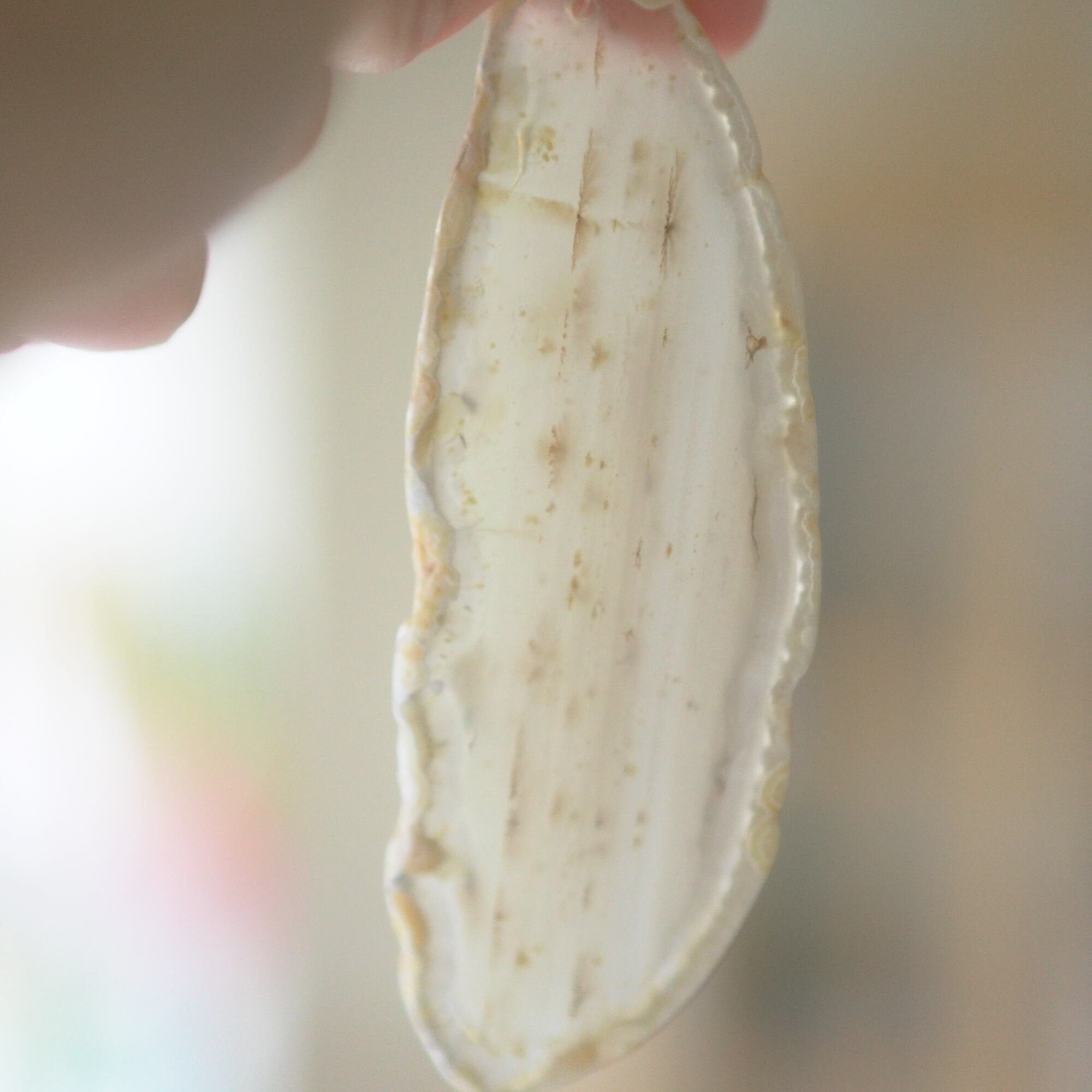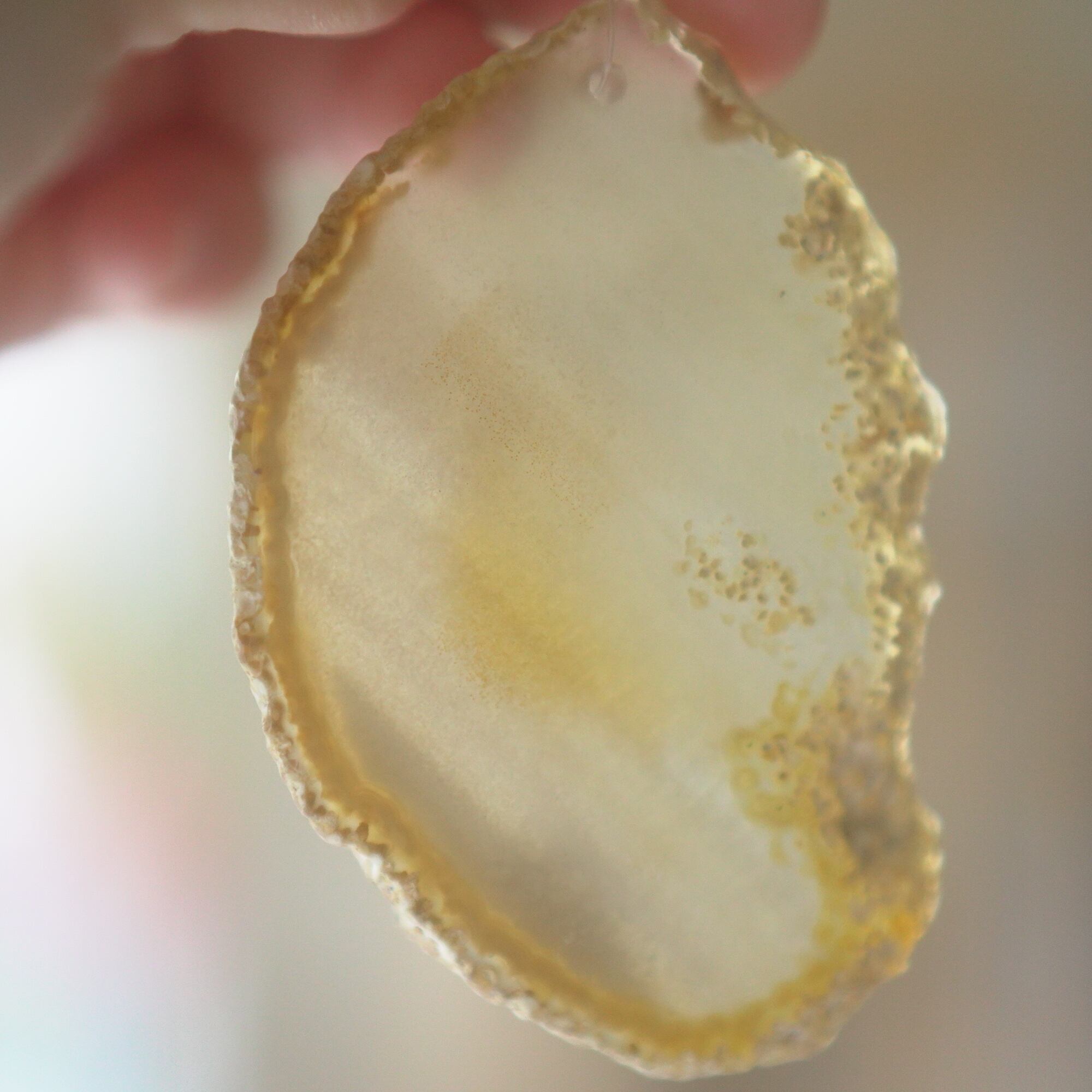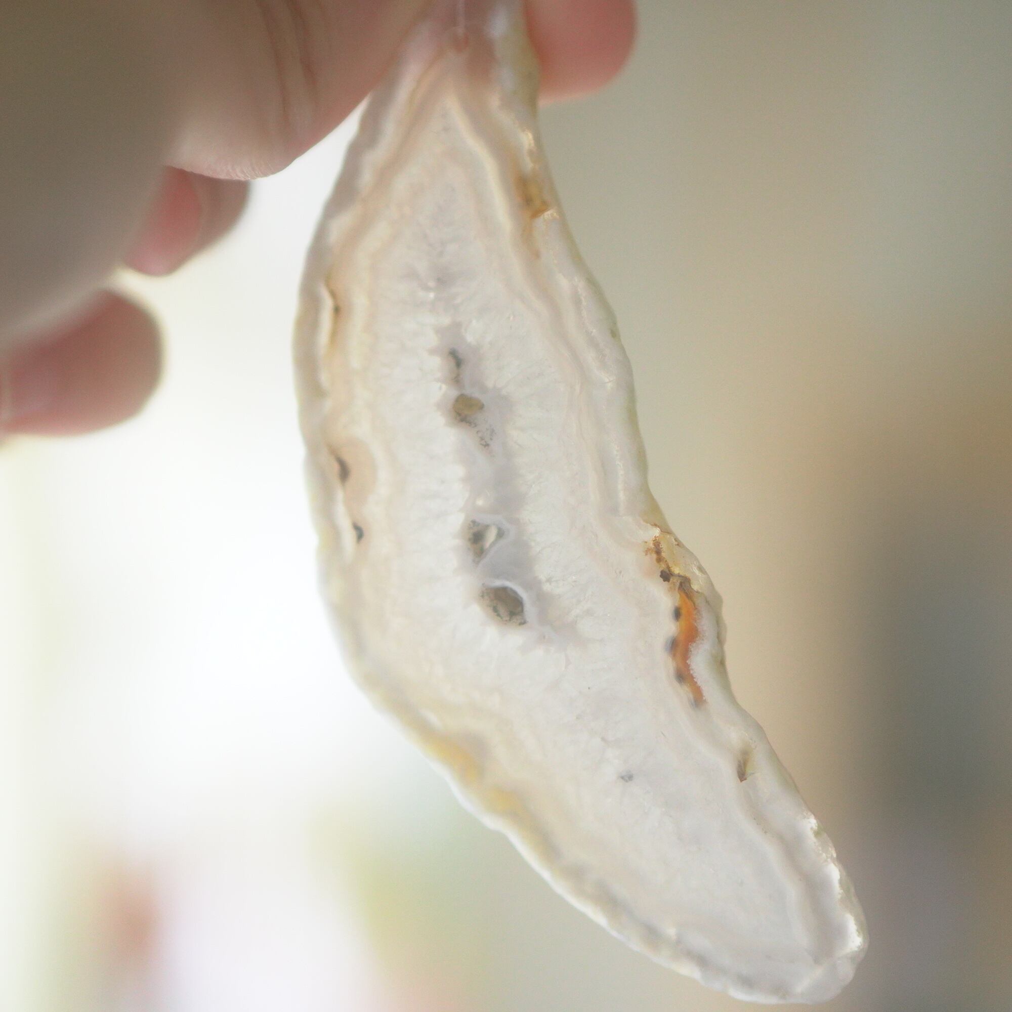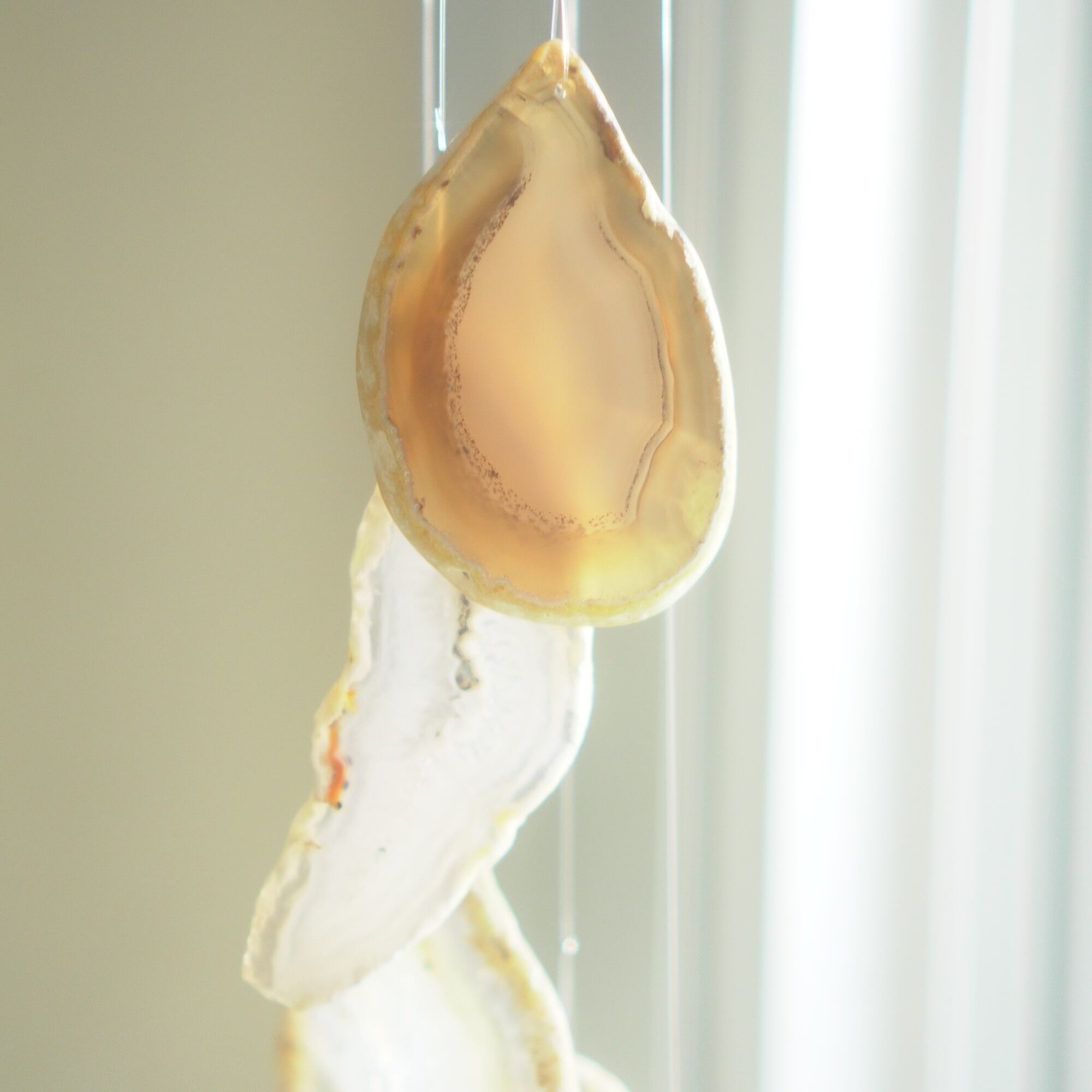 重ねる石同士の側面の加工状態によっても良い音が鳴ったり鳴らなかったり、石の見た目だけで組み合わせを決められないことが難しいポイントでもあるのですが、そんな中、たくさんの石の中から選ばれた5枚のスライスアゲートから出来上がったチャイムたちは、どこか悠々自適に空を泳ぐ妖精のようでもあり、それぞれの音を楽しそうに奏でてくれます。