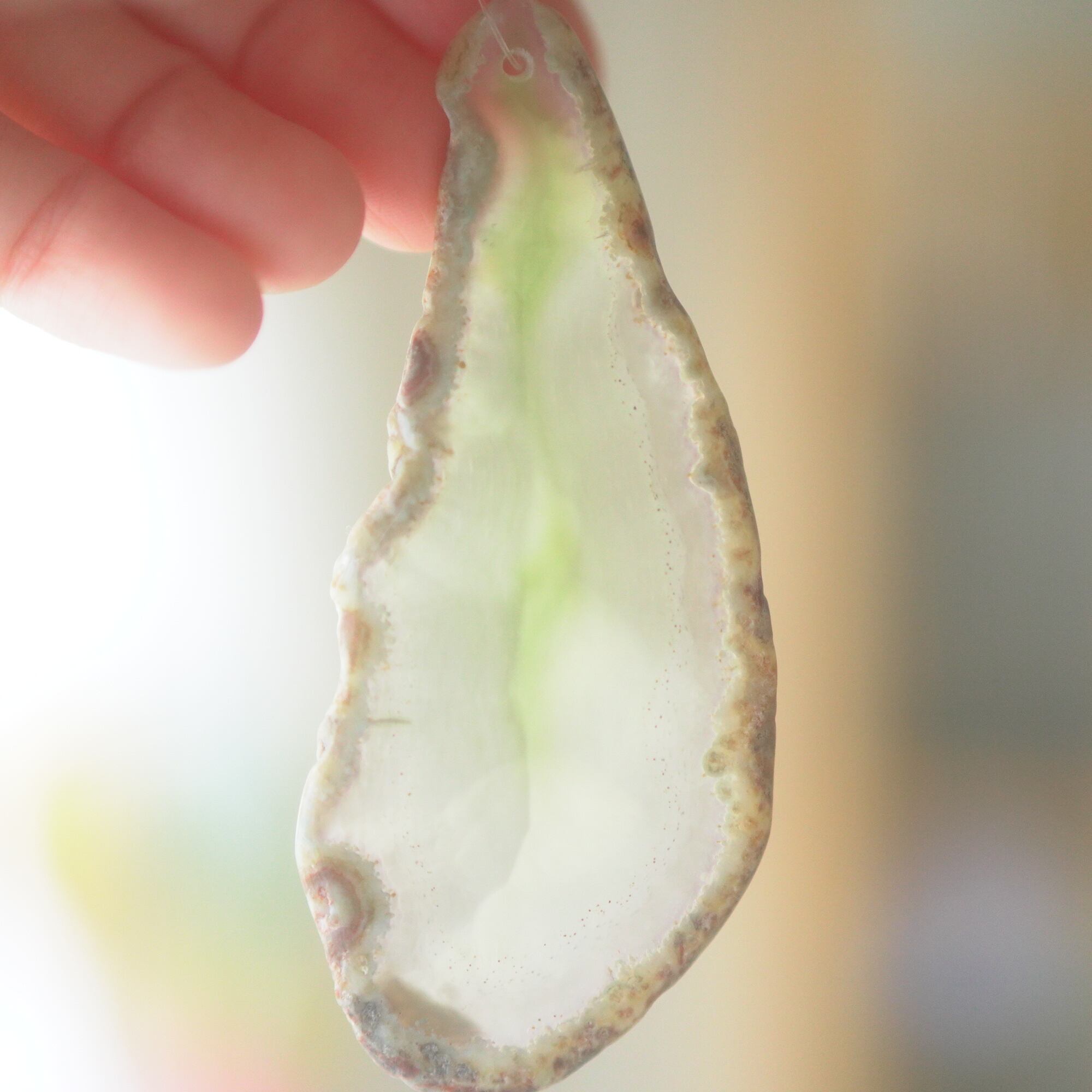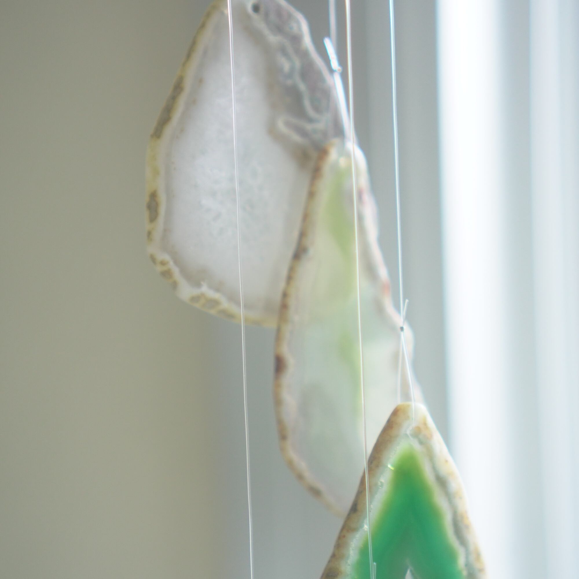 重ねる石同士の側面の加工状態によっても良い音が鳴ったり鳴らなかったり、石の見た目だけで組み合わせを決められないことが難しいポイントでもあるのですが、そんな中、たくさんの石の中から選ばれた5枚のスライスアゲートから出来上がったチャイムたちは、どこか悠々自適に空を泳ぐ妖精のようでもあり、それぞれの音を楽しそうに奏でてくれます。