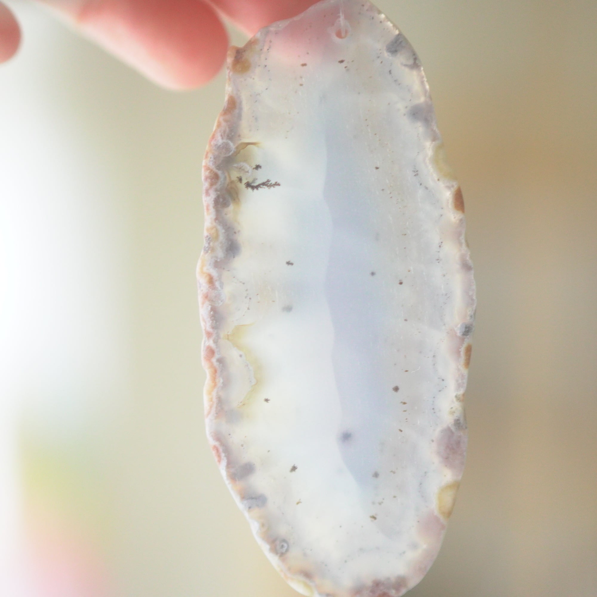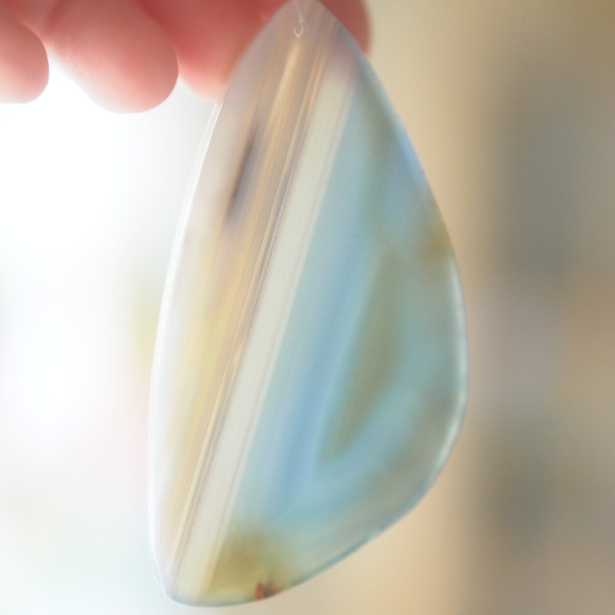 重ねる石同士の側面の加工状態によっても良い音が鳴ったり鳴らなかったり、石の見た目だけで組み合わせを決められないことが難しいポイントでもあるのですが、そんな中、たくさんの石の中から選ばれた5枚のスライスアゲートから出来上がったチャイムたちは、どこか悠々自適に空を泳ぐ妖精のようでもあり、それぞれの音を楽しそうに奏でてくれます。