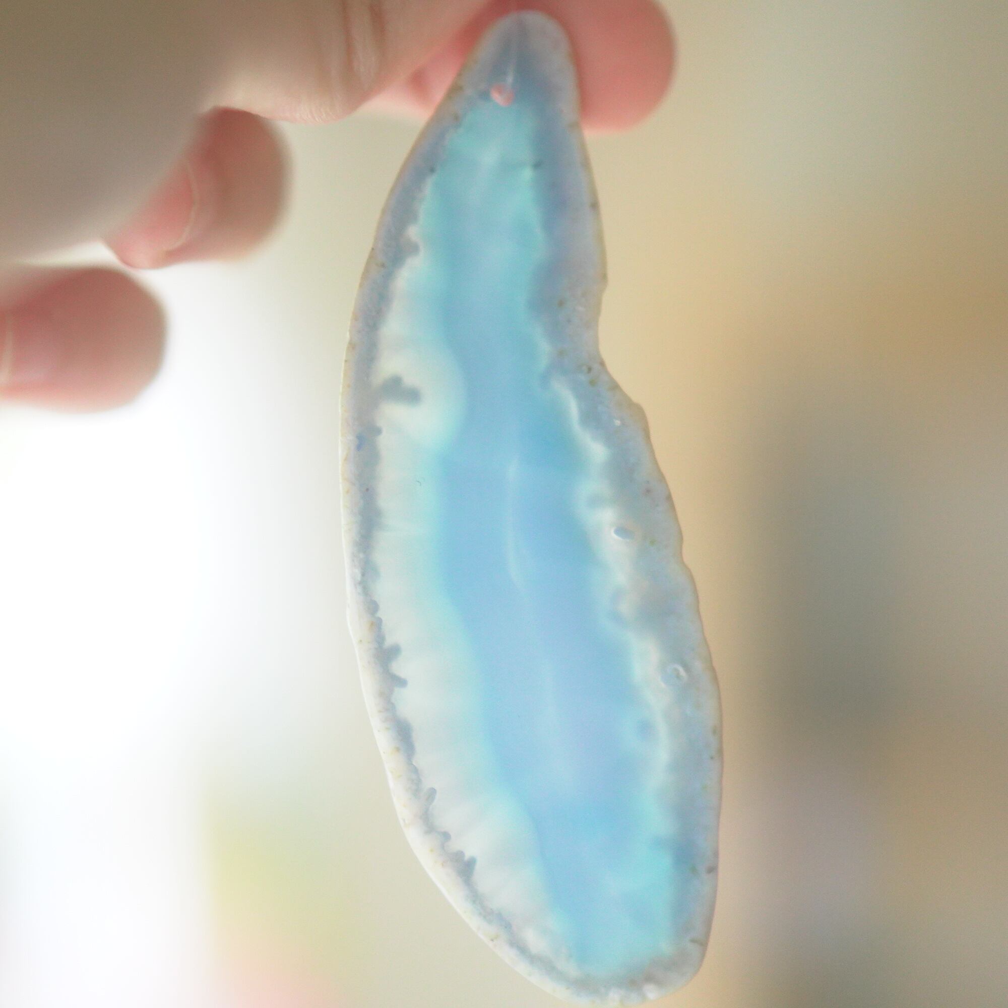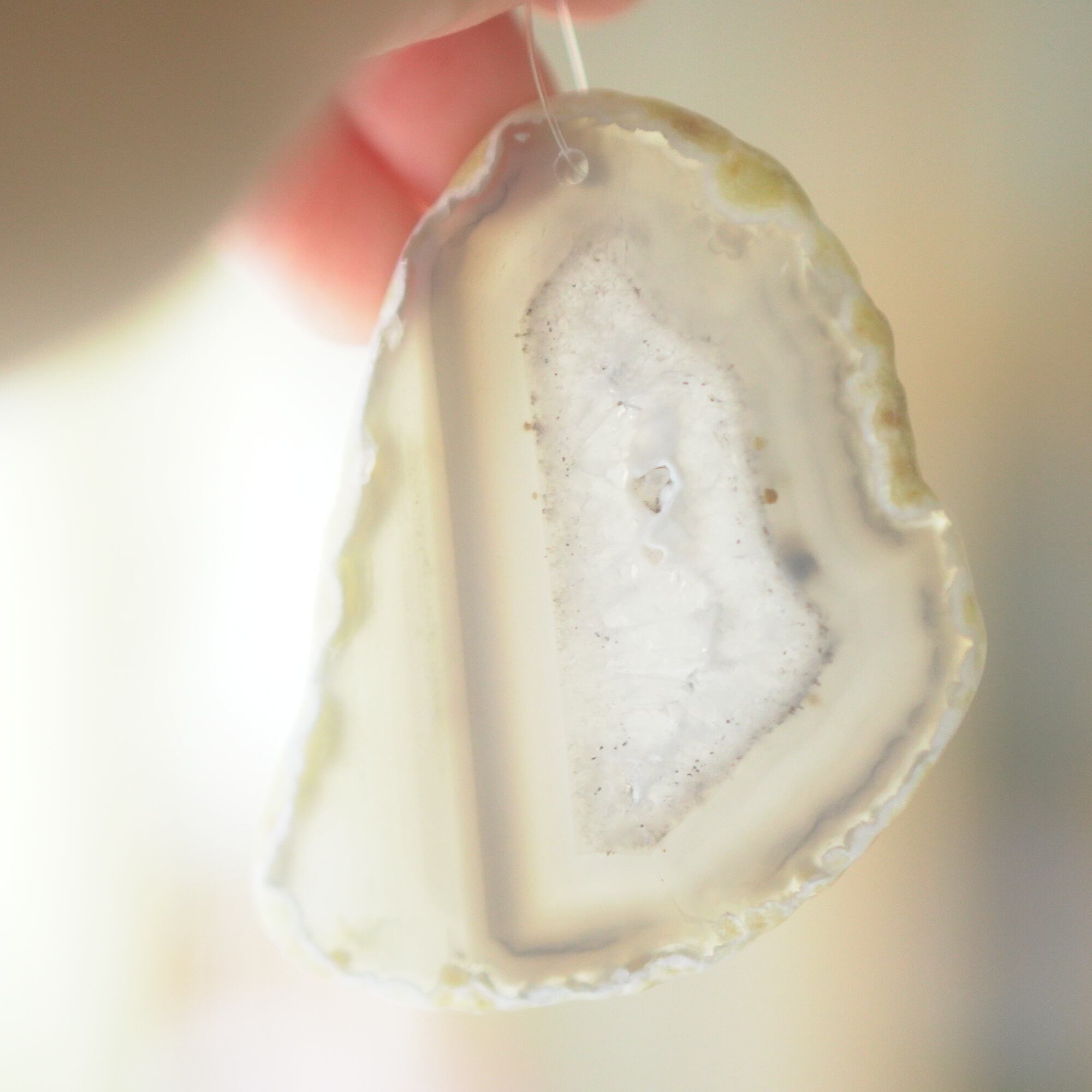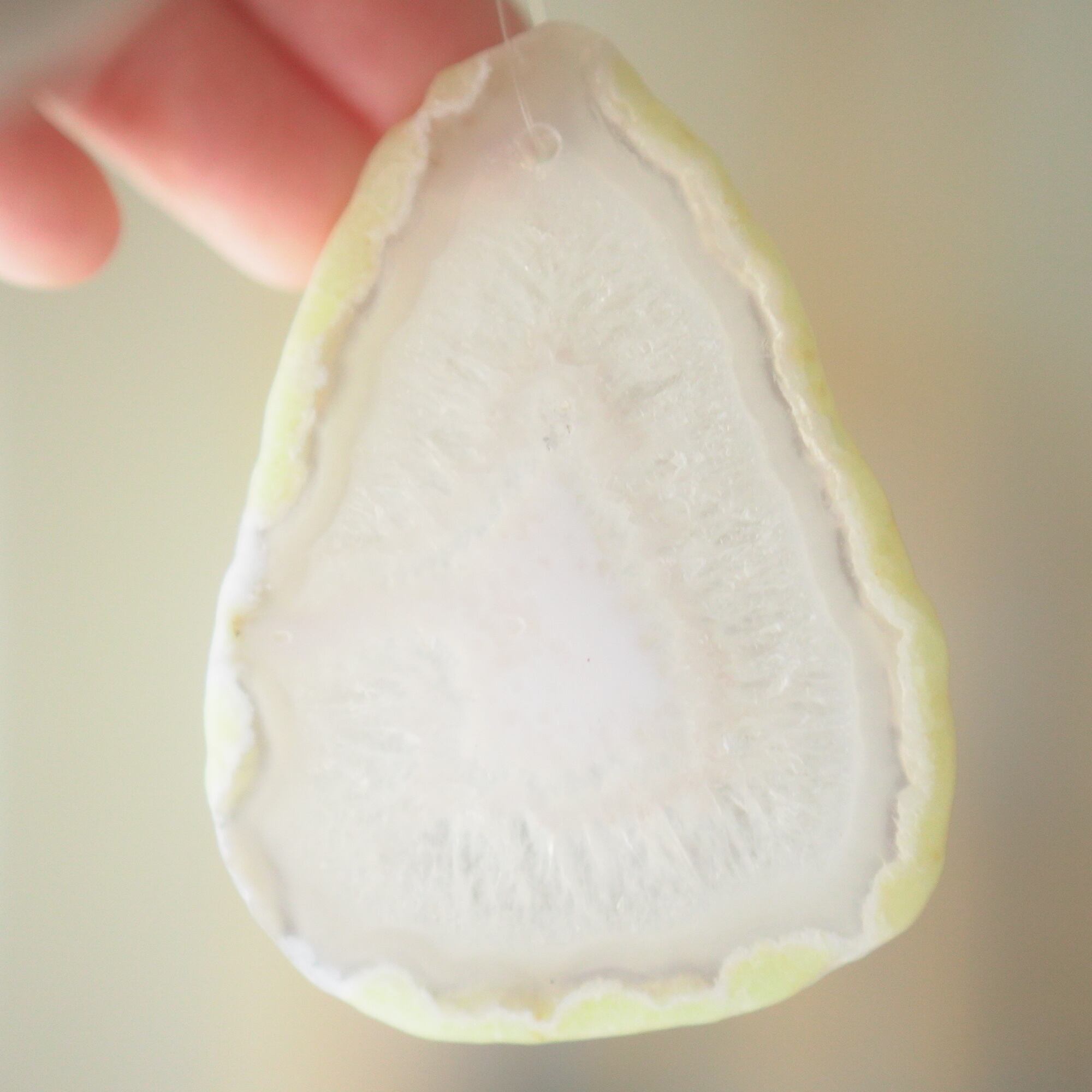 重ねる石同士の側面の加工状態によっても良い音が鳴ったり鳴らなかったり、石の見た目だけで組み合わせを決められないことが難しいポイントでもあるのですが、そんな中、たくさんの石の中から選ばれた5枚のスライスアゲートから出来上がったチャイムたちは、どこか悠々自適に空を泳ぐ妖精のようでもあり、それぞれの音を楽しそうに奏でてくれます。