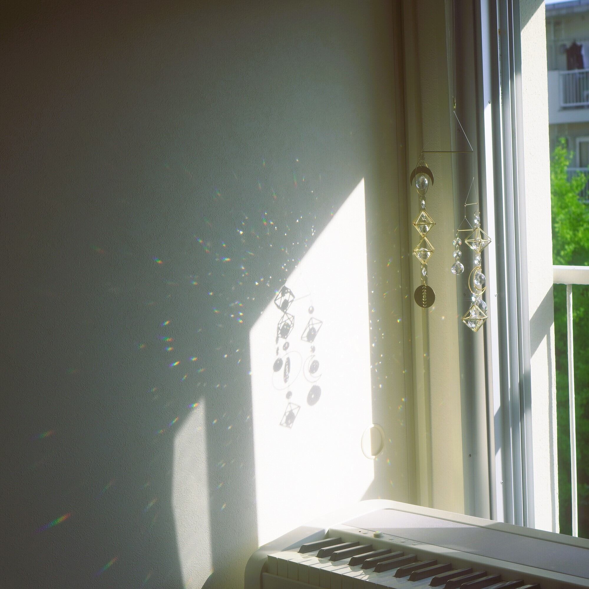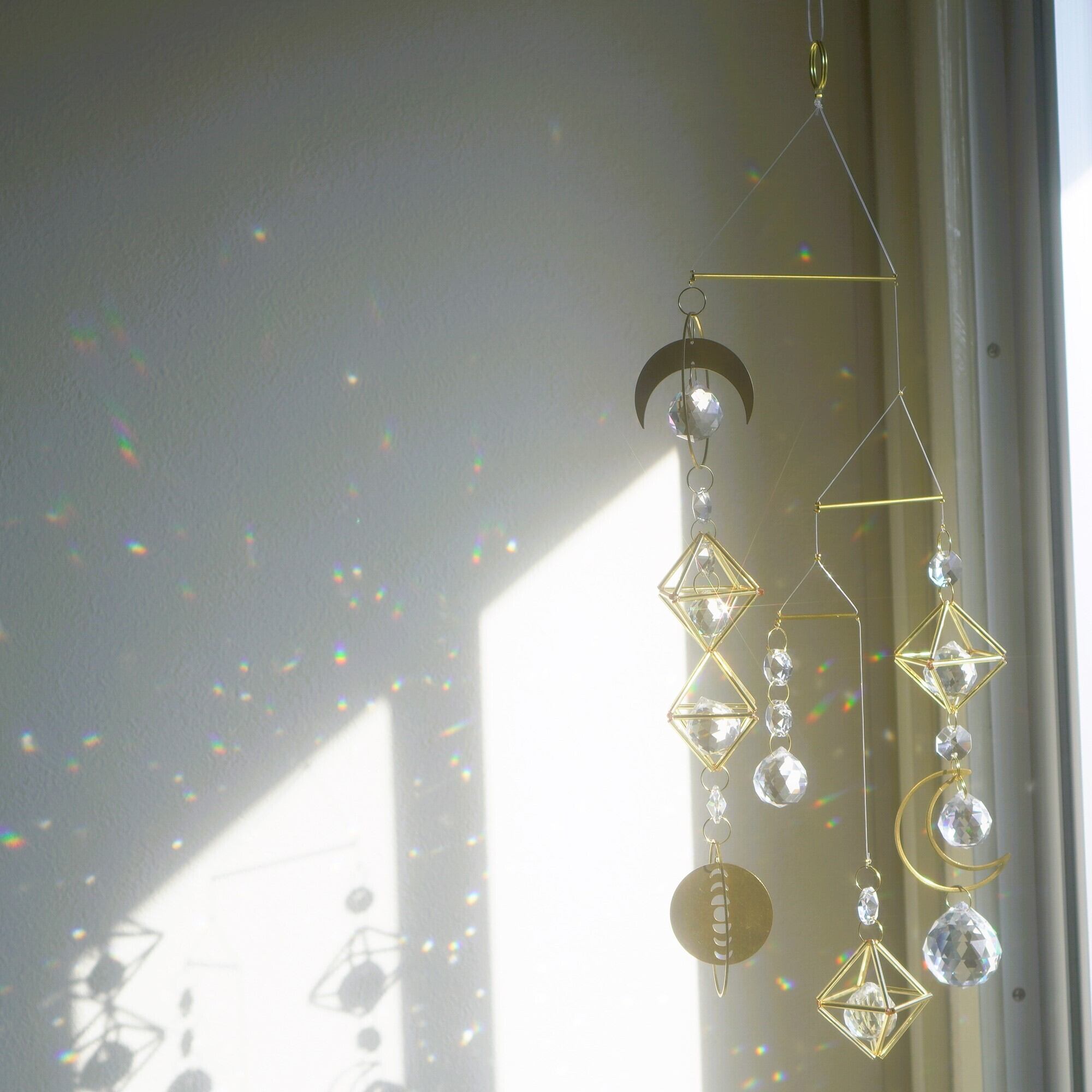 紙のモビールほどの軽さではありませんが、窓を開ければ自然の風でゆったりと回りながら揺れ、直射日光が当たっている際はそれに合わせて光の粒もお部屋中をしぶきのように舞うのが魅力です。