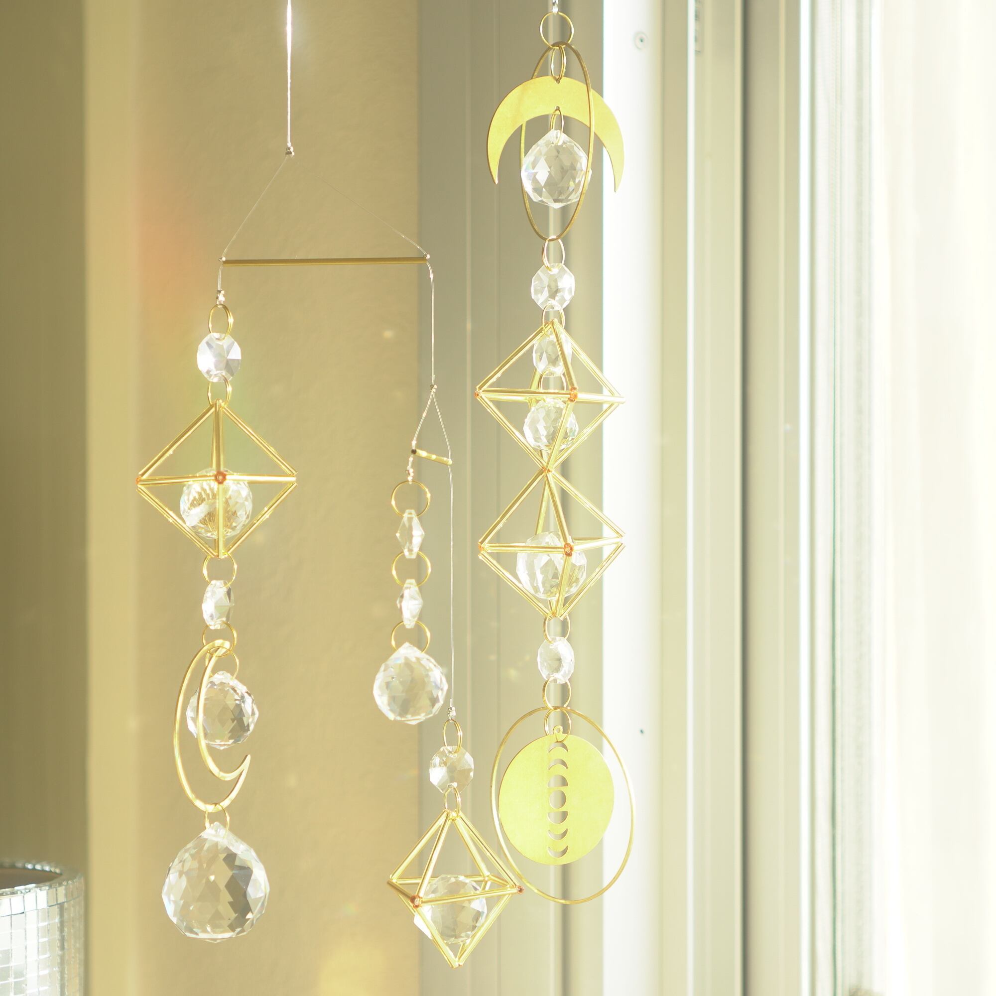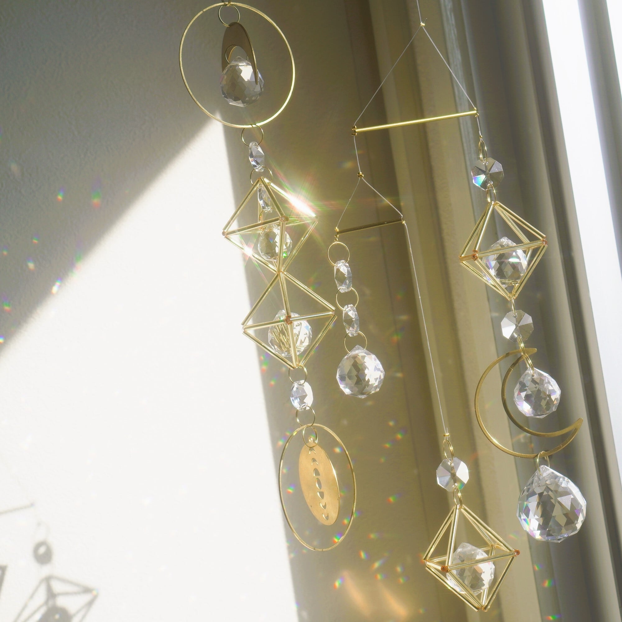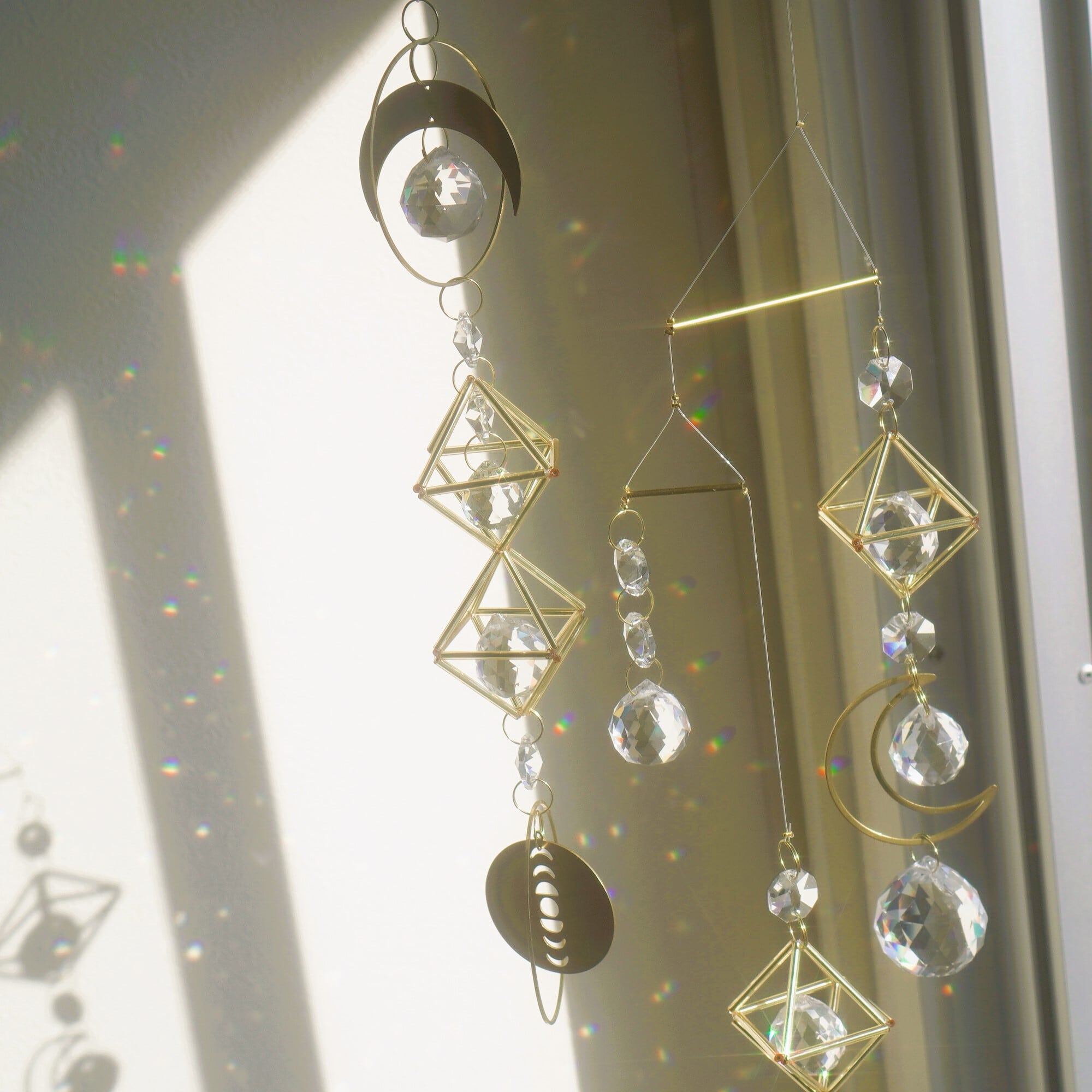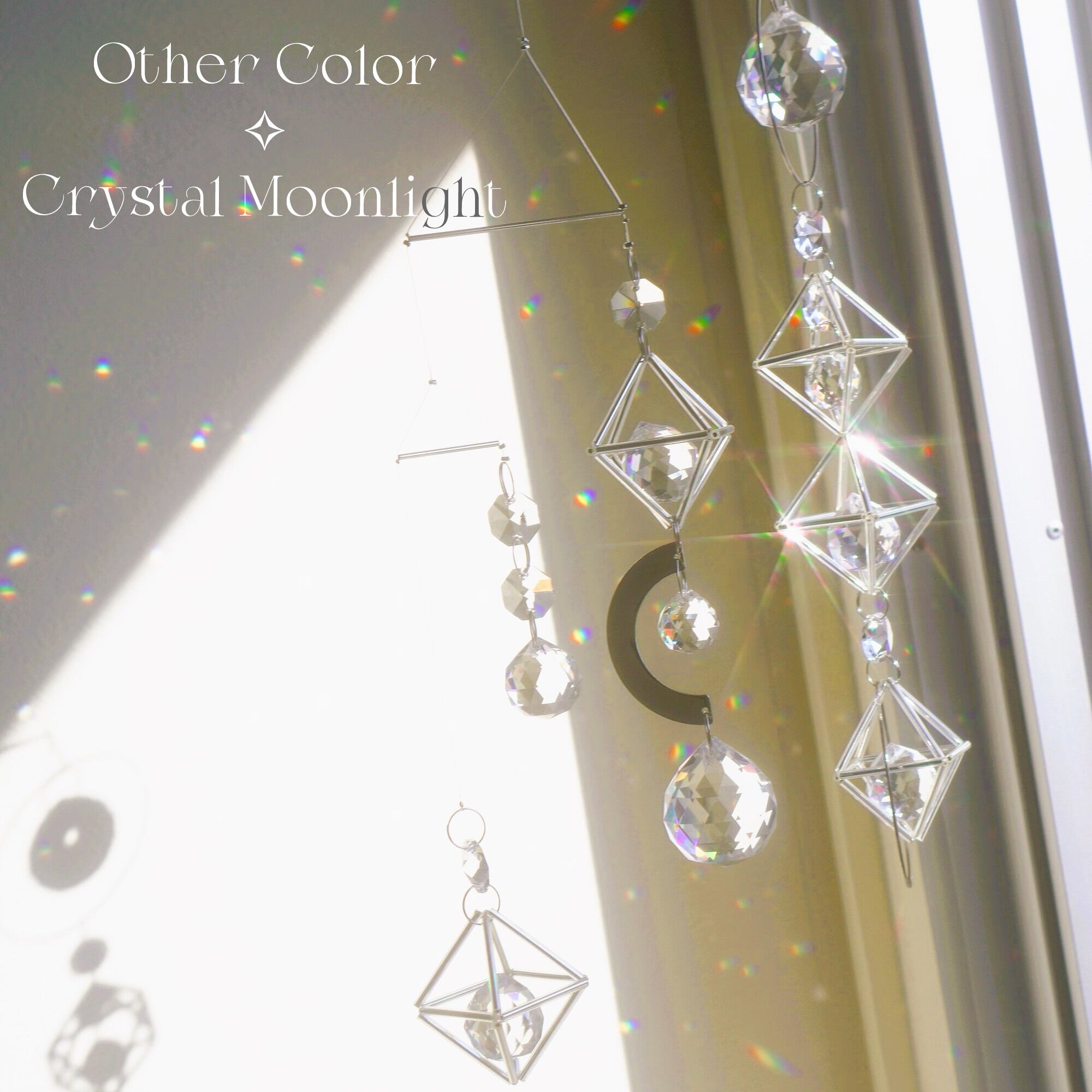 多面体ガラス以外にも光輝く素材が魅力で、光を反射するメタルパーツや、ヒンメリのような正八面体には、内側にシルバー箔が施されたガラスのパイプビーズを使用。直射日光を浴びた際はたくさんの虹色の光がお部屋に広がりながら、オブジェ自身もキラキラと光を放ちます。