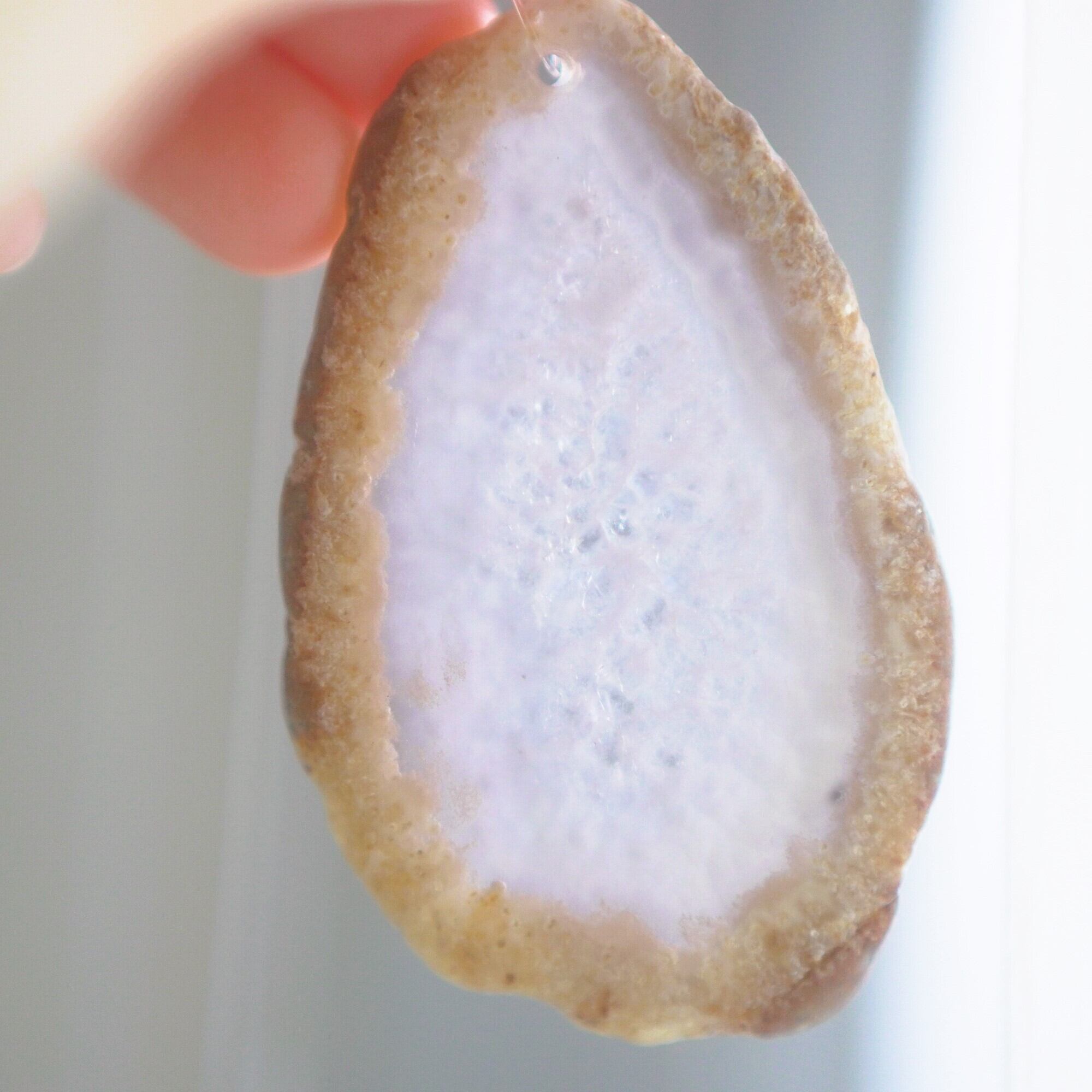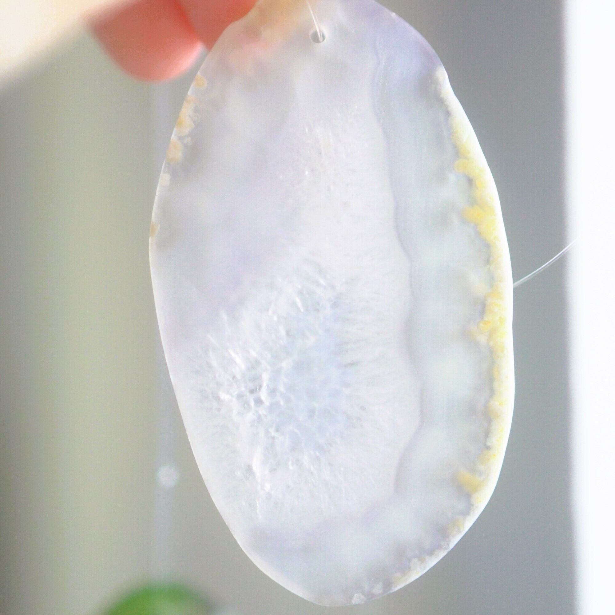 重ねる石同士の側面の加工状態によっても良い音が鳴ったり鳴らなかったり、石の見た目だけで組み合わせを決められないことが難しいポイントでもあるのですが、そんな中、たくさんの石の中から選ばれた5枚のスライスアゲートから出来上がったチャイムたちは、どこか悠々自適に空を泳ぐ妖精のようでもあり、それぞれの音を楽しそうに奏でてくれます。