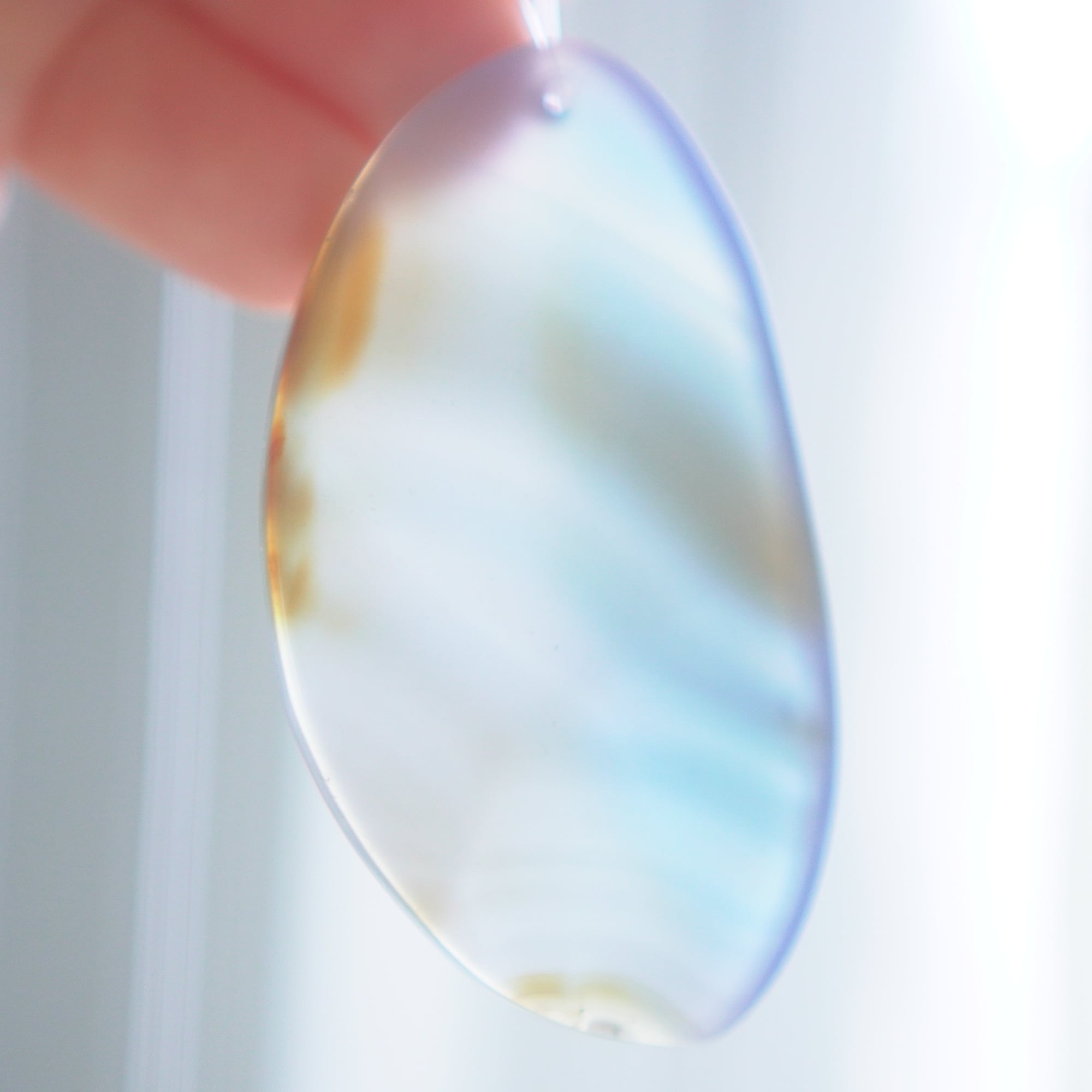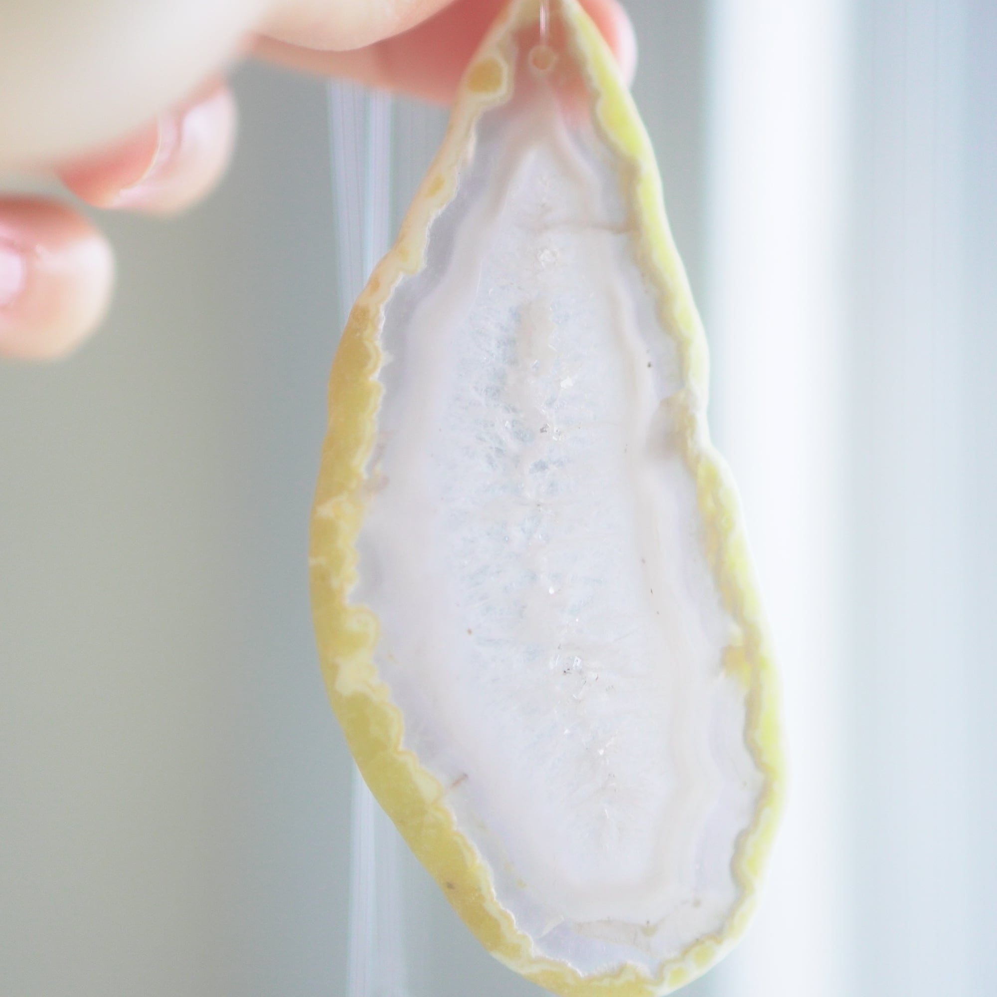 重ねる石同士の側面の加工状態によっても良い音が鳴ったり鳴らなかったり、石の見た目だけで組み合わせを決められないことが難しいポイントでもあるのですが、そんな中、たくさんの石の中から選ばれた5枚のスライスアゲートから出来上がったチャイムたちは、どこか悠々自適に空を泳ぐ妖精のようでもあり、それぞれの音を楽しそうに奏でてくれます。