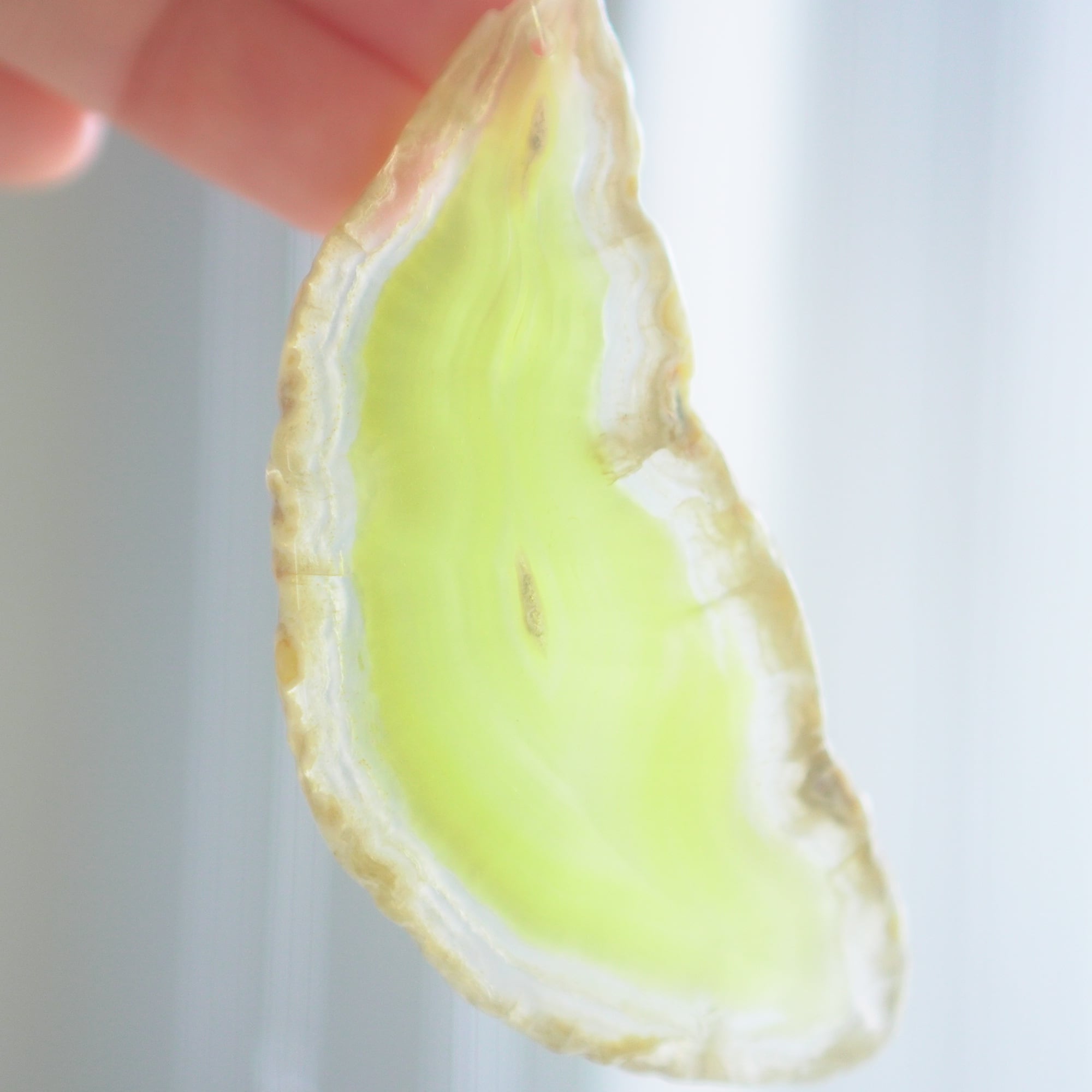 ✧染色の石なので耐光性(光による経年でのカラー変化の耐性)に優れているわけではなくベランダなど一日の中で長時間強い日光に当たるような場所に飾られるのはおすすめしないのですが、陽光に透かした時にだけ真価を発揮する美しさがありますので、是非、時折翳したりして光と一緒にお楽しみいただけたらと思います。特に濃い鮮やかな色など、色変化が気になられる場合は、日光のあまり当たらない場所に飾ってくださいね✧