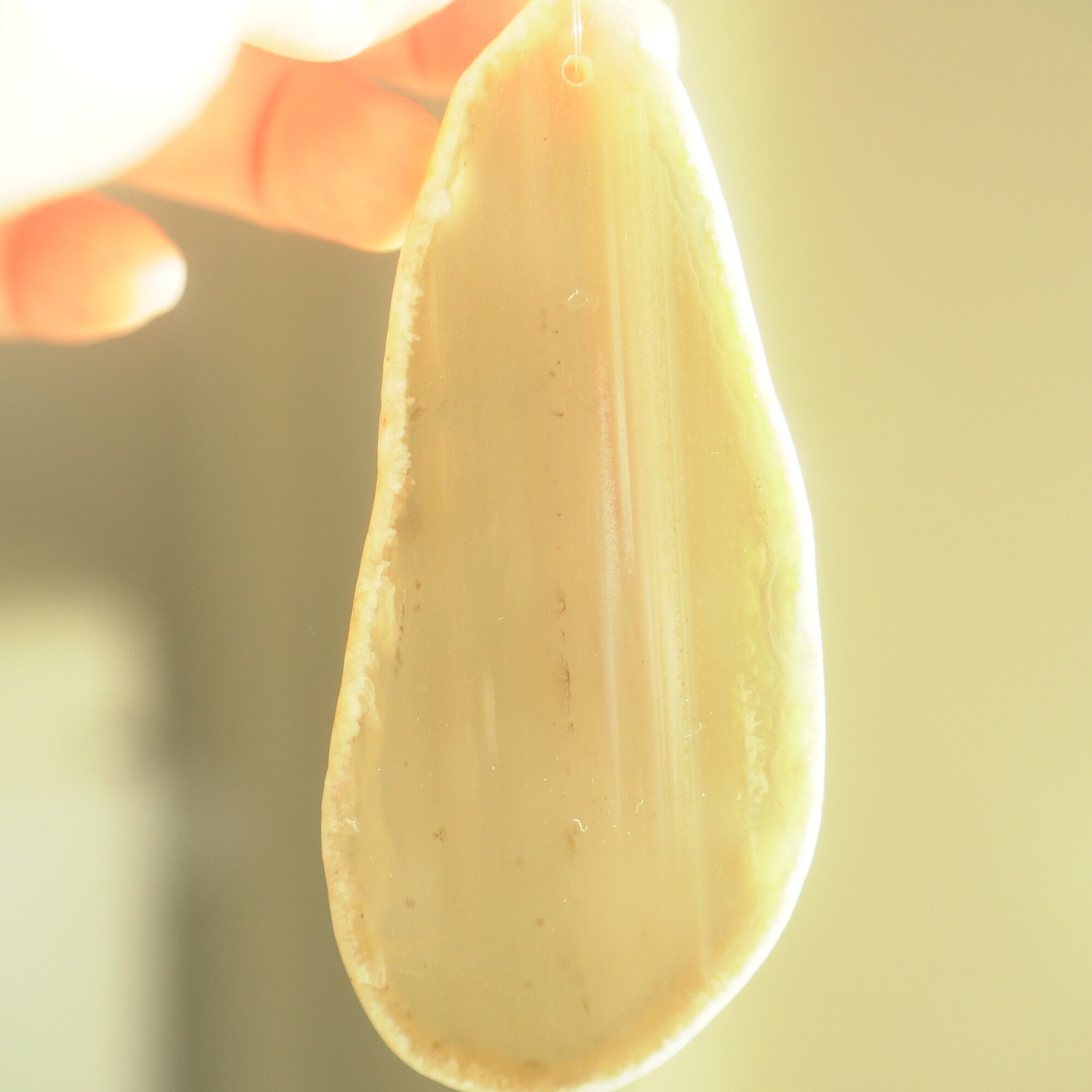 重ねる石同士の側面の加工状態によっても良い音が鳴ったり鳴らなかったり、石の見た目だけで組み合わせを決められないことが難しいポイントでもあるのですが、そんな中、たくさんの石の中から選ばれた5枚のスライスアゲートから出来上がったチャイムたちは、どこか悠々自適に空を泳ぐ妖精のようでもあり、それぞれの音を楽しそうに奏でてくれます。