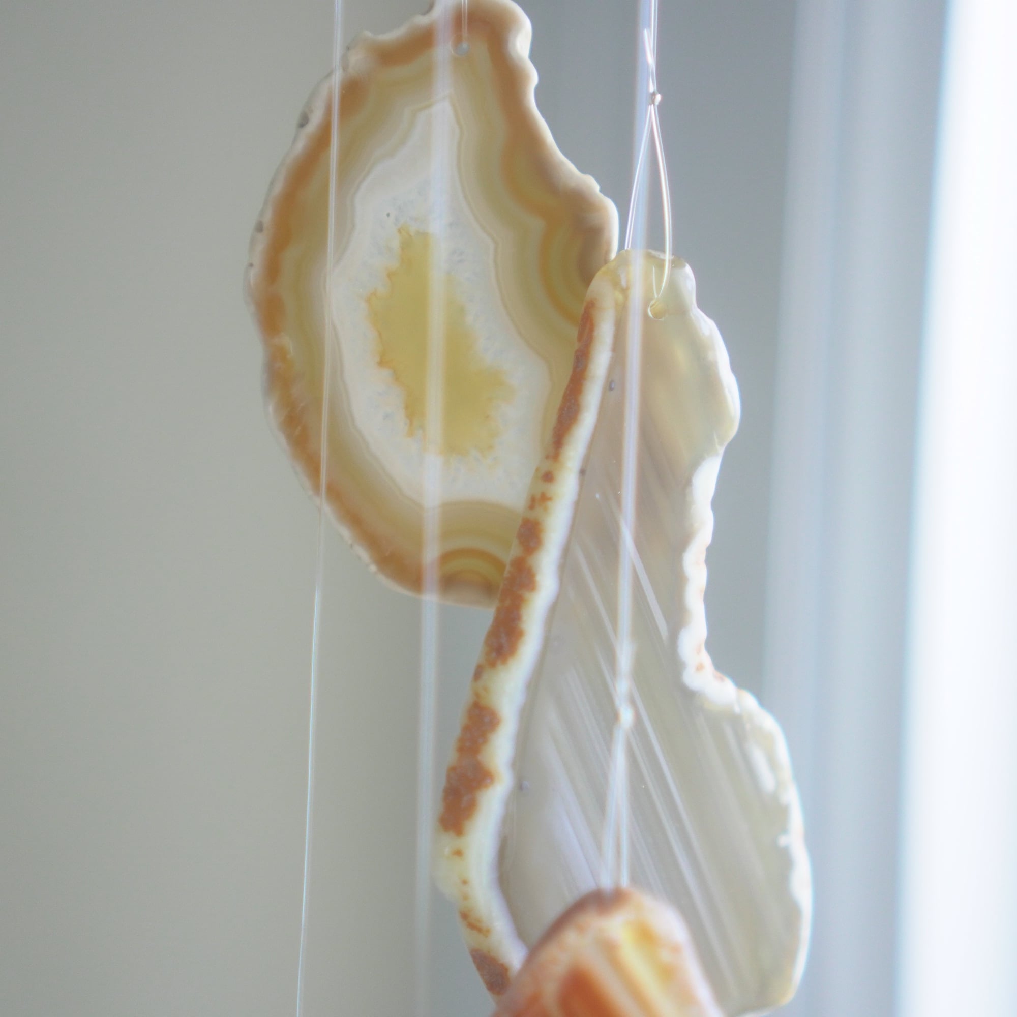 元々の瑪瑙風鈴とは使っている石の大きさや厚みが異なり、こちらのものはそれ同士重ねるだけでは特別音が鳴らない厚さのスライスアゲートを使用しているのですが、間に2本、細長い形状のアゲートを挟むことによって音が鳴る仕組みになっています。(もう少し変則的な組み合わせ方で音が鳴っていることもあります)