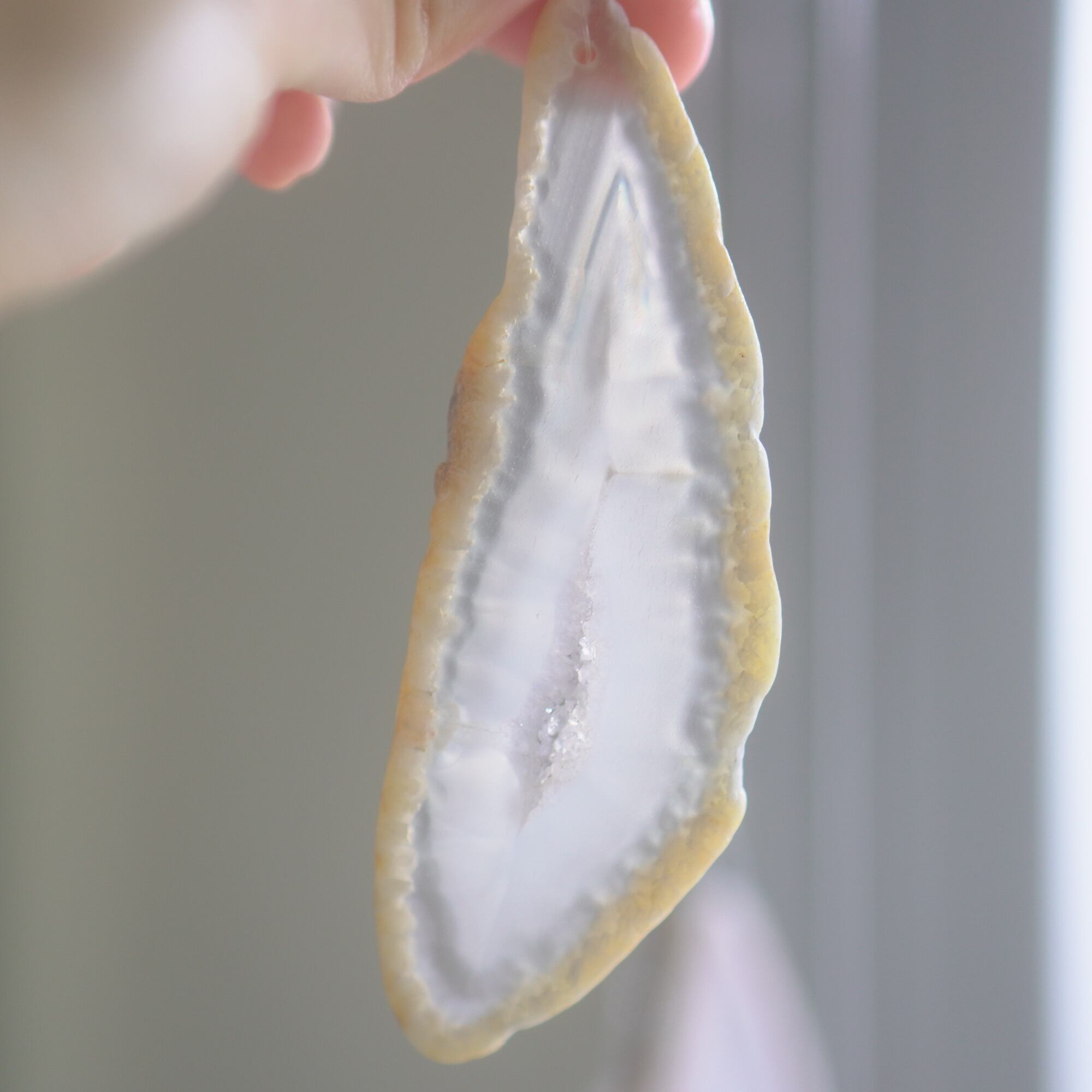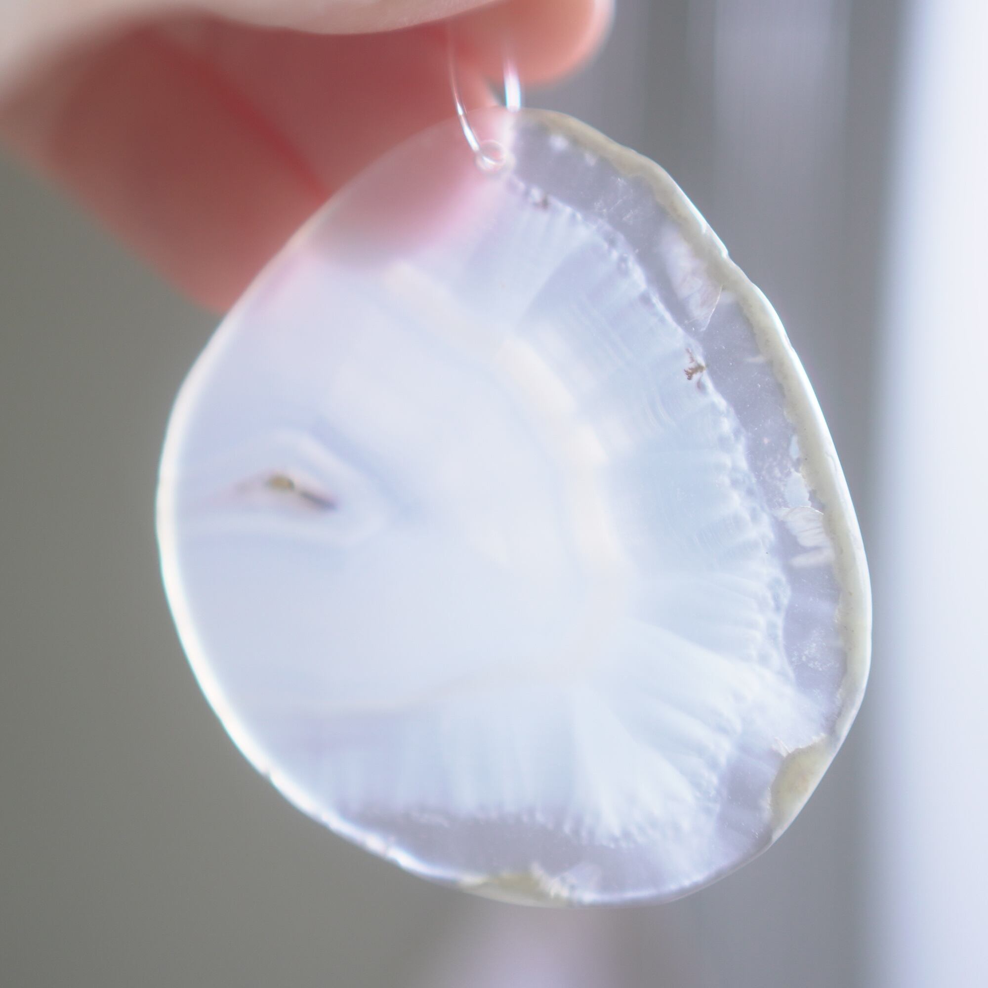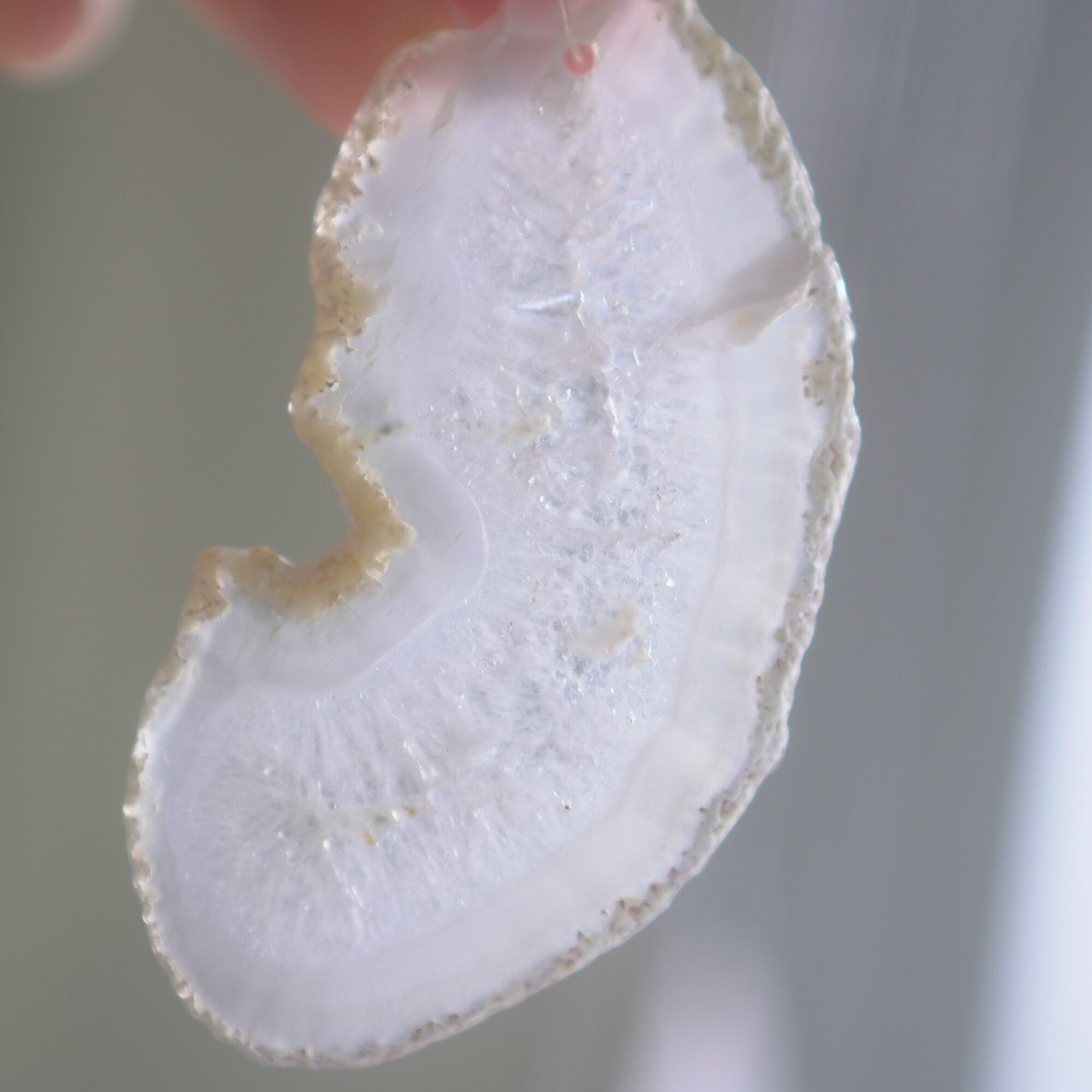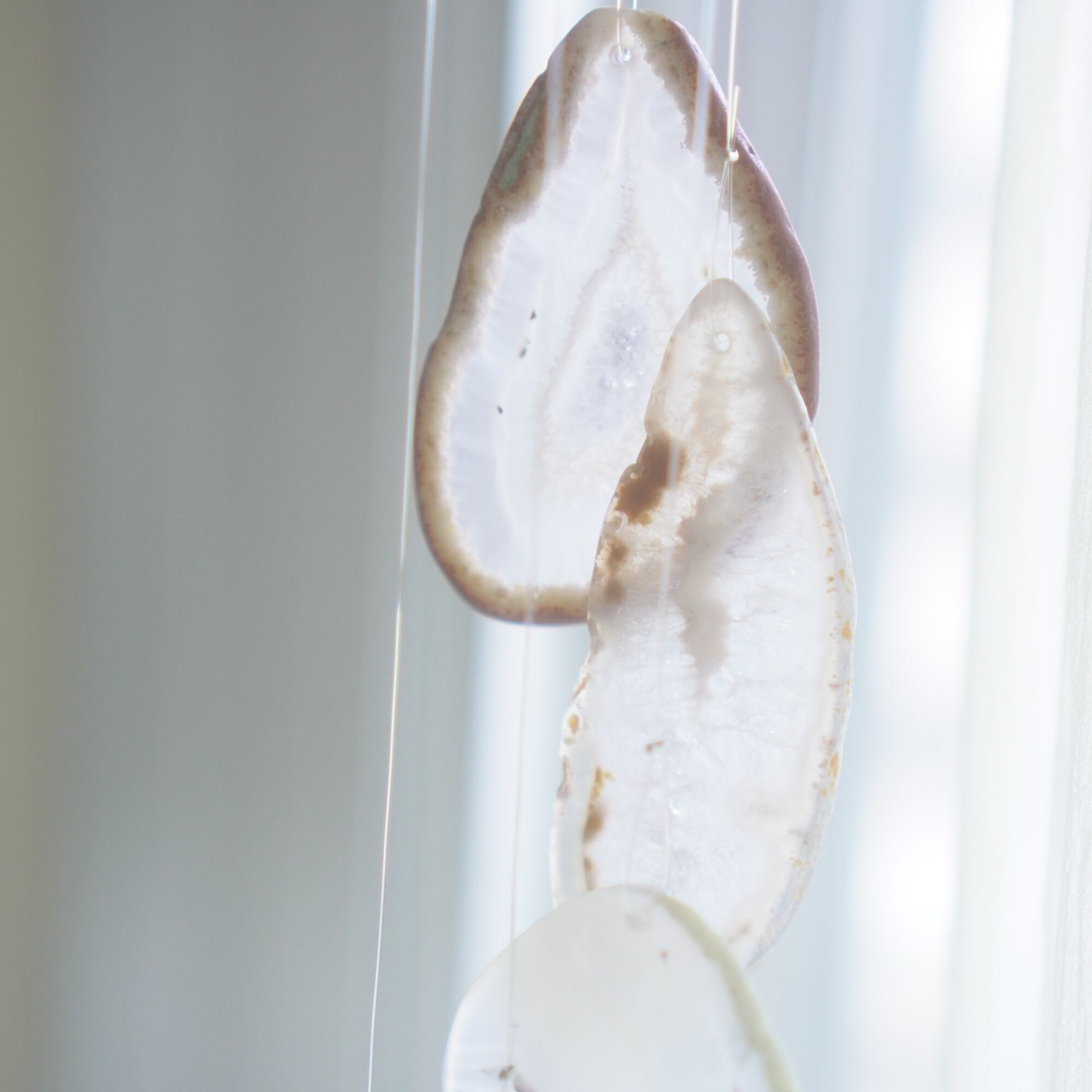 重ねる石同士の側面の加工状態によっても良い音が鳴ったり鳴らなかったり、石の見た目だけで組み合わせを決められないことが難しいポイントでもあるのですが、そんな中、たくさんの石の中から選ばれた5枚のスライスアゲートから出来上がったチャイムたちは、どこか悠々自適に空を泳ぐ妖精のようでもあり、それぞれの音を楽しそうに奏でてくれます。