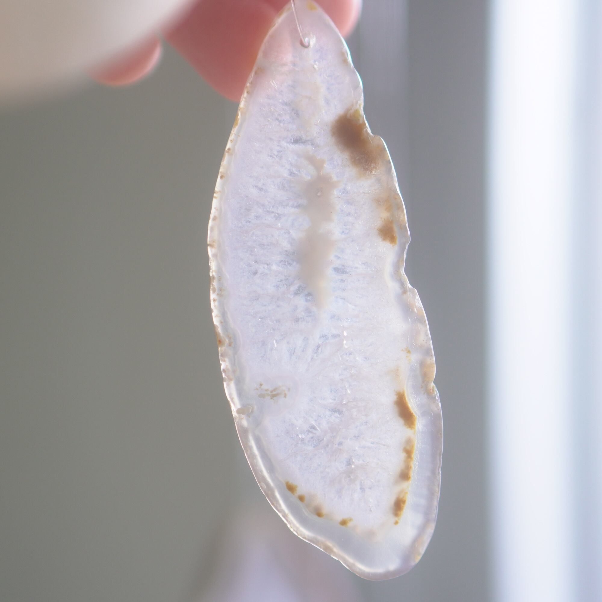 元々の瑪瑙風鈴とは使っている石の大きさや厚みが異なり、こちらのものはそれ同士重ねるだけでは特別音が鳴らない厚さのスライスアゲートを使用しているのですが、間に2本、細長い形状のアゲートを挟むことによって音が鳴る仕組みになっています。(もう少し変則的な組み合わせ方で音が鳴っていることもあります)