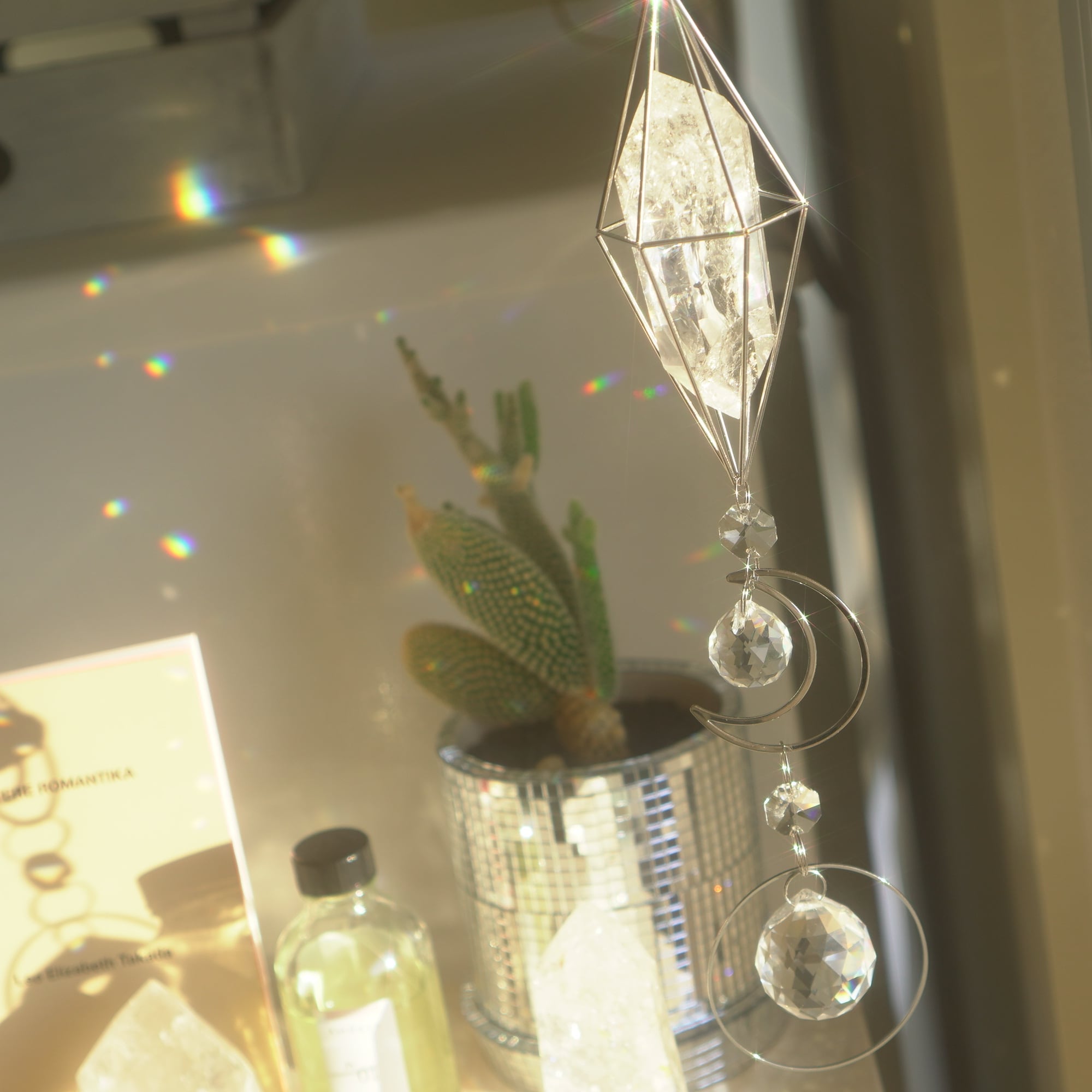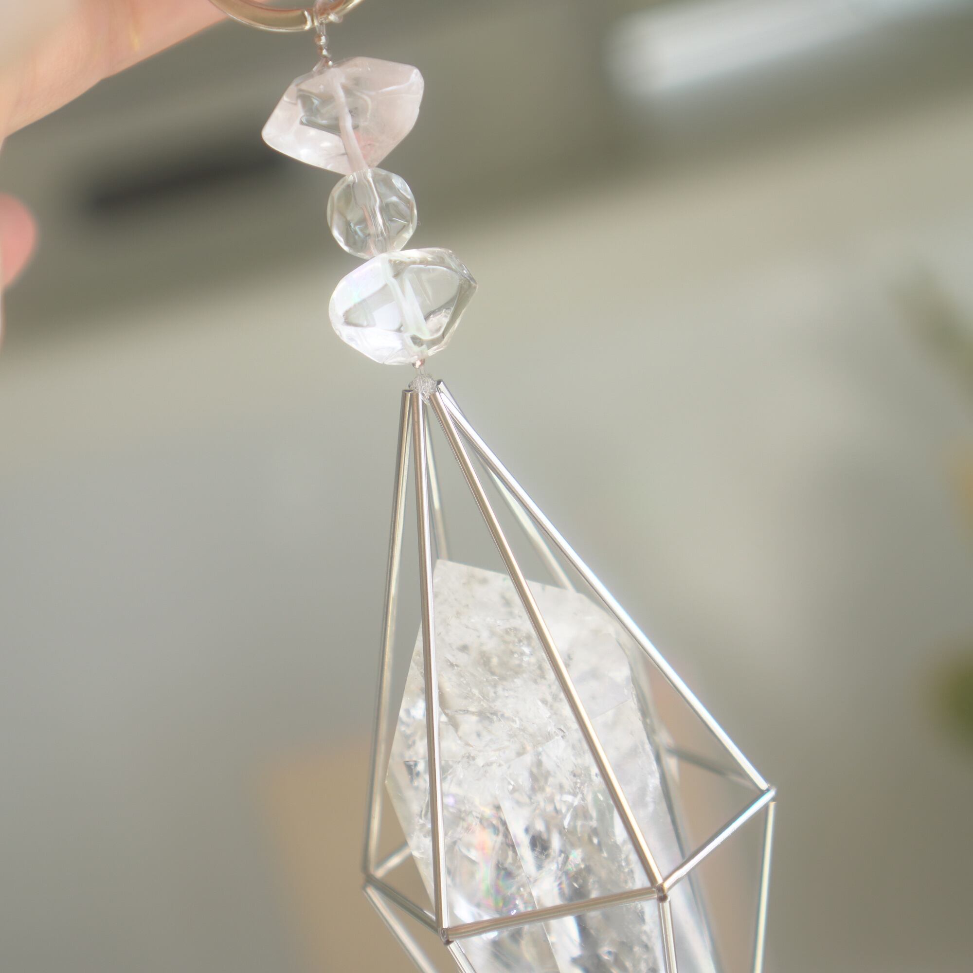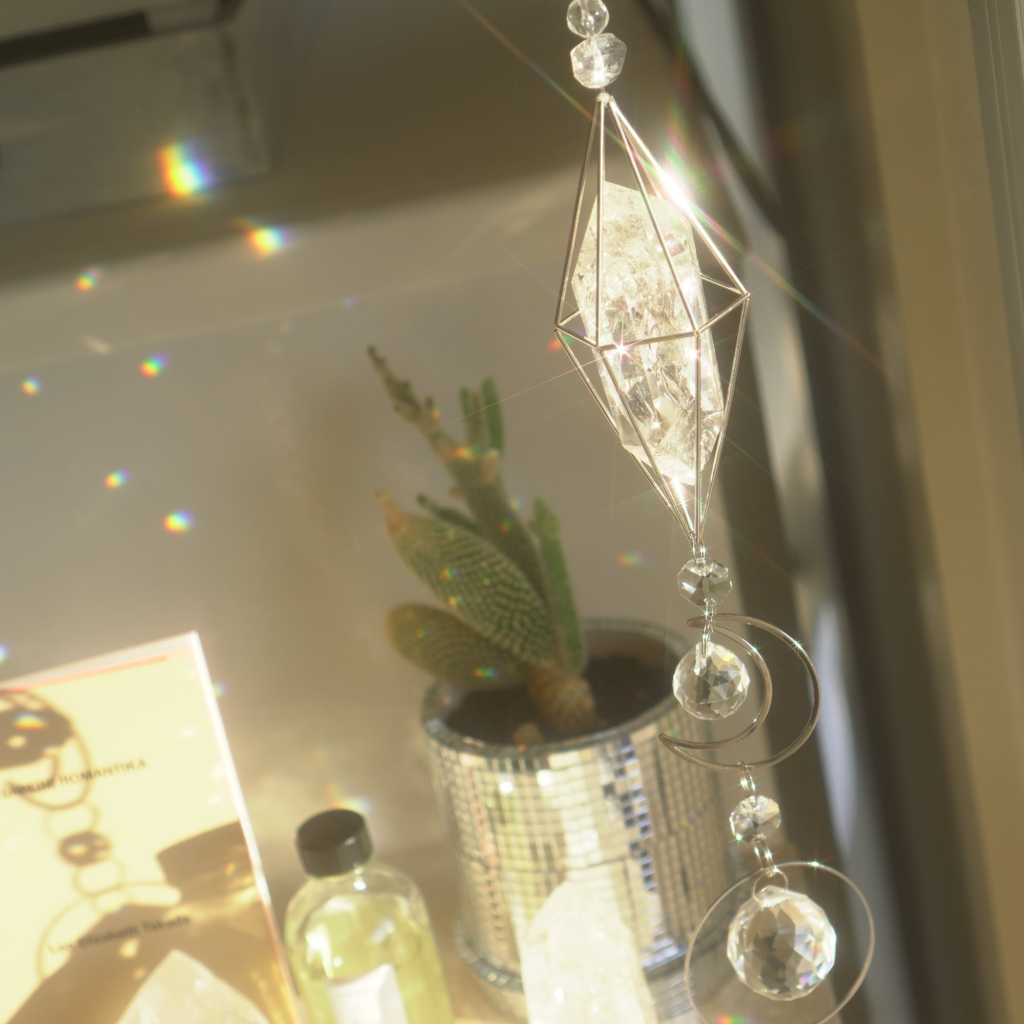 ヒンメリ用のメタルパイプを繋いだ幾何学形体に宿る、特別感のあるタワーカットの天然石。サンキャッチャーになるクリスタルカットのガラスボールやキラキラ輝くメタルパーツを組み合わせ、直射日光を浴びた際、キラキラと輝きながらたくさんの虹色の光がお部屋に広がります。