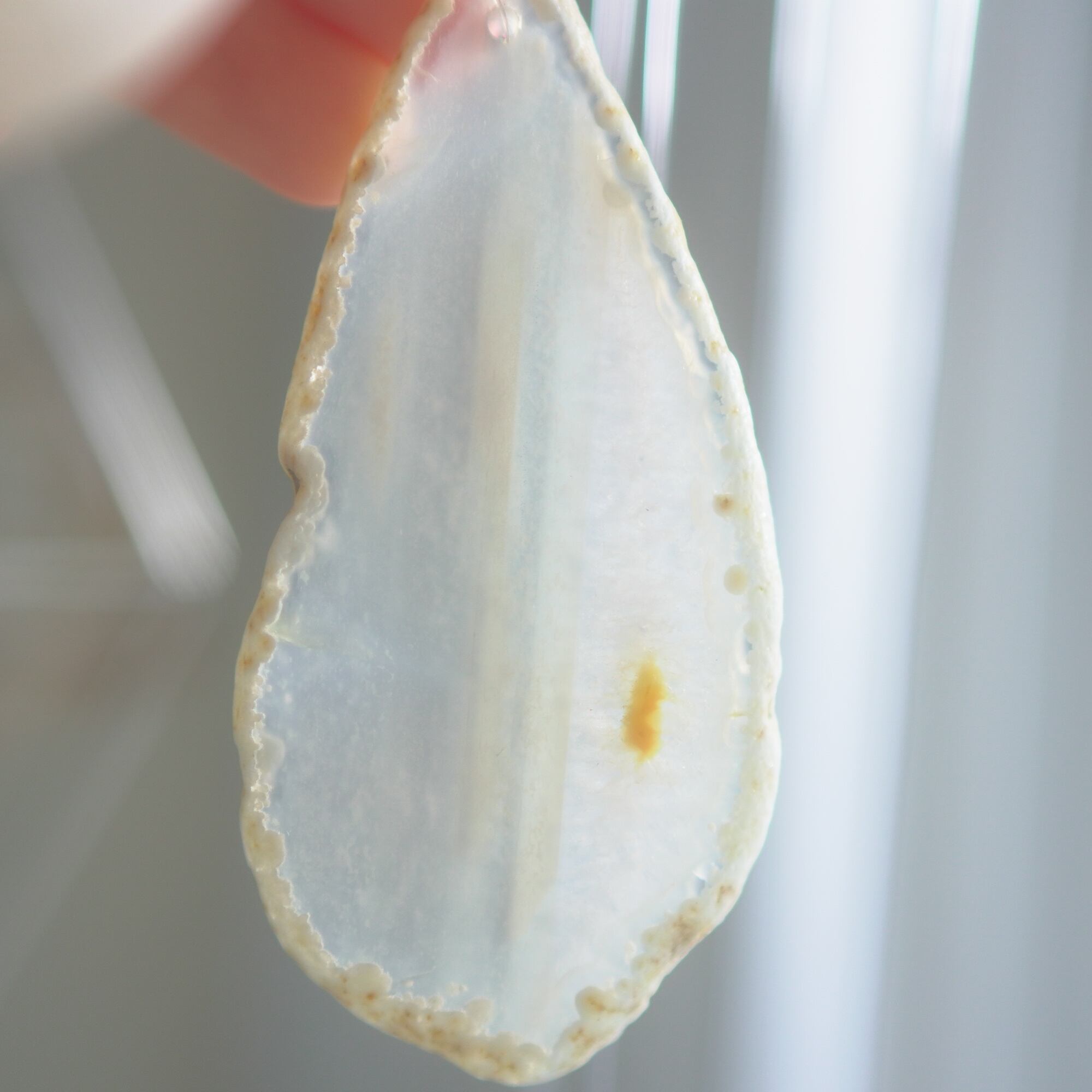 元々の瑪瑙風鈴とは使っている石の大きさや厚みが異なり、こちらのものはそれ同士重ねるだけでは特別音が鳴らない厚さのスライスアゲートを使用しているのですが、間に2本、細長い形状のアゲートを挟むことによって音が鳴る仕組みになっています。(もう少し変則的な組み合わせ方で音が鳴っていることもあります)