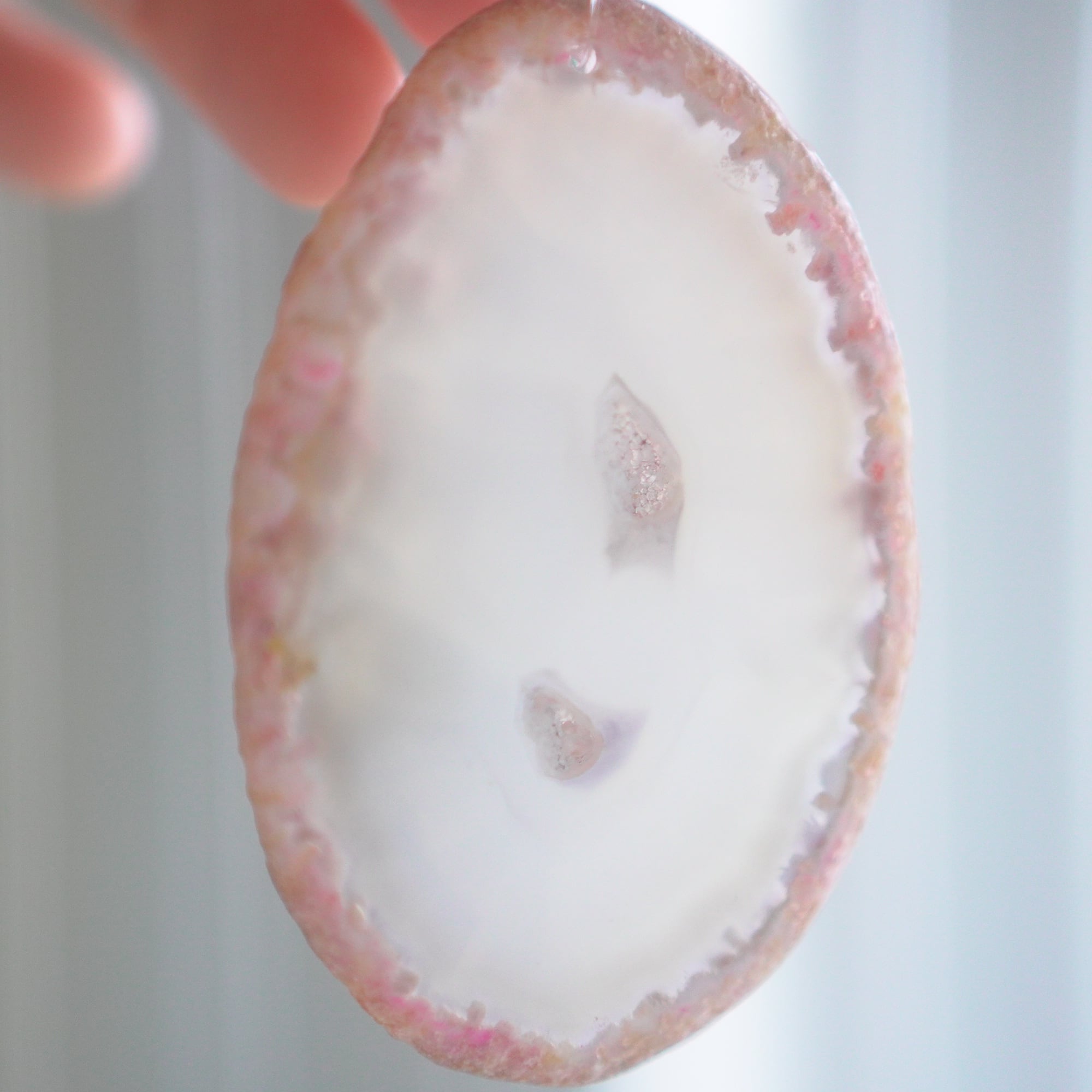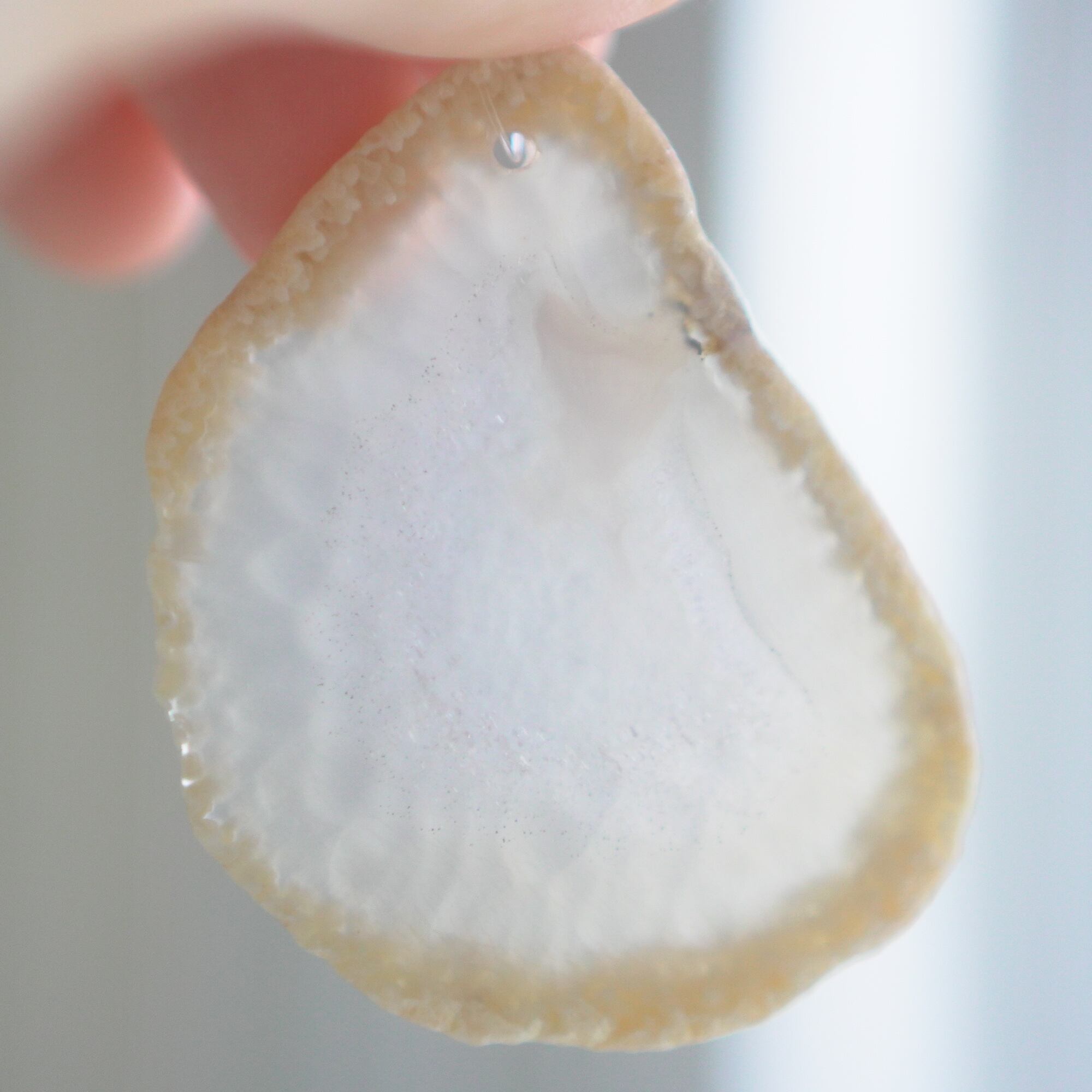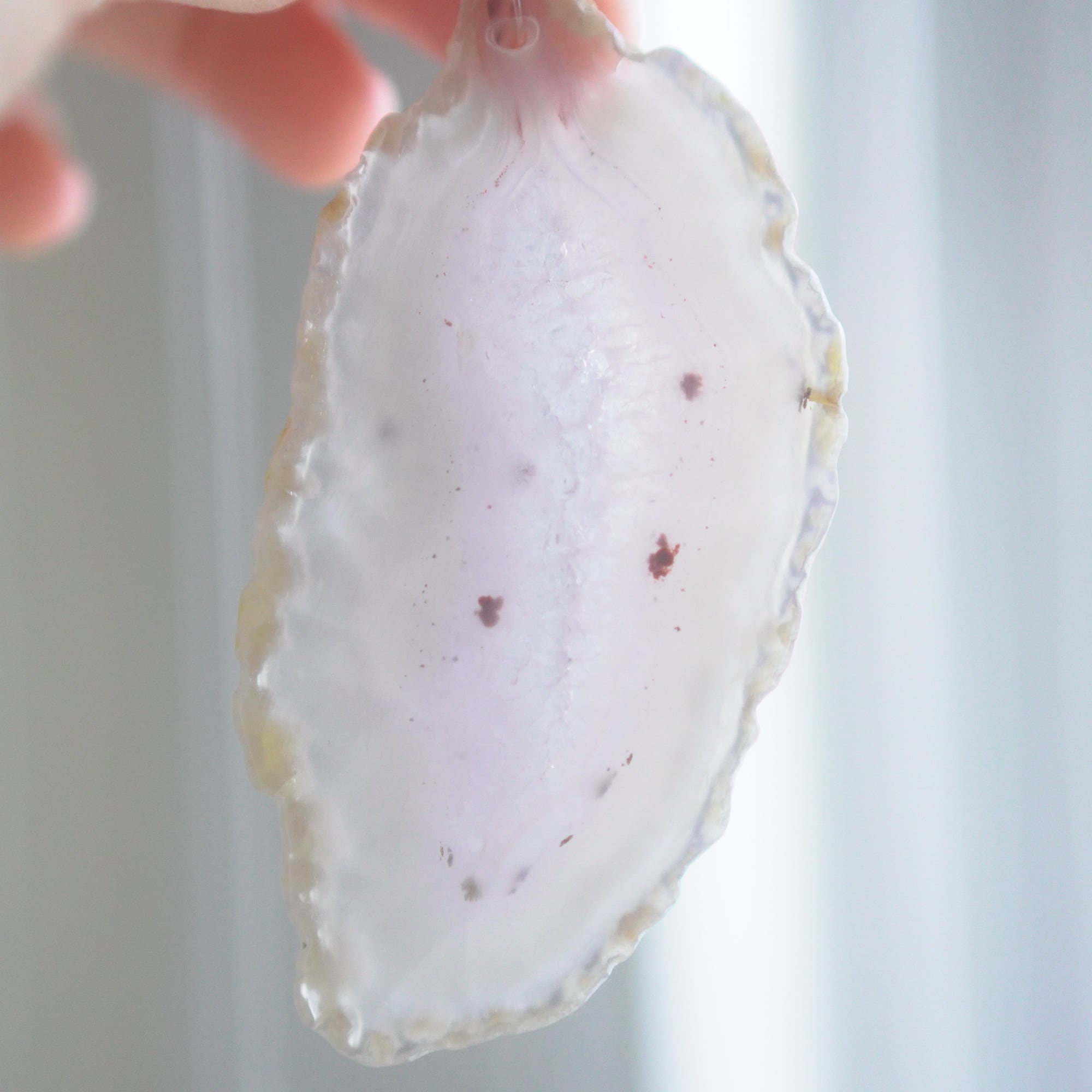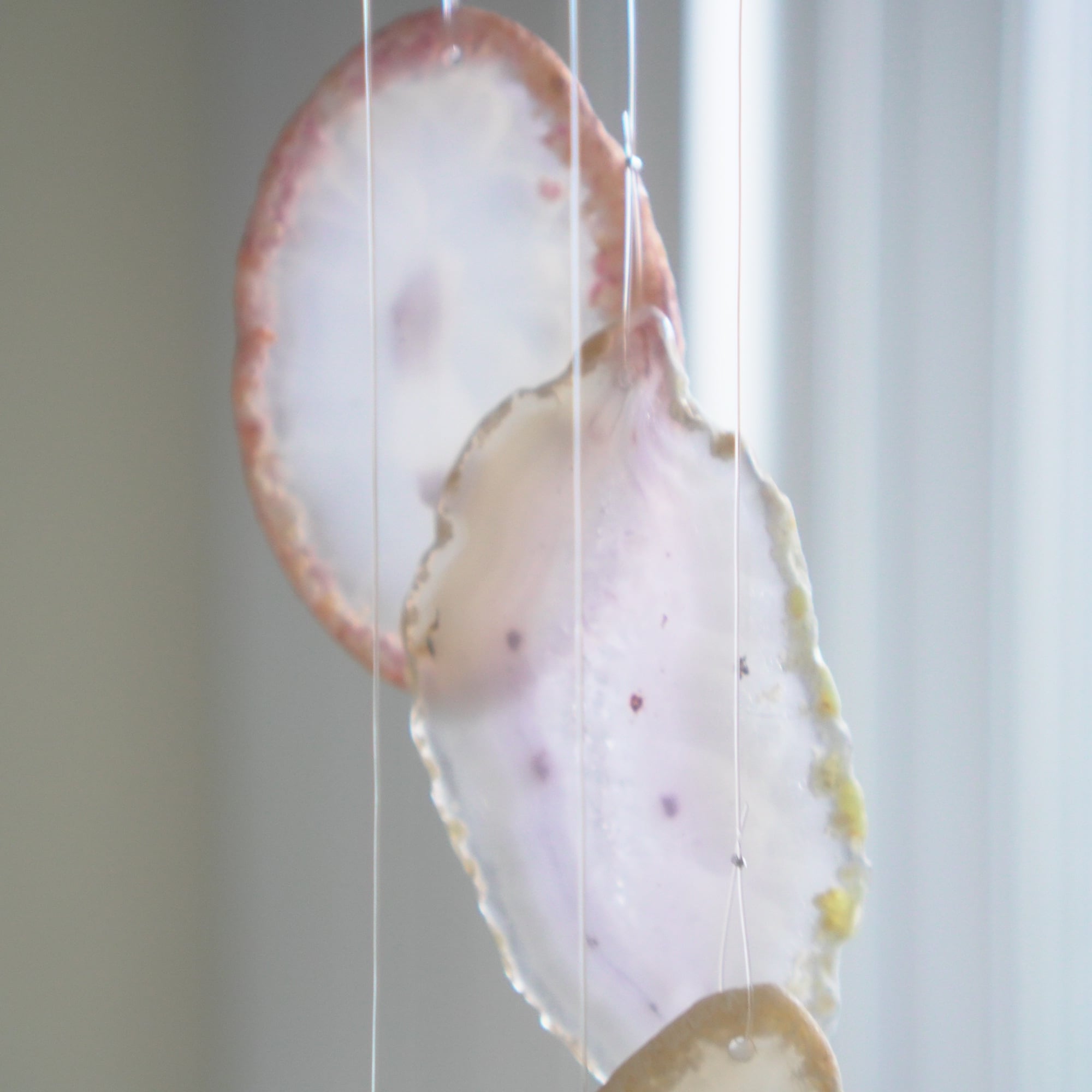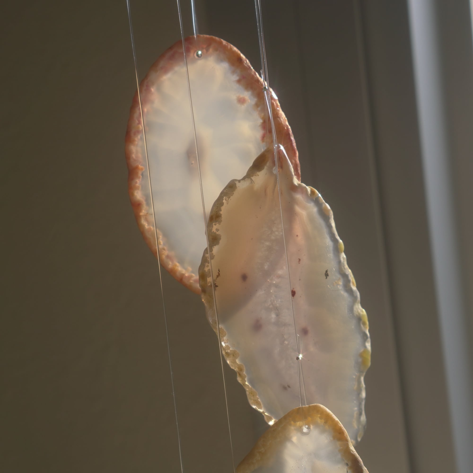 重ねる石同士の側面の加工状態によっても良い音が鳴ったり鳴らなかったり、石の見た目だけで組み合わせを決められないことが難しいポイントでもあるのですが、そんな中、たくさんの石の中から選ばれた5枚のスライスアゲートから出来上がったチャイムたちは、どこか悠々自適に空を泳ぐ妖精のようでもあり、それぞれの音を楽しそうに奏でてくれます。