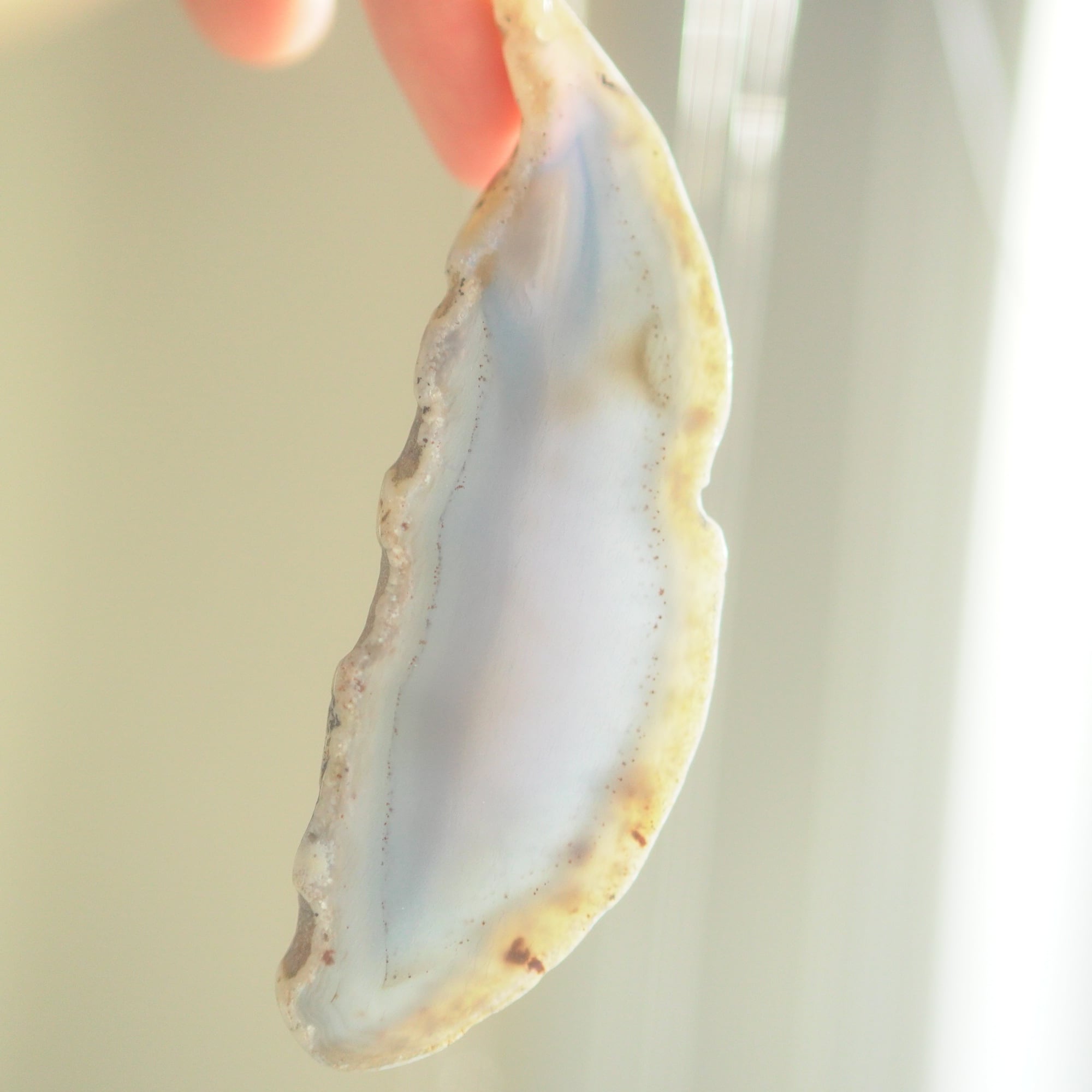重ねる石同士の側面の加工状態によっても良い音が鳴ったり鳴らなかったり、石の見た目だけで組み合わせを決められないことが難しいポイントでもあるのですが、そんな中、たくさんの石の中から選ばれた5枚のスライスアゲートから出来上がったチャイムたちは、どこか悠々自適に空を泳ぐ妖精のようでもあり、それぞれの音を楽しそうに奏でてくれます。