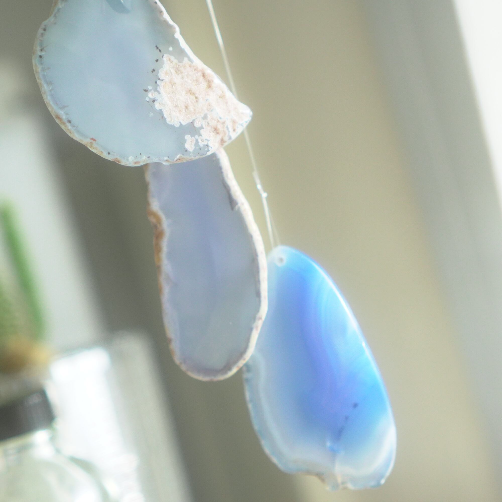 重ねる石同士の側面の加工状態によっても良い音が鳴ったり鳴らなかったり、石の見た目だけで組み合わせを決められないことが難しいポイントでもあるのですが、そんな中、たくさんの石の中から選ばれた5枚のスライスアゲートから出来上がったチャイムたちは、どこか悠々自適に空を泳ぐ妖精のようでもあり、それぞれの音を楽しそうに奏でてくれます。