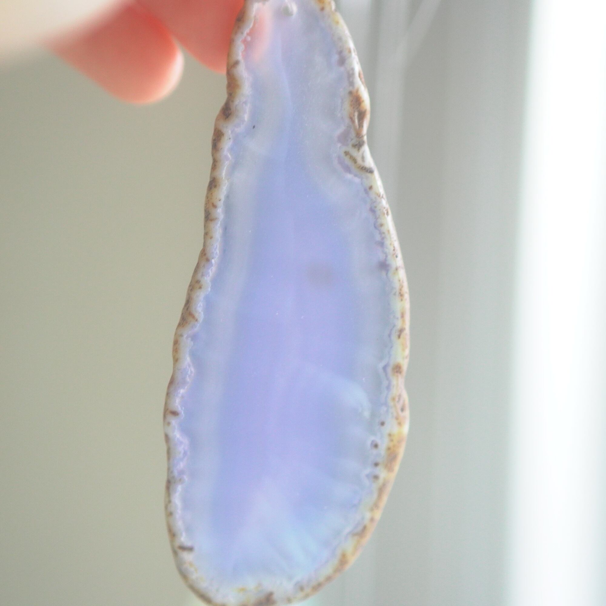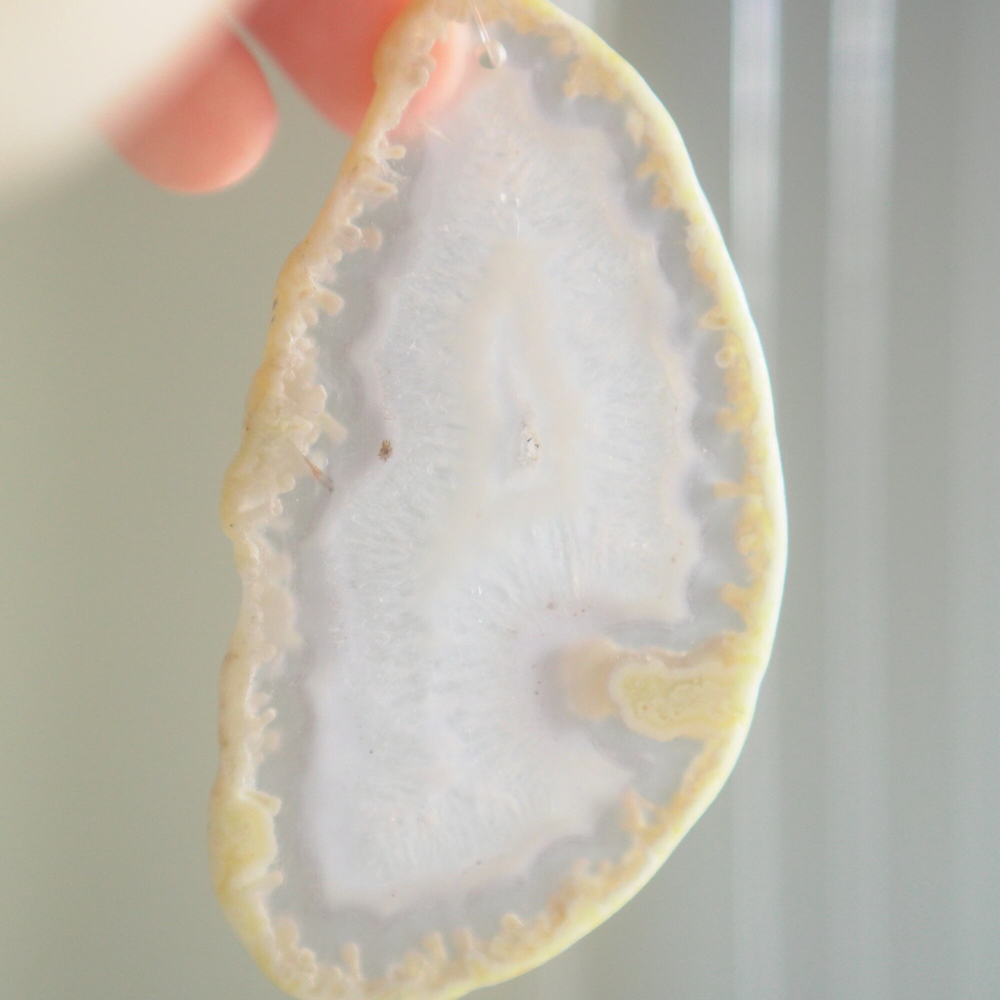 重ねる石同士の側面の加工状態によっても良い音が鳴ったり鳴らなかったり、石の見た目だけで組み合わせを決められないことが難しいポイントでもあるのですが、そんな中、たくさんの石の中から選ばれた5枚のスライスアゲートから出来上がったチャイムたちは、どこか悠々自適に空を泳ぐ妖精のようでもあり、それぞれの音を楽しそうに奏でてくれます。