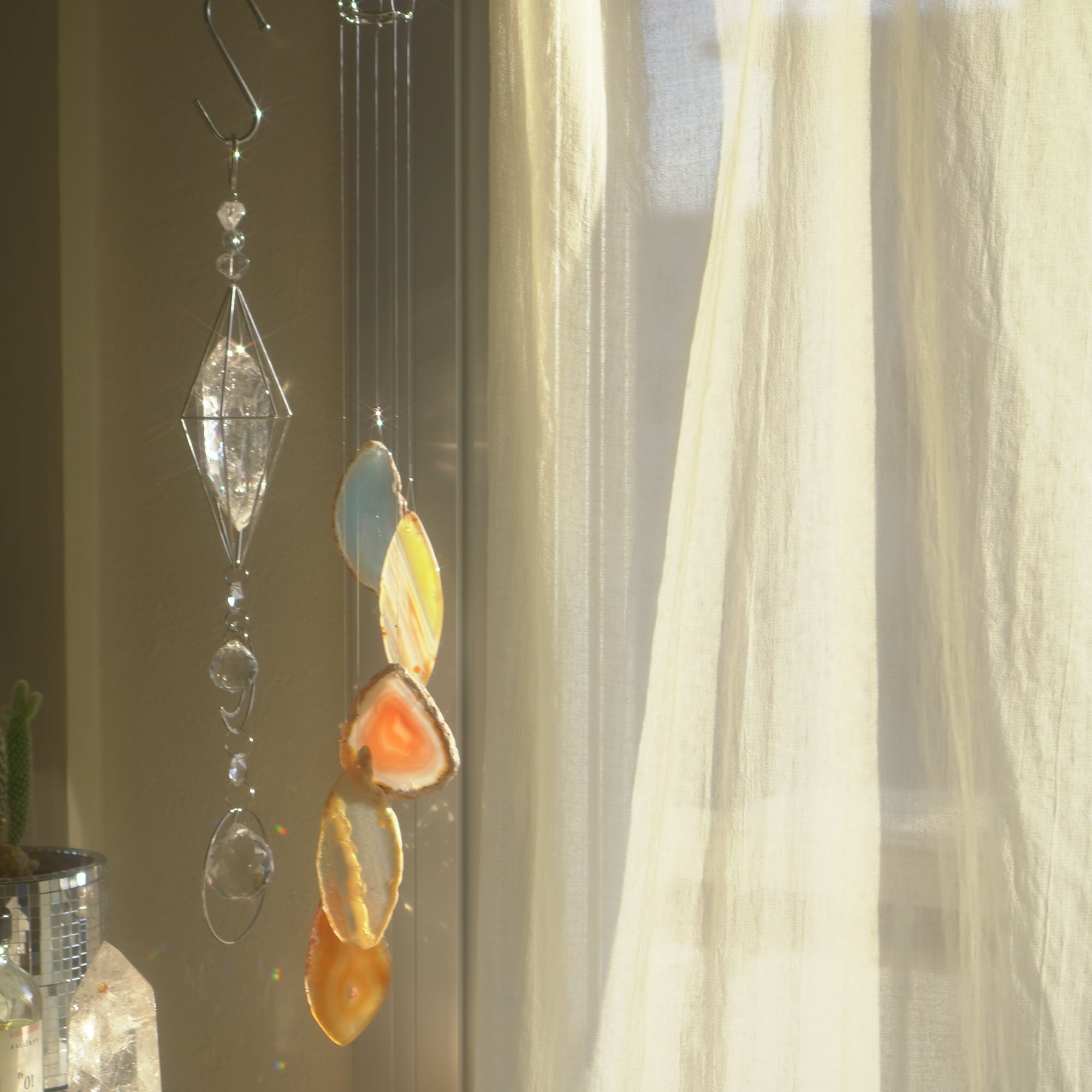 そしてカーテン越しではなく直射日光を当てた際のサンキャッチャーとしてのチャイムも、ピカピカとした美しい光をお部屋の中に運んでくれます。