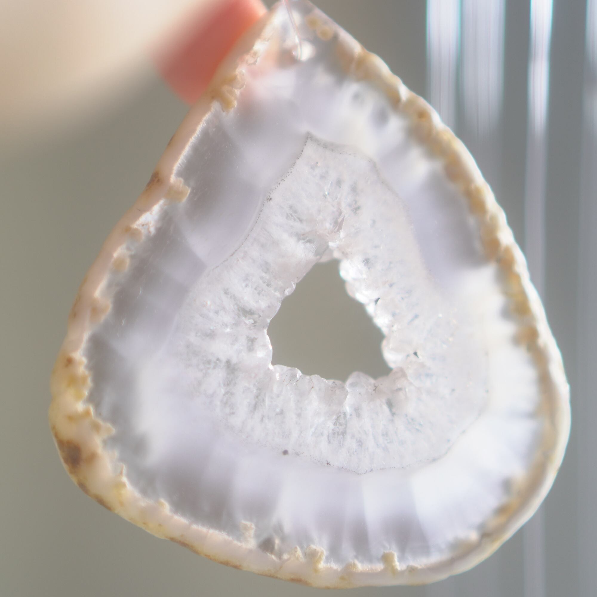 元々の瑪瑙風鈴とは使っている石の大きさや厚みが異なり、こちらのものはそれ同士重ねるだけでは特別音が鳴らない厚さのスライスアゲートを使用しているのですが、間に2本、細長い形状のアゲートを挟むことによって音が鳴る仕組みになっています。(もう少し変則的な組み合わせ方で音が鳴っていることもあります)