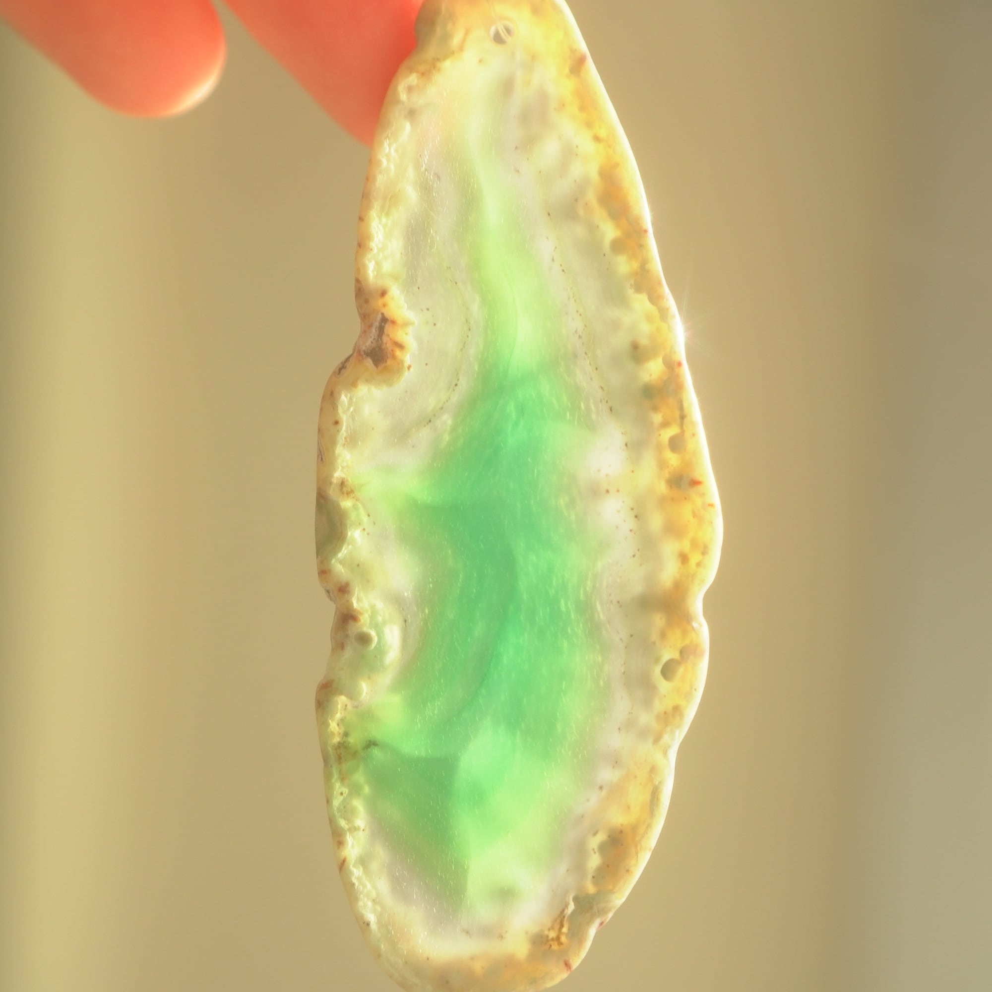 ✧染色の石なので耐光性(光による経年でのカラー変化の耐性)に優れているわけではなくベランダなど一日の中で長時間強い日光に当たるような場所に飾られるのはおすすめしないのですが、陽光に透かした時にだけ真価を発揮する美しさがありますので、是非、時折翳したりして光と一緒にお楽しみいただけたらと思います。特に濃い鮮やかな色など、色変化が気になられる場合は、日光のあまり当たらない場所に飾ってくださいね✧
