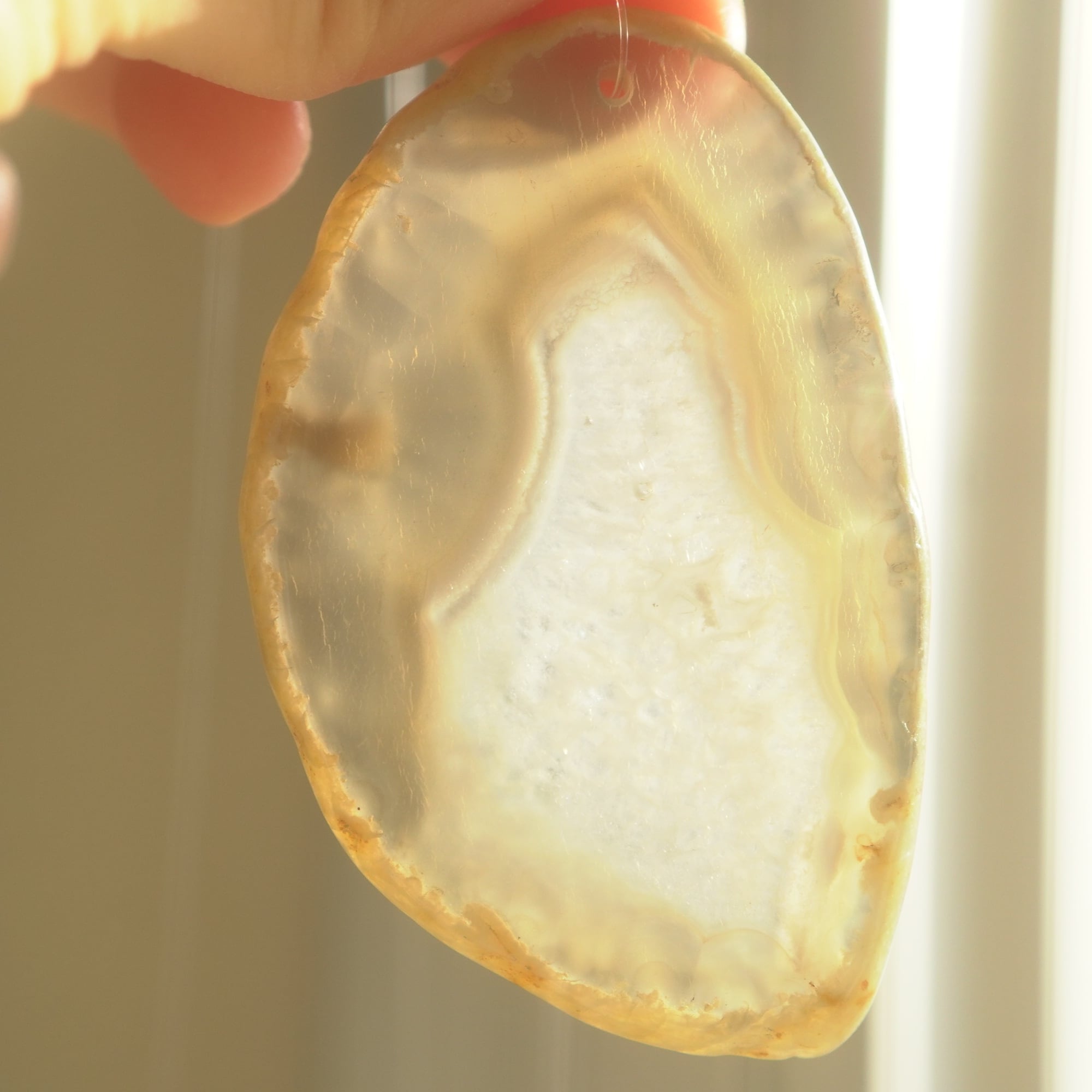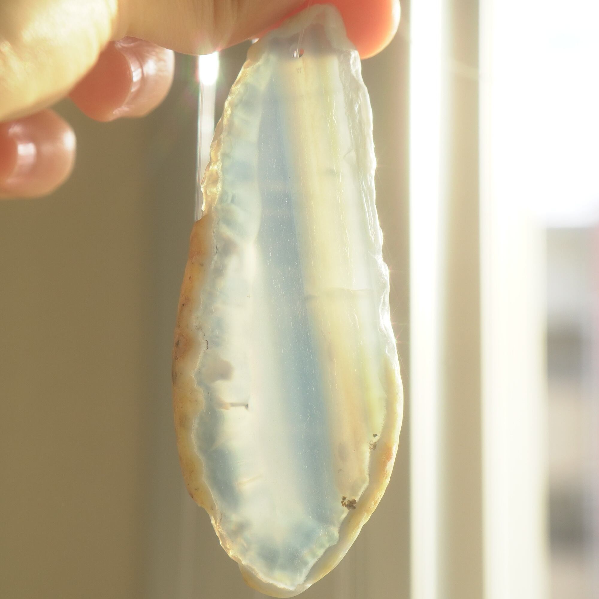 重ねる石同士の側面の加工状態によっても良い音が鳴ったり鳴らなかったり、石の見た目だけで組み合わせを決められないことが難しいポイントでもあるのですが、そんな中、たくさんの石の中から選ばれた5枚のスライスアゲートから出来上がったチャイムたちは、どこか悠々自適に空を泳ぐ妖精のようでもあり、それぞれの音を楽しそうに奏でてくれます。