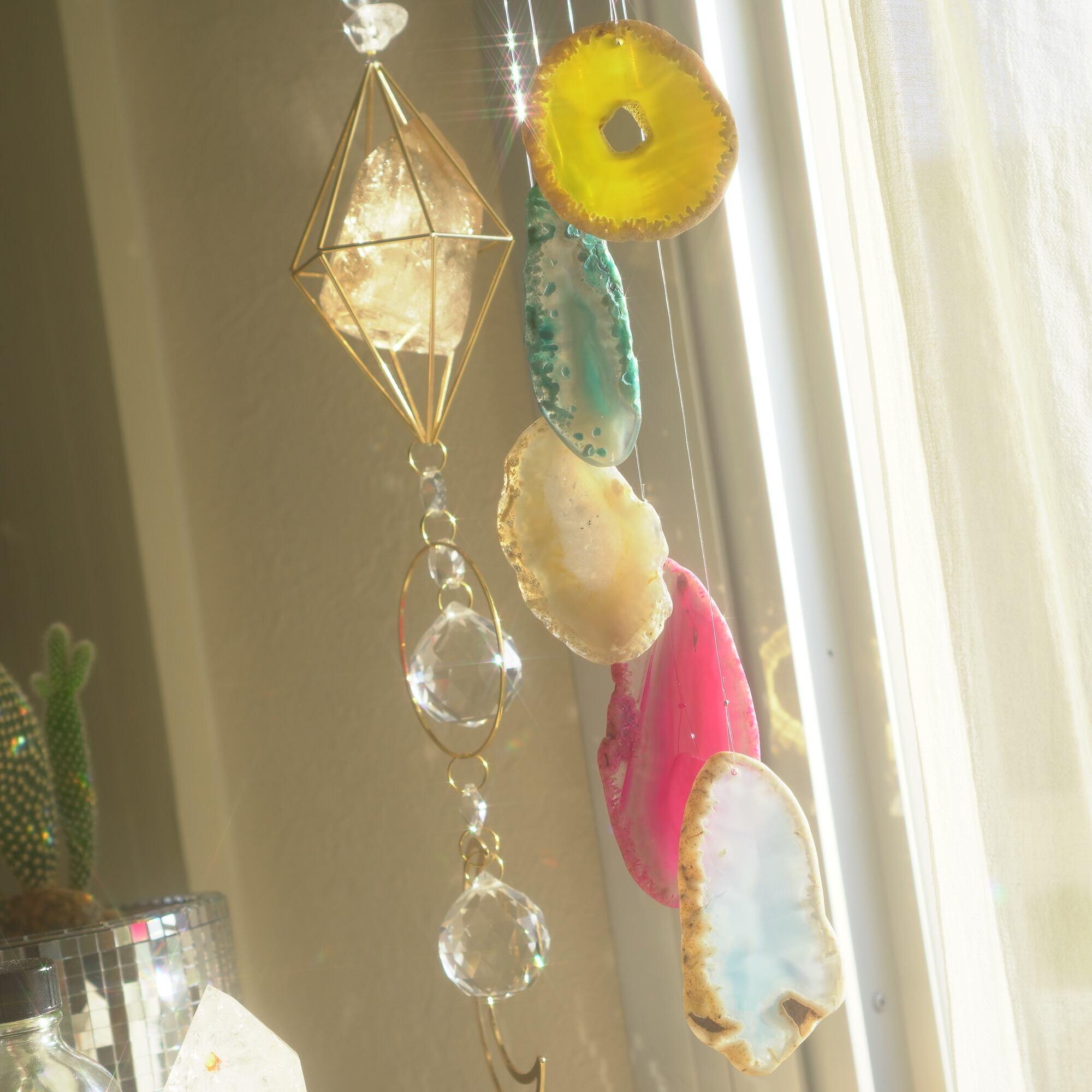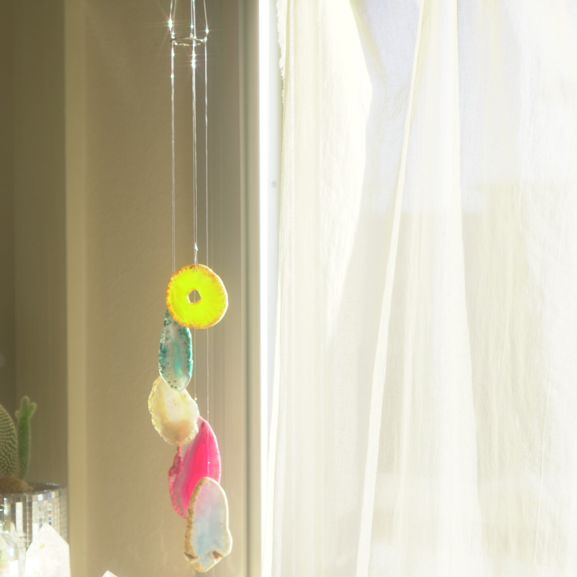 そしてカーテン越しではなく直射日光を当てた際のサンキャッチャーとしてのチャイムも、ピカピカとした美しい光をお部屋の中に運んでくれます。