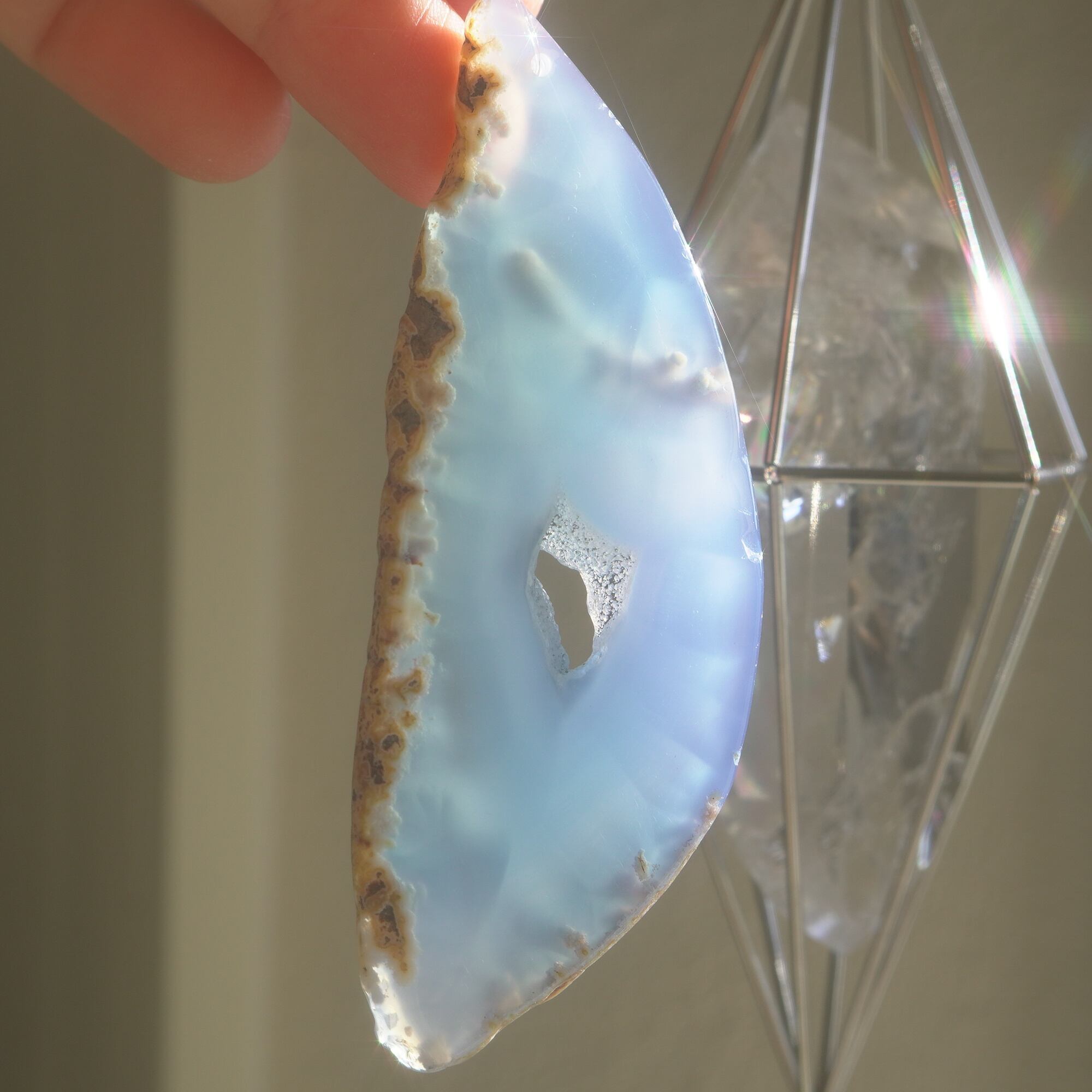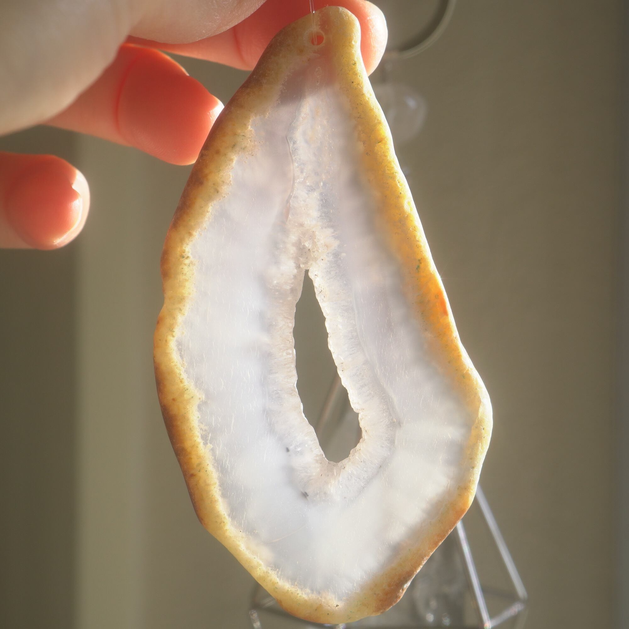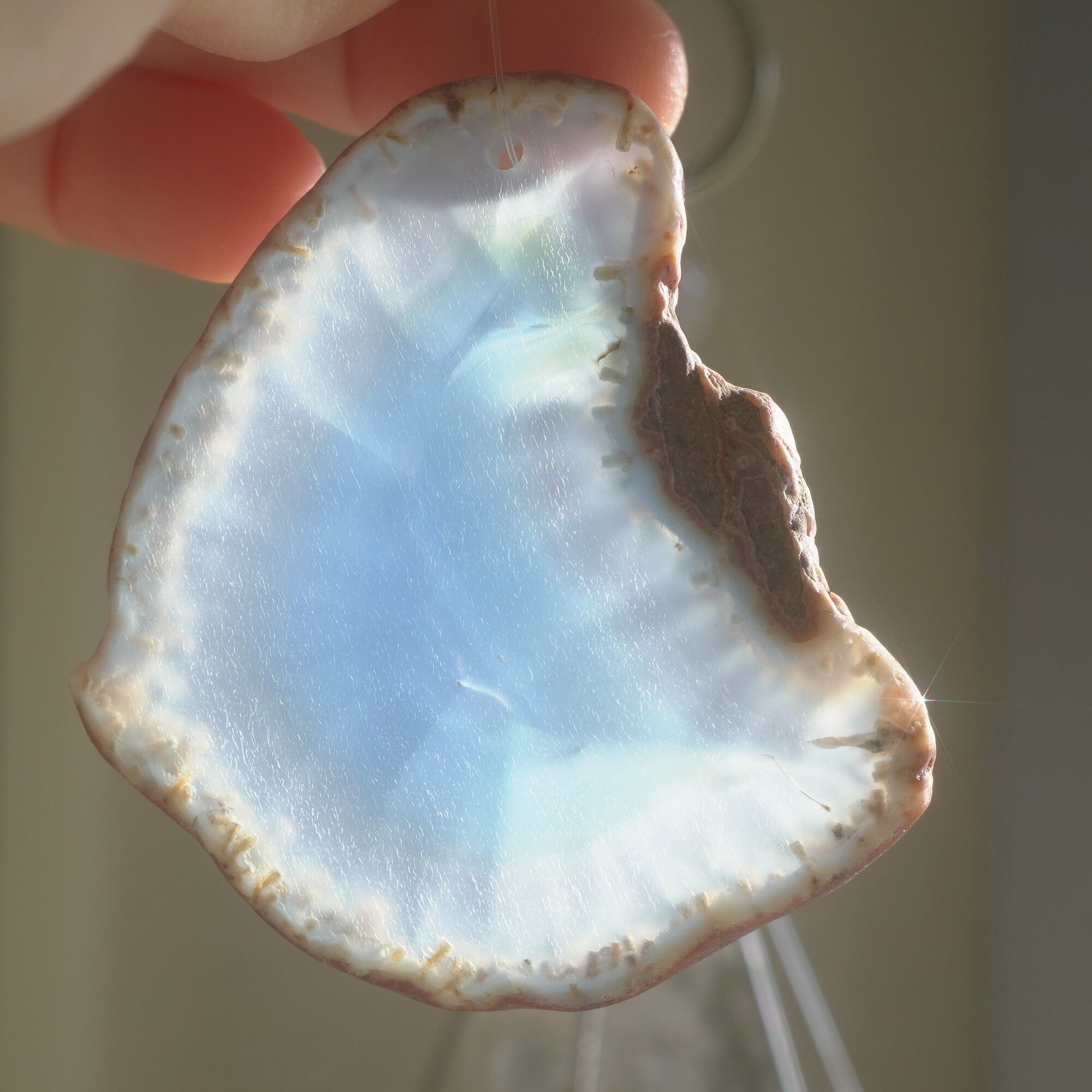 重ねる石同士の側面の加工状態によっても良い音が鳴ったり鳴らなかったり、石の見た目だけで組み合わせを決められないことが難しいポイントでもあるのですが、そんな中、たくさんの石の中から選ばれた5枚のスライスアゲートから出来上がったチャイムたちは、どこか悠々自適に空を泳ぐ妖精のようでもあり、それぞれの音を楽しそうに奏でてくれます。