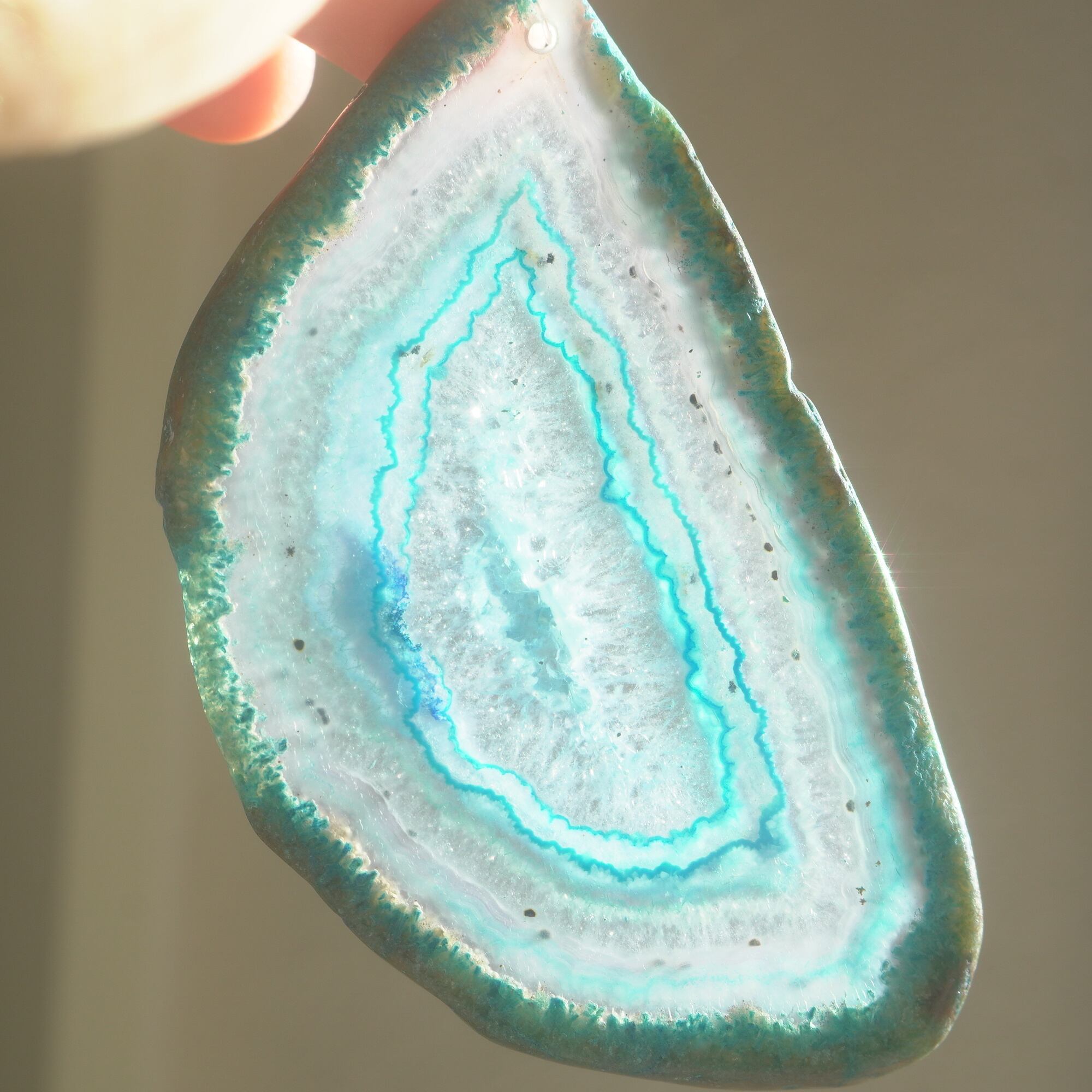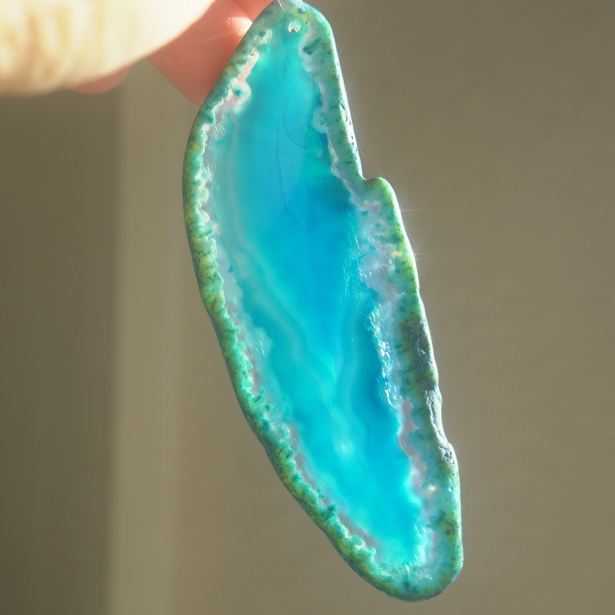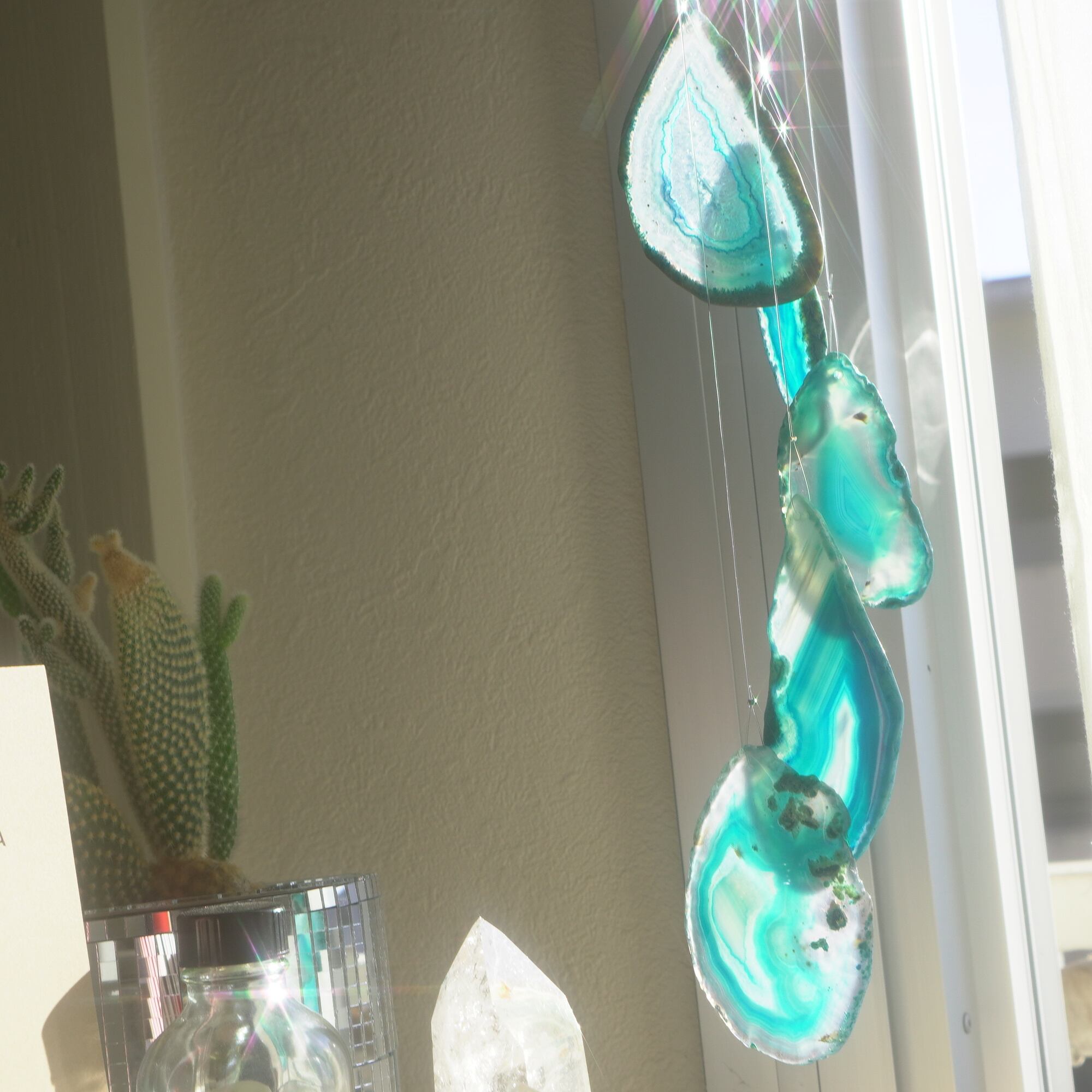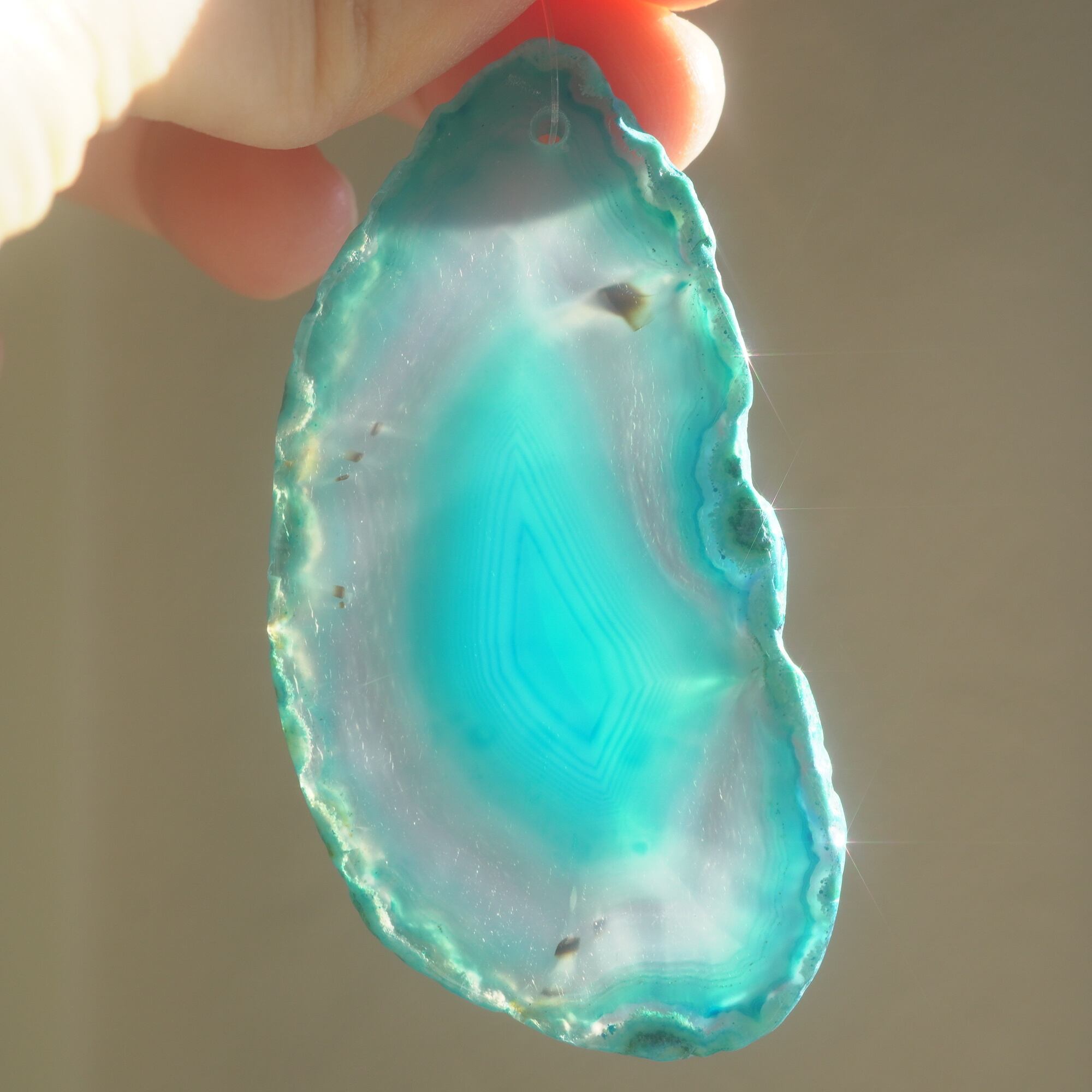 ✧染色の石なので耐光性(光による経年でのカラー変化の耐性)に優れているわけではなくベランダなど一日の中で長時間強い日光に当たるような場所に飾られるのはおすすめしないのですが、陽光に透かした時にだけ真価を発揮する美しさがありますので、是非、時折翳したりして光と一緒にお楽しみいただけたらと思います。特に濃い鮮やかな色など、色変化が気になられる場合は、日光のあまり当たらない場所に飾ってくださいね✧