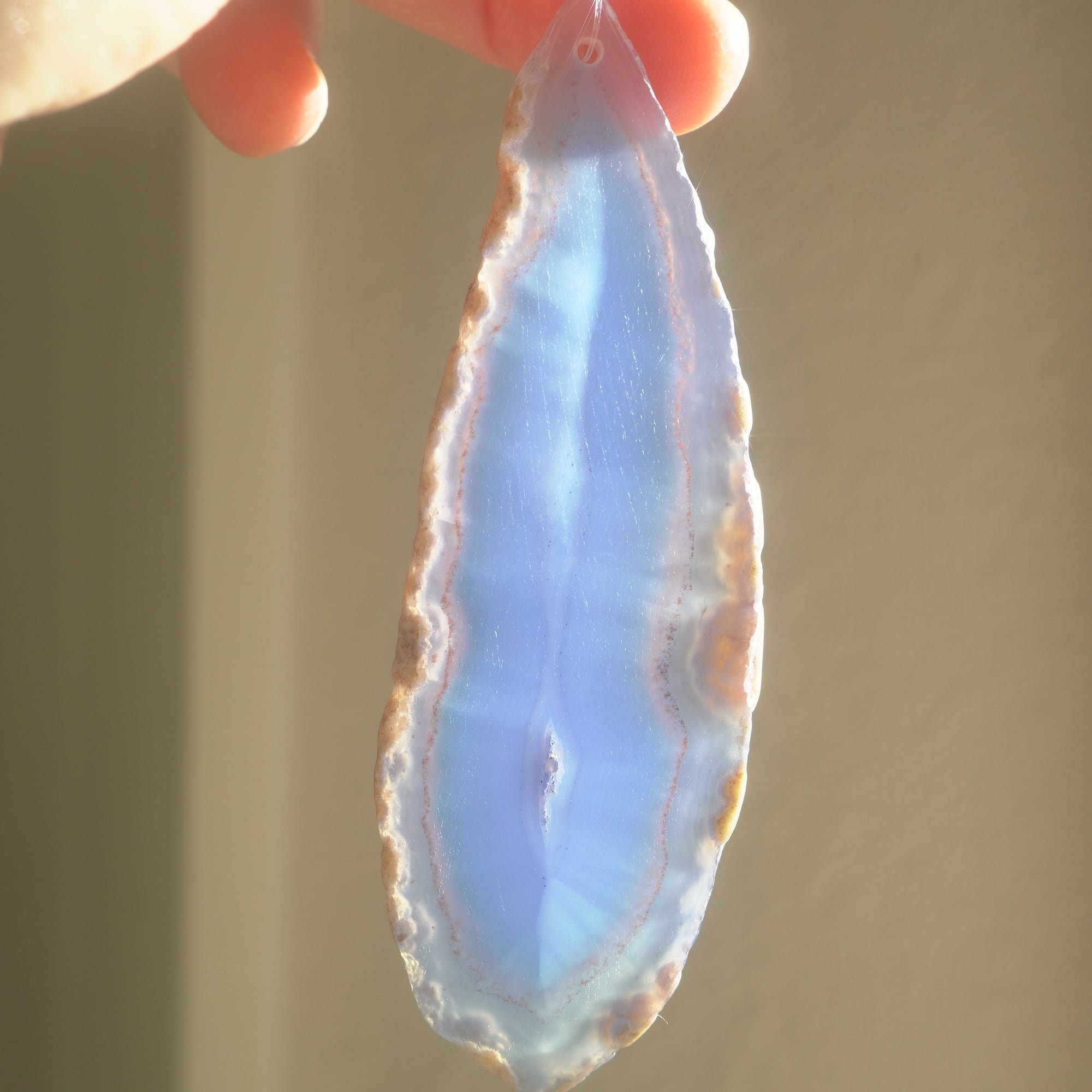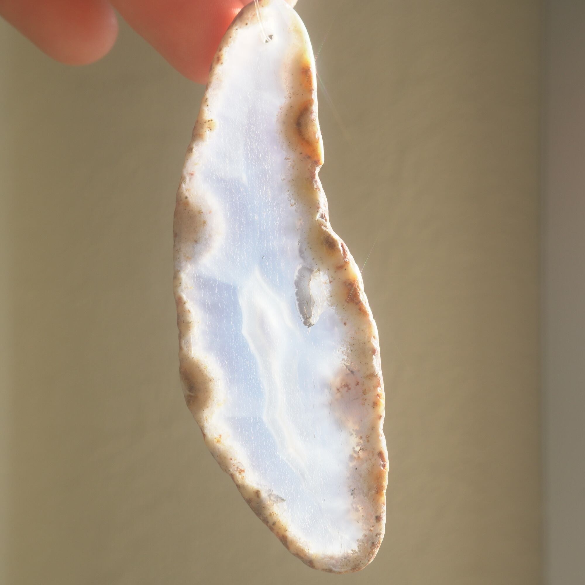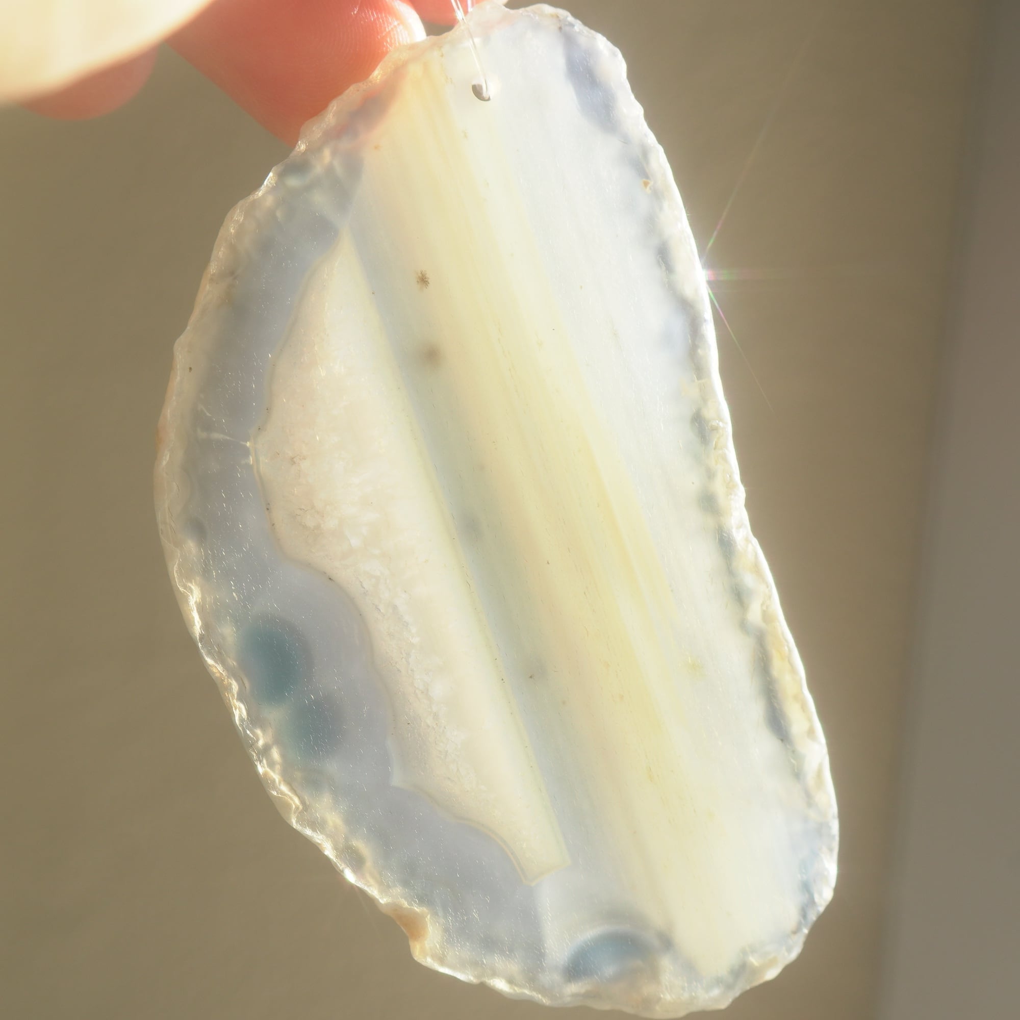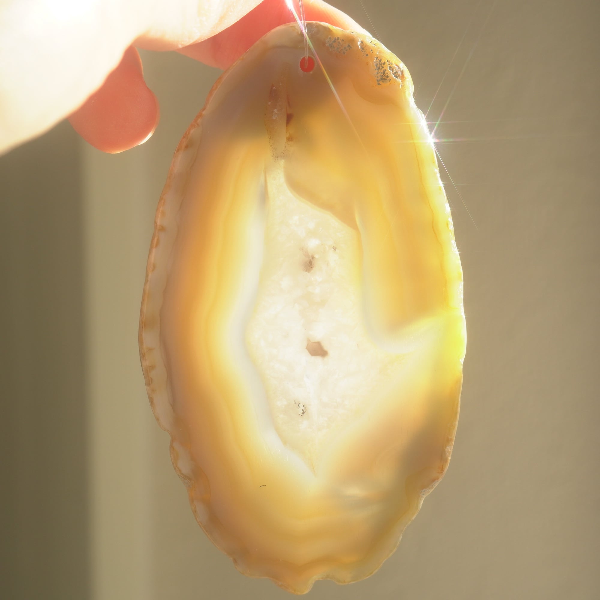 重ねる石同士の側面の加工状態によっても良い音が鳴ったり鳴らなかったり、石の見た目だけで組み合わせを決められないことが難しいポイントでもあるのですが、そんな中、たくさんの石の中から選ばれた5枚のスライスアゲートから出来上がったチャイムたちは、どこか悠々自適に空を泳ぐ妖精のようでもあり、それぞれの音を楽しそうに奏でてくれます。