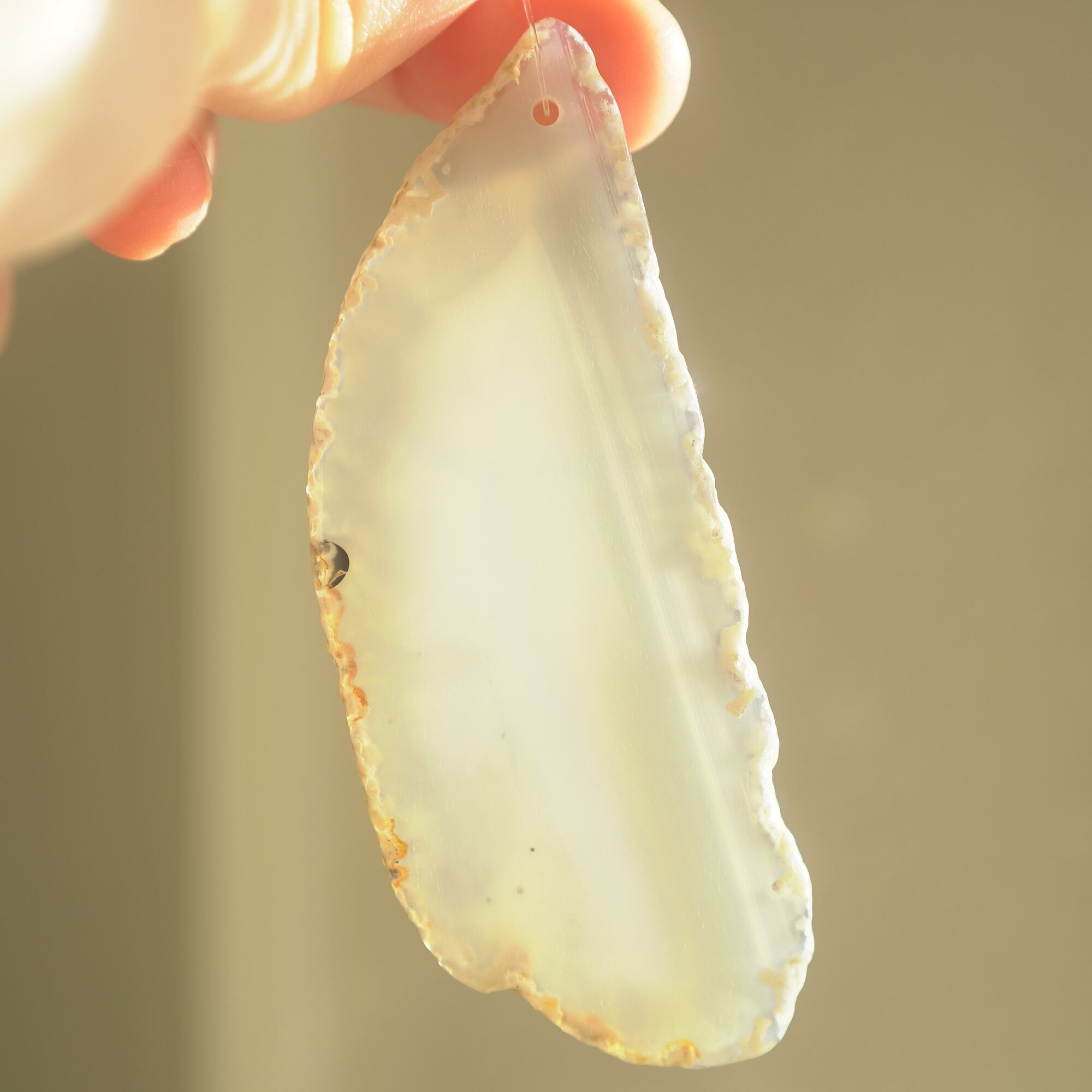 重ねる石同士の側面の加工状態によっても良い音が鳴ったり鳴らなかったり、石の見た目だけで組み合わせを決められないことが難しいポイントでもあるのですが、そんな中、たくさんの石の中から選ばれた5枚のスライスアゲートから出来上がったチャイムたちは、どこか悠々自適に空を泳ぐ妖精のようでもあり、それぞれの音を楽しそうに奏でてくれます。